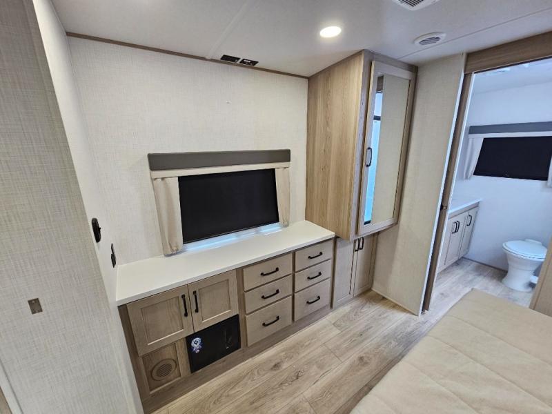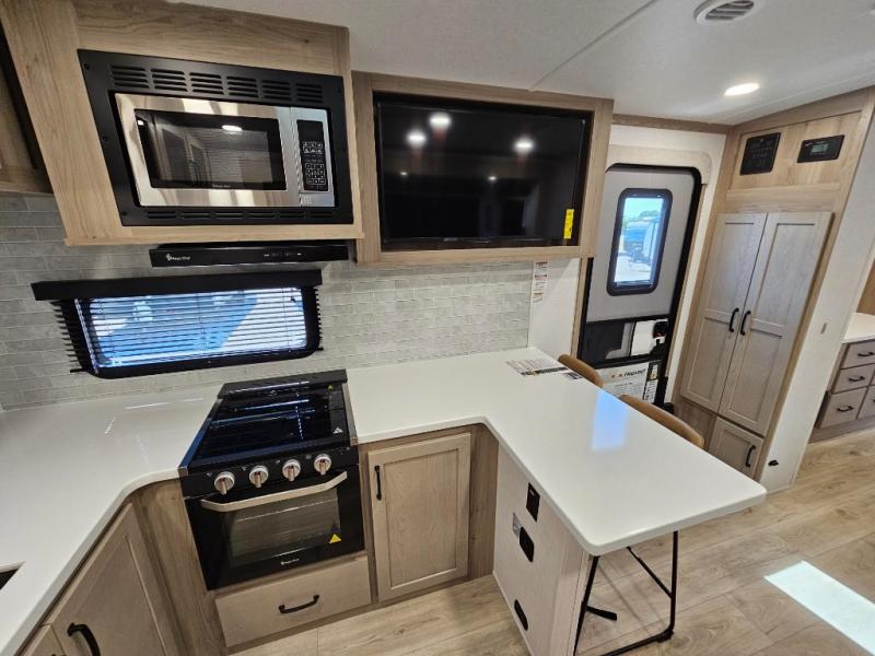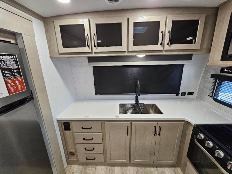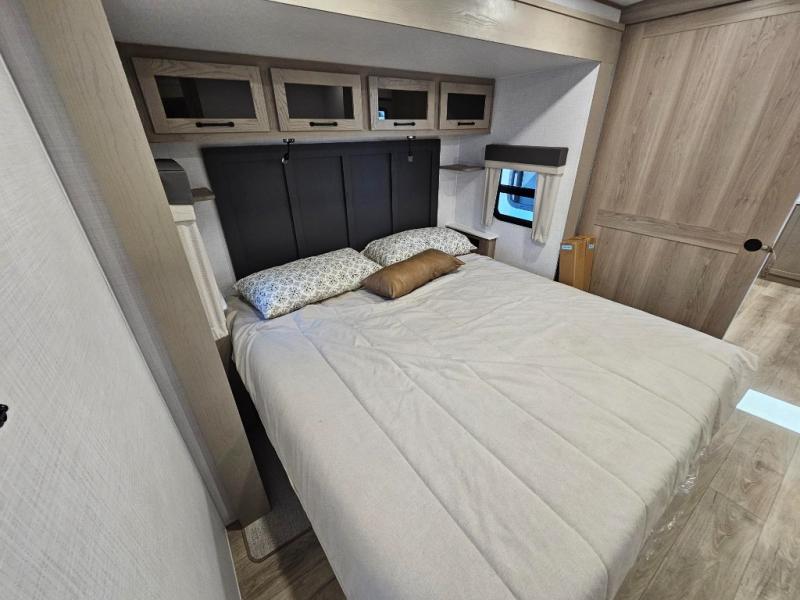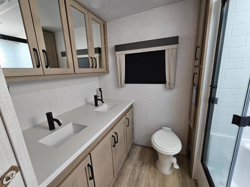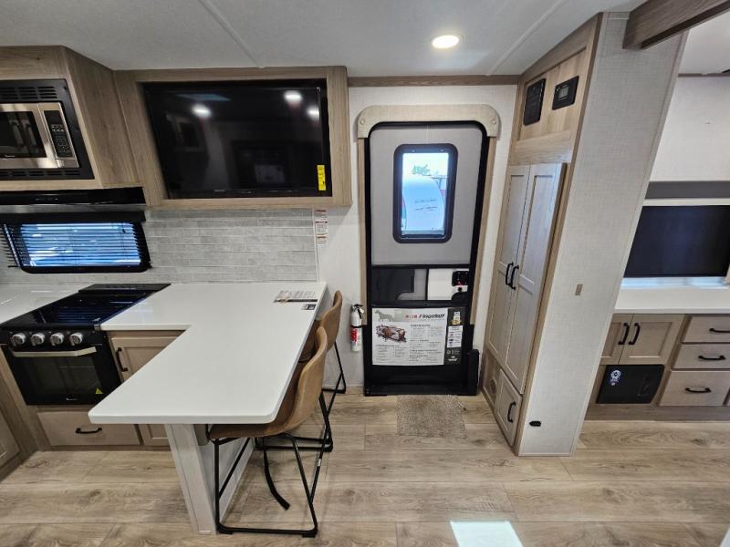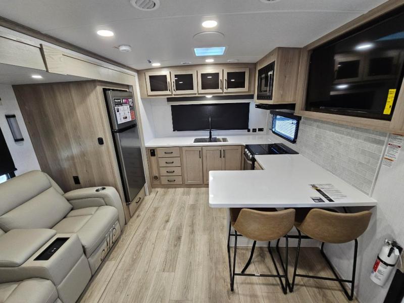 You will love how open this travel trailer will feel with the large front window that you can look out from the two-person bar top seating! The front kitchen has plenty of countertop space for you to prepare your best meals. Your nights will be spent in true relaxation with a 67" theater seating and king bed slide in the bedroom for a great night's rest. The full rear bathroom has a shower with a seat to take a nice, hot shower before bed, and a dual-sink vanity for two to get ready at once in the mornings!