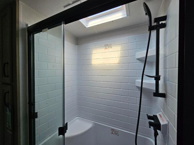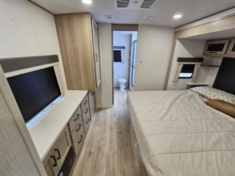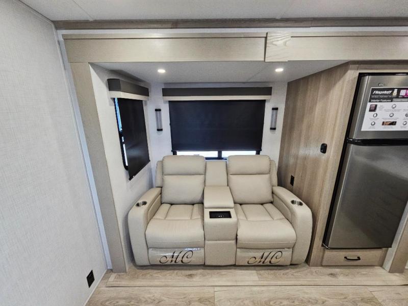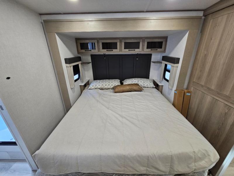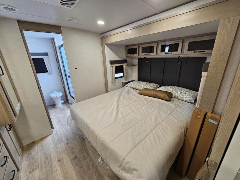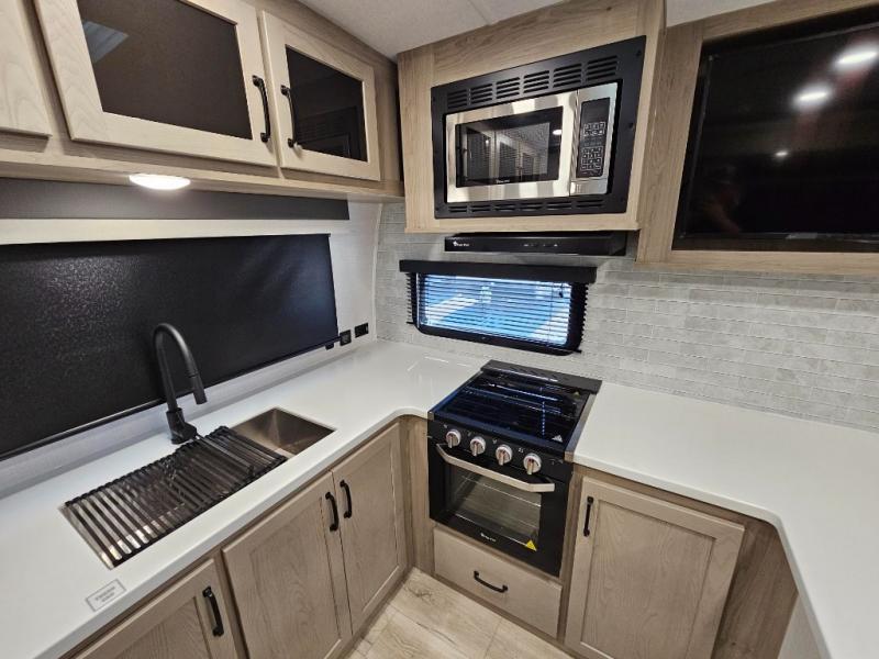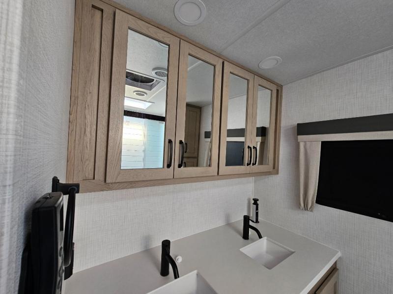 You will love how open this travel trailer will feel with the large front window that you can look out from the two-person bar top seating! The front kitchen has plenty of countertop space for you to prepare your best meals. Your nights will be spent in true relaxation with a 67" theater seating and king bed slide in the bedroom for a great night's rest. The full rear bathroom has a shower with a seat to take a nice, hot shower before bed, and a dual-sink vanity for two to get ready at once in the mornings!