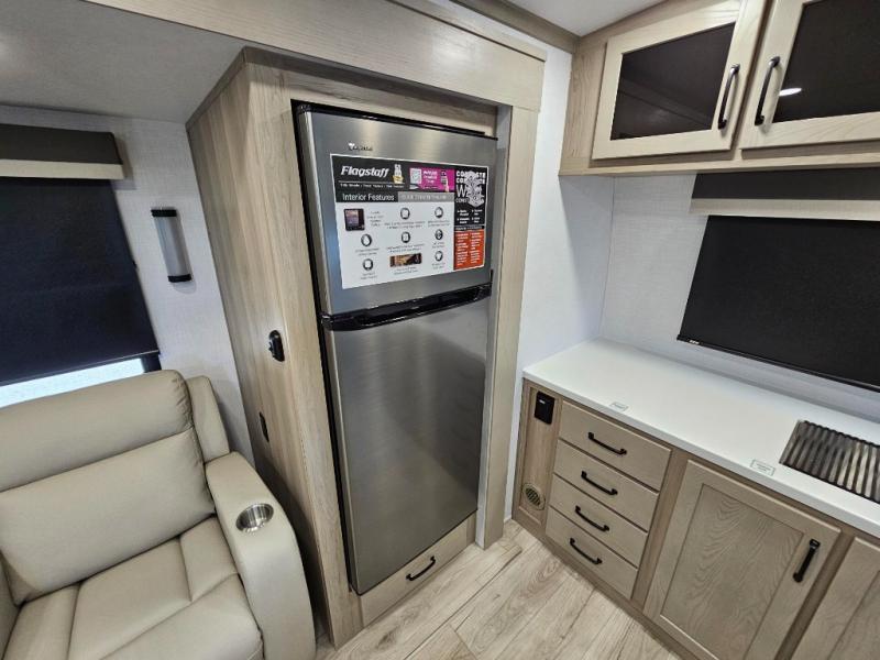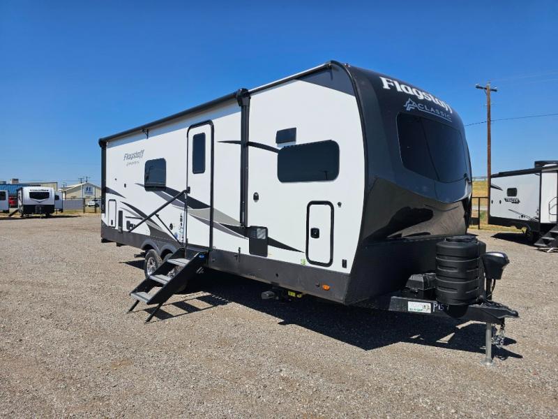 Each one of these Forest River Flagstaff Classic fifth wheels or travel trailers will be your home on wheels! Their quality craftsmanship and attention to detail shines through the surface-coated steel I-beam frame on fifth wheels, the enclosed underbelly, the radius roof with vaulted interior ceilings, and six-sided fully aluminum-framed floor, walls, and roof. Towing your unit will be easy with the torsion axle, Rubber-Ryde suspension, and nitrogen-filled Goodyear Endurance tires. You will even reduce your use of water with the Showermiser water saving system in the bathroom. A few other convenient features you will enjoy include a control panel with WeRV app control, a designer headboard and bedding, and an outside shower with hot and cold water. Come choose your favorite one today!