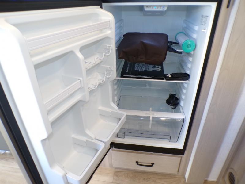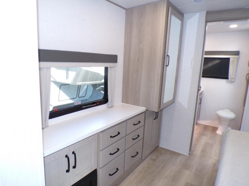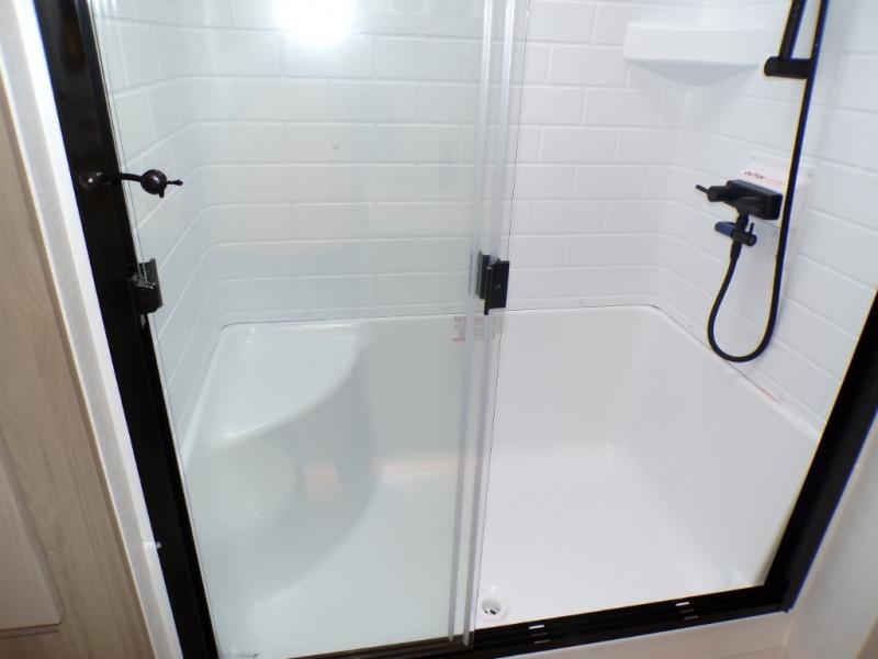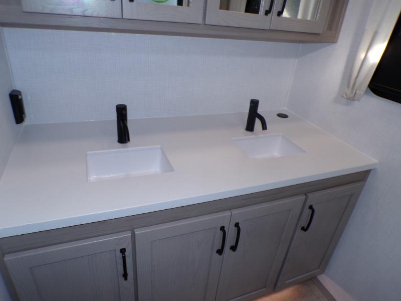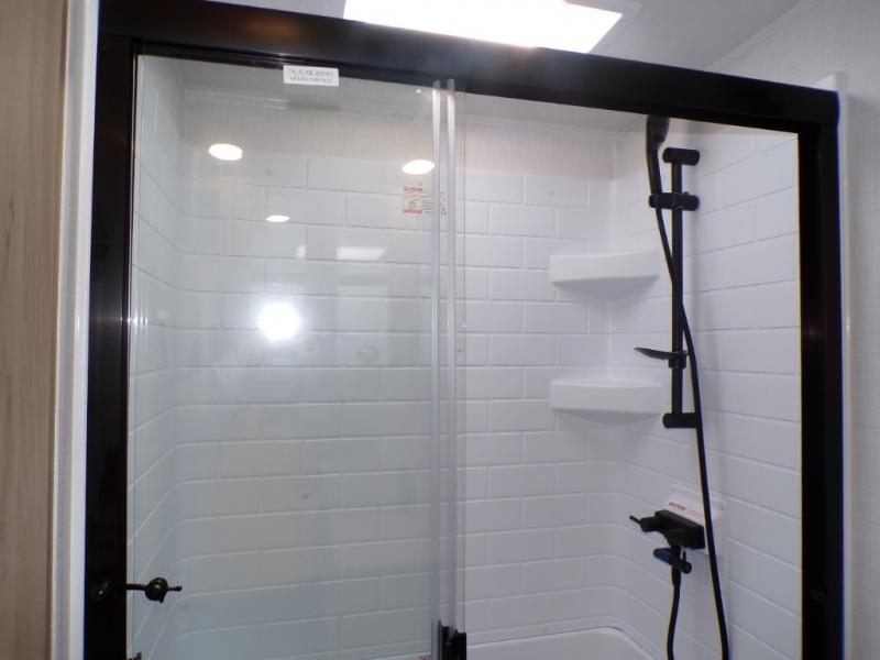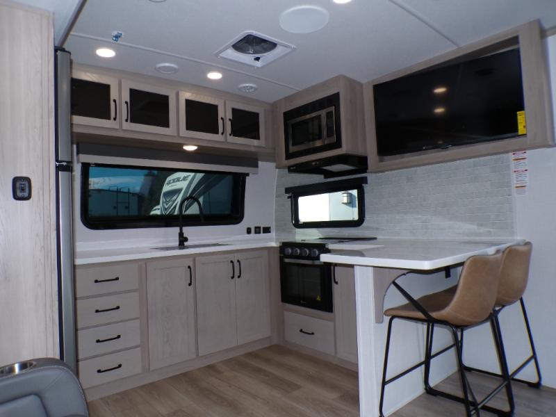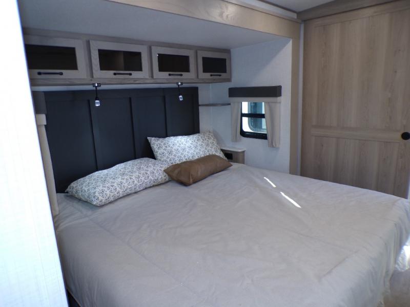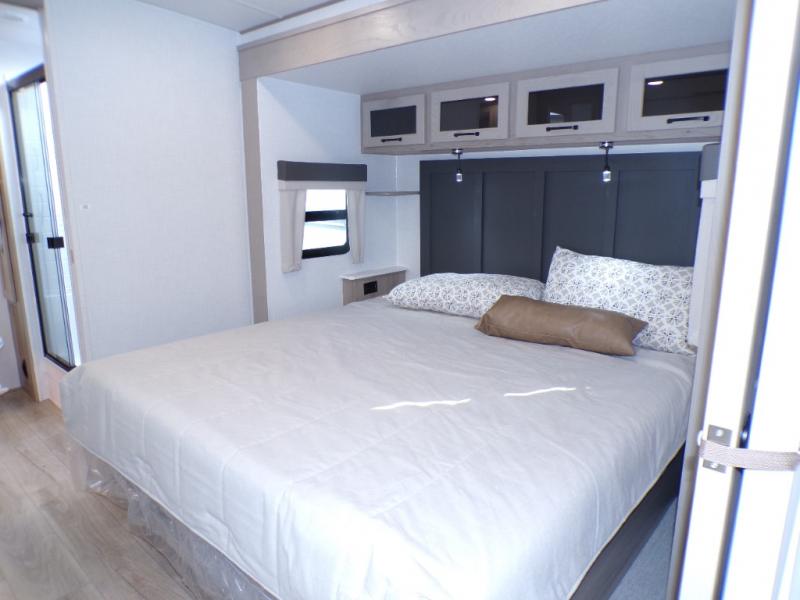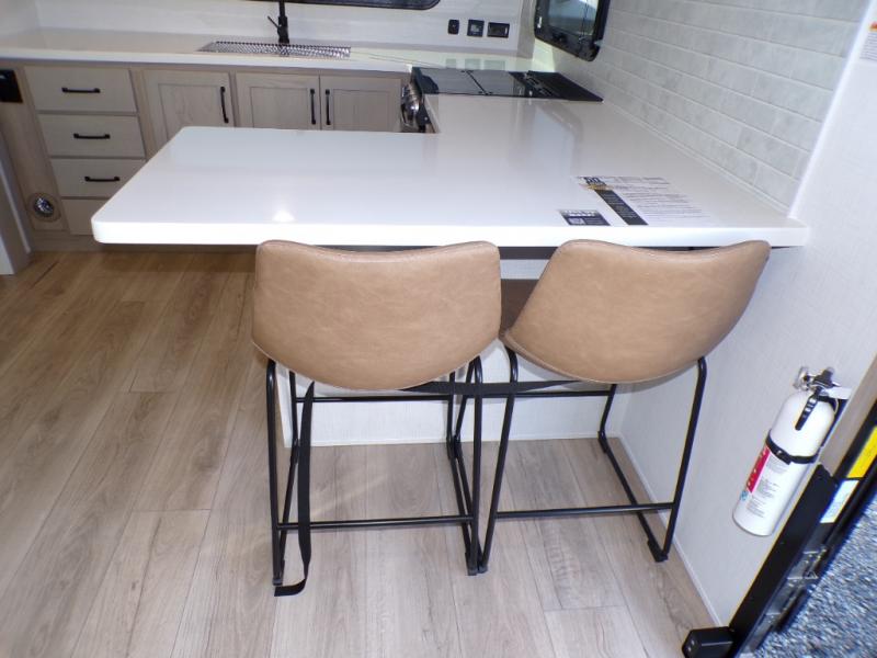 You will love how open this travel trailer will feel with the large front window that you can look out from the two-person bar top seating! The front kitchen has plenty of countertop space for you to prepare your best meals. Your nights will be spent in true relaxation with a 67" theater seating and king bed slide in the bedroom for a great night's rest. The full rear bathroom has a shower with a seat to take a nice, hot shower before bed, and a dual-sink vanity for two to get ready at once in the mornings!