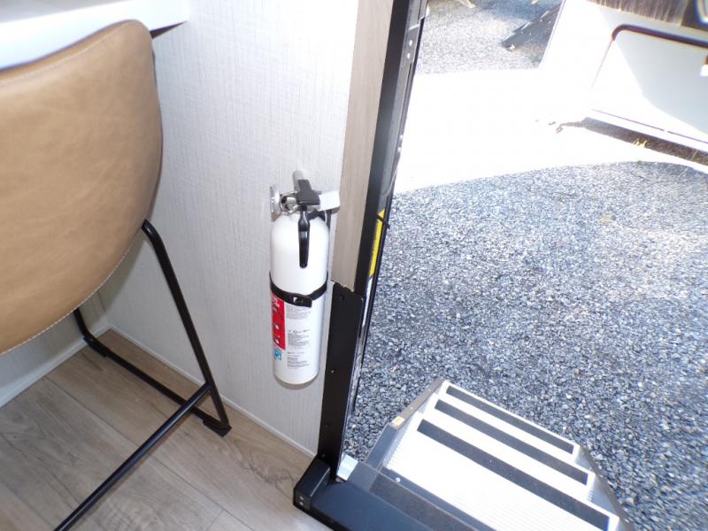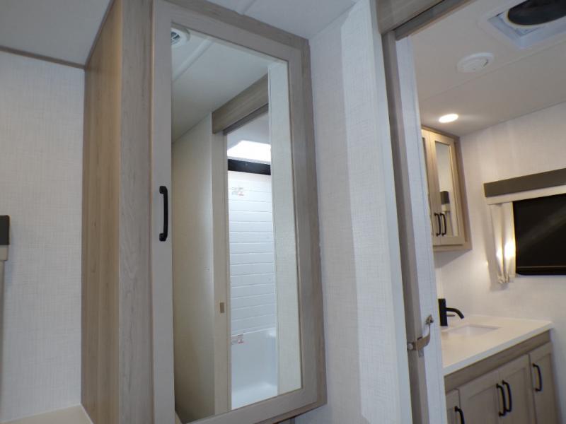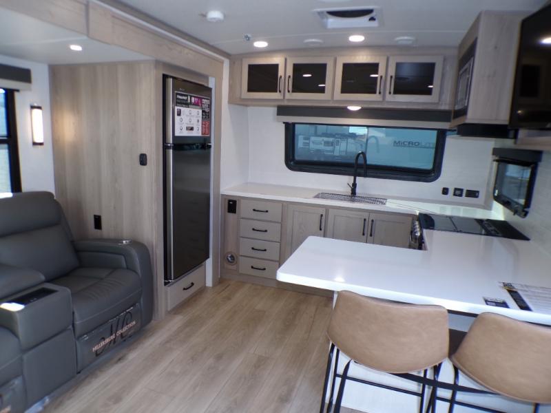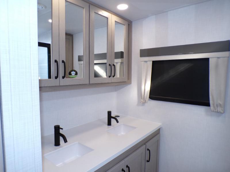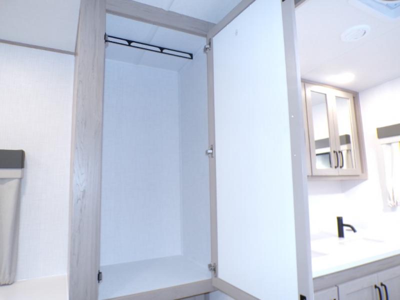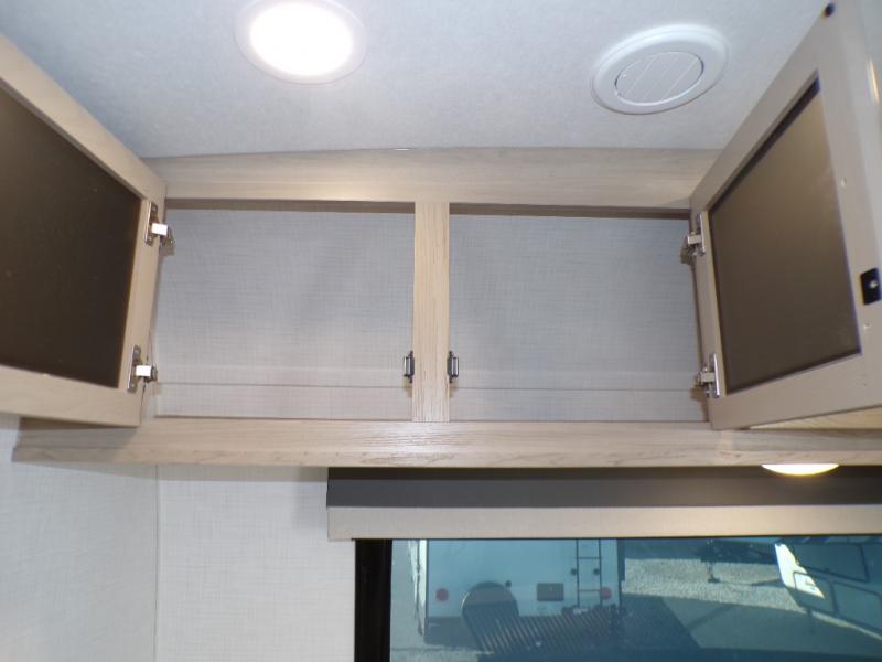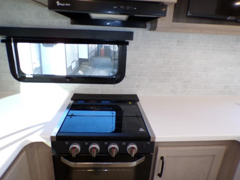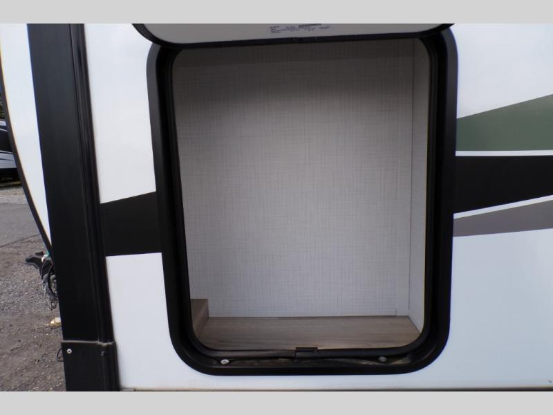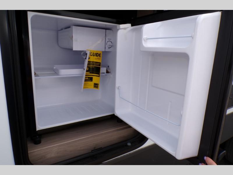 You will love how open this travel trailer will feel with the large front window that you can look out from the two-person bar top seating! The front kitchen has plenty of countertop space for you to prepare your best meals. Your nights will be spent in true relaxation with a 67" theater seating and king bed slide in the bedroom for a great night's rest. The full rear bathroom has a shower with a seat to take a nice, hot shower before bed, and a dual-sink vanity for two to get ready at once in the mornings!