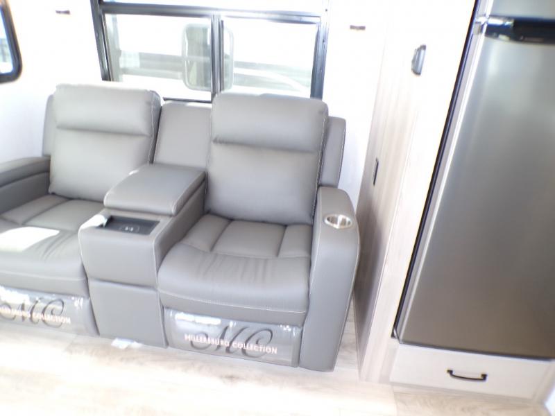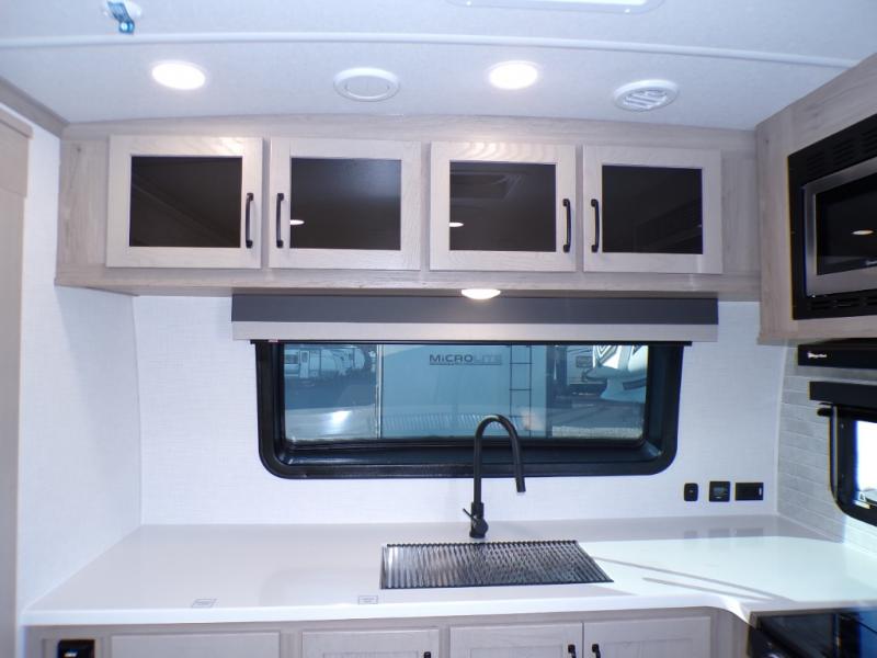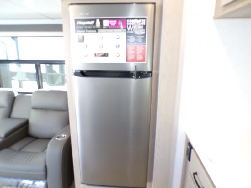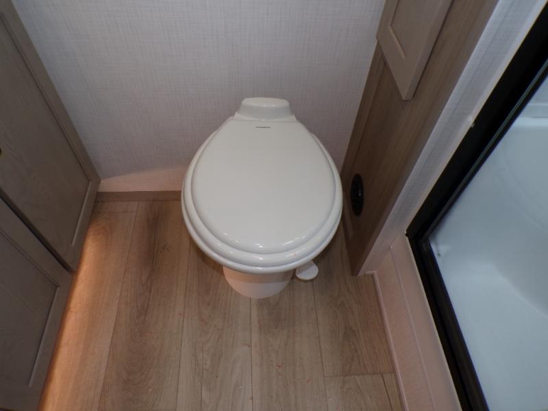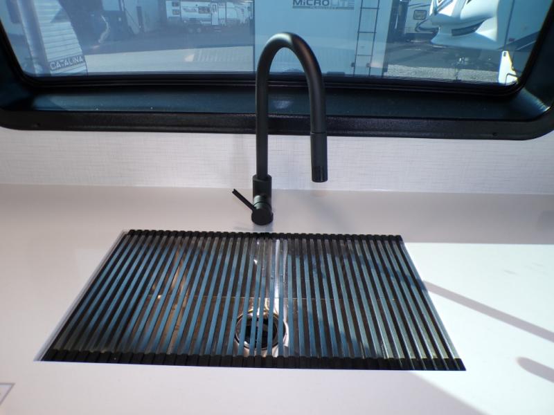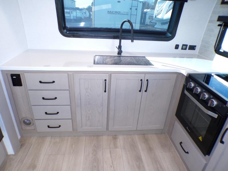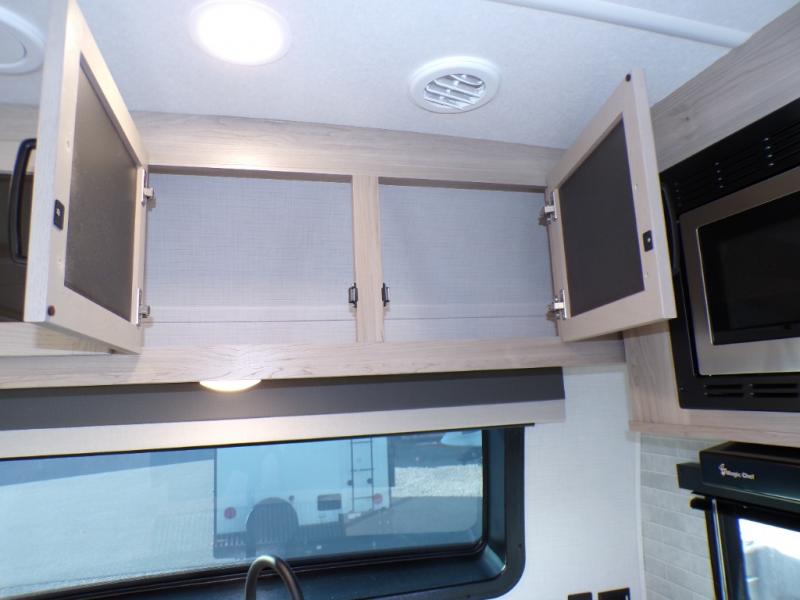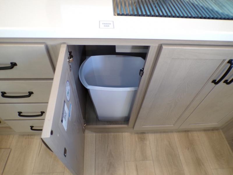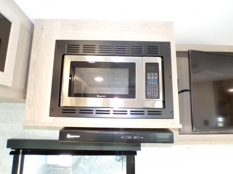 You will love how open this travel trailer will feel with the large front window that you can look out from the two-person bar top seating! The front kitchen has plenty of countertop space for you to prepare your best meals. Your nights will be spent in true relaxation with a 67" theater seating and king bed slide in the bedroom for a great night's rest. The full rear bathroom has a shower with a seat to take a nice, hot shower before bed, and a dual-sink vanity for two to get ready at once in the mornings!