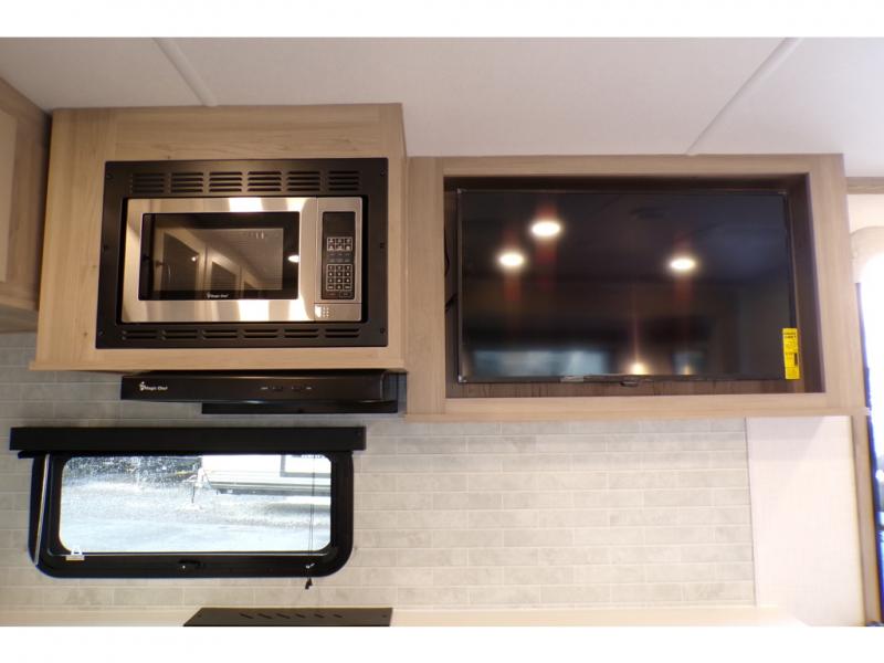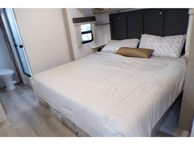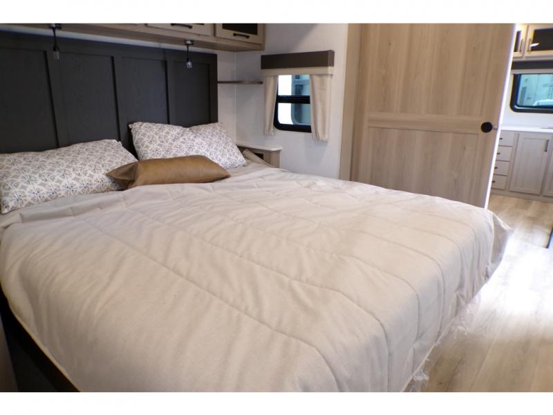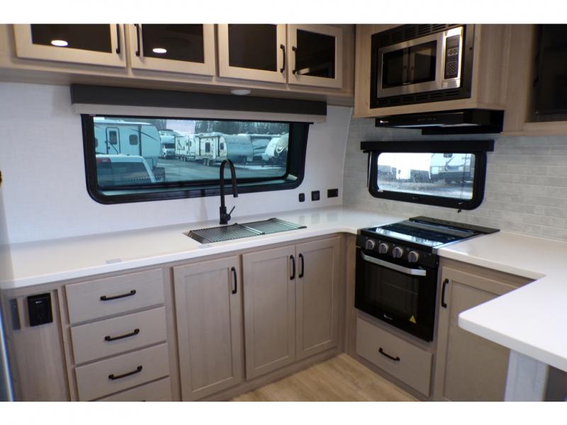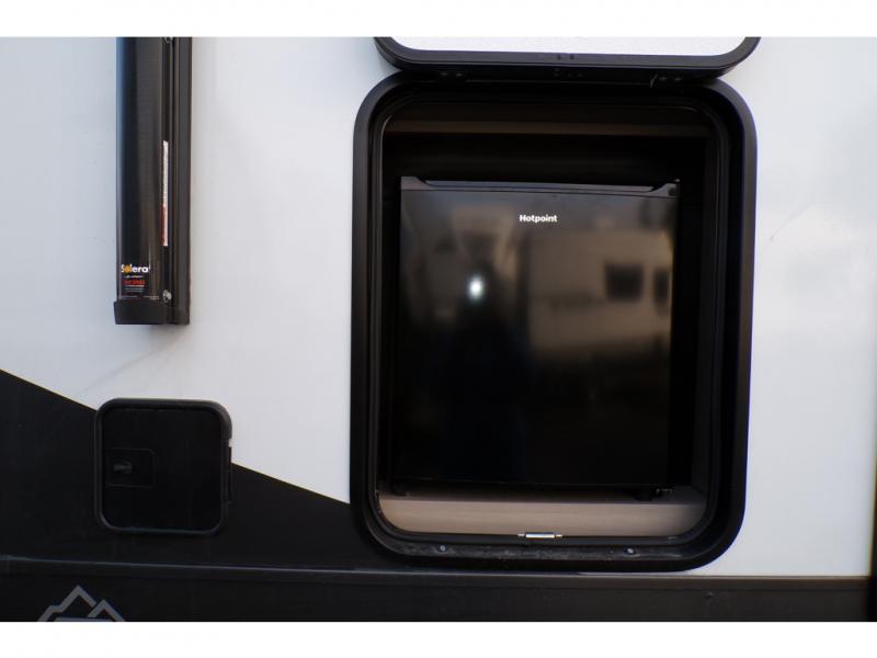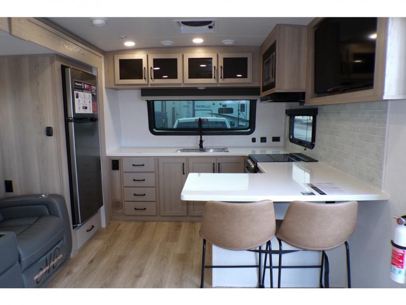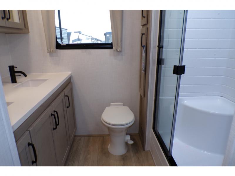 You will love how open this travel trailer will feel with the large front window that you can look out from the two-person bar top seating! The front kitchen has plenty of countertop space for you to prepare your best meals. Your nights will be spent in true relaxation with a 67" theater seating and king bed slide in the bedroom for a great night's rest. The full rear bathroom has a shower with a seat to take a nice, hot shower before bed, and a dual-sink vanity for two to get ready at once in the mornings!