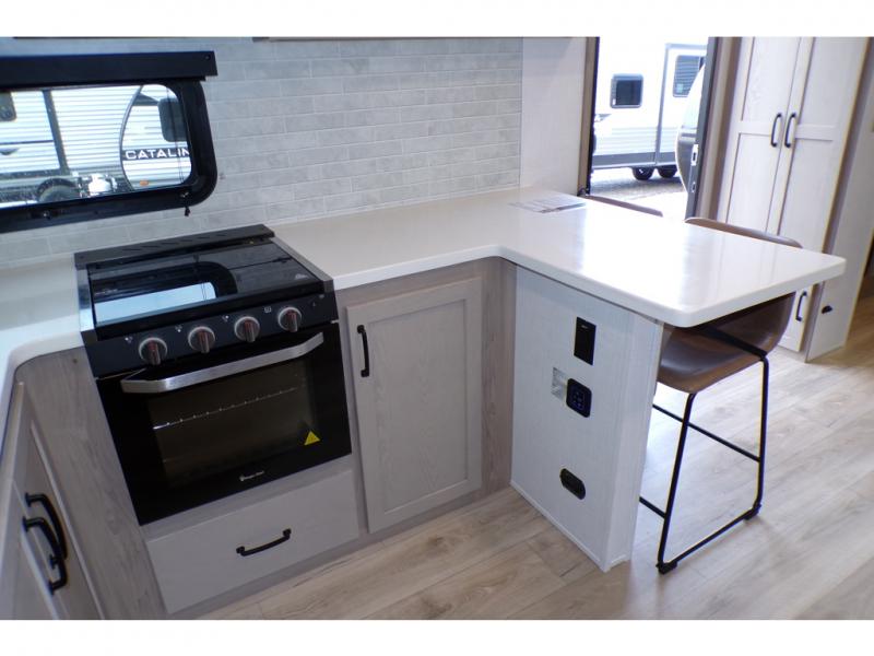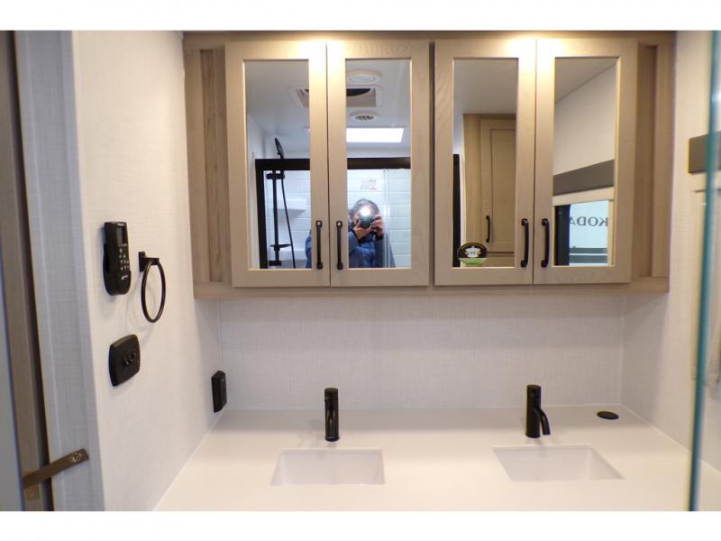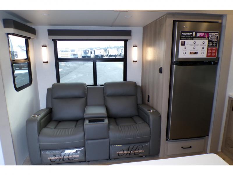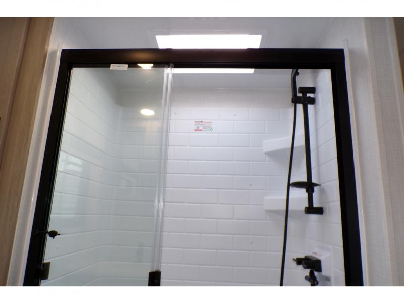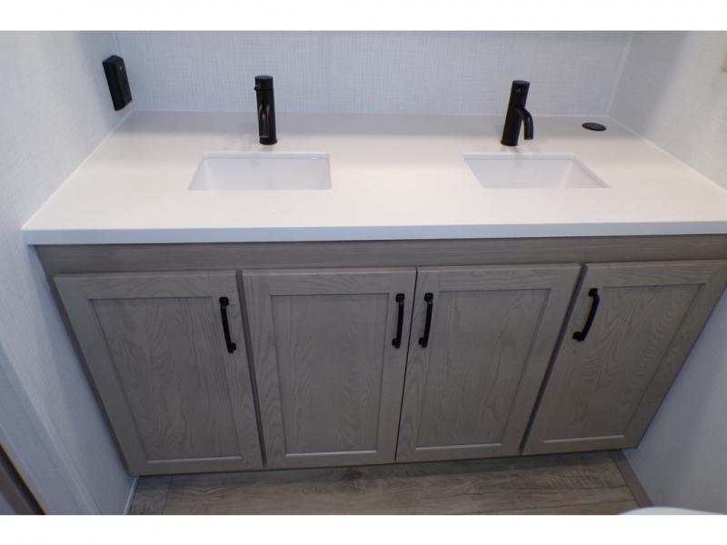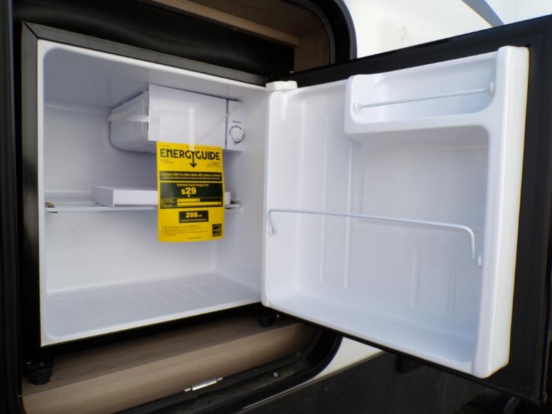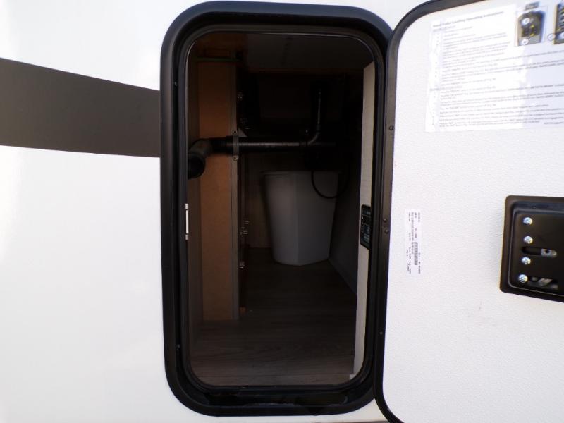 You will love how open this travel trailer will feel with the large front window that you can look out from the two-person bar top seating! The front kitchen has plenty of countertop space for you to prepare your best meals. Your nights will be spent in true relaxation with a 67" theater seating and king bed slide in the bedroom for a great night's rest. The full rear bathroom has a shower with a seat to take a nice, hot shower before bed, and a dual-sink vanity for two to get ready at once in the mornings!
