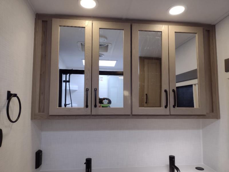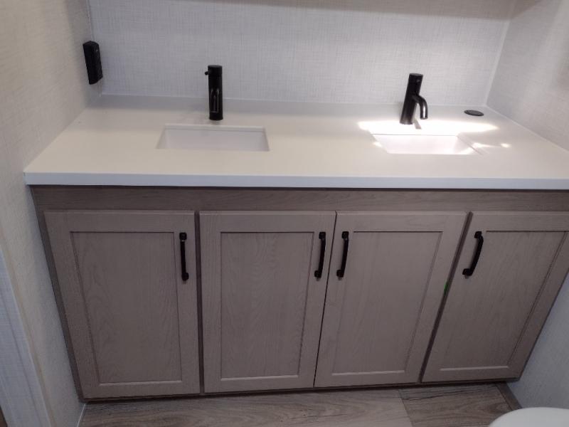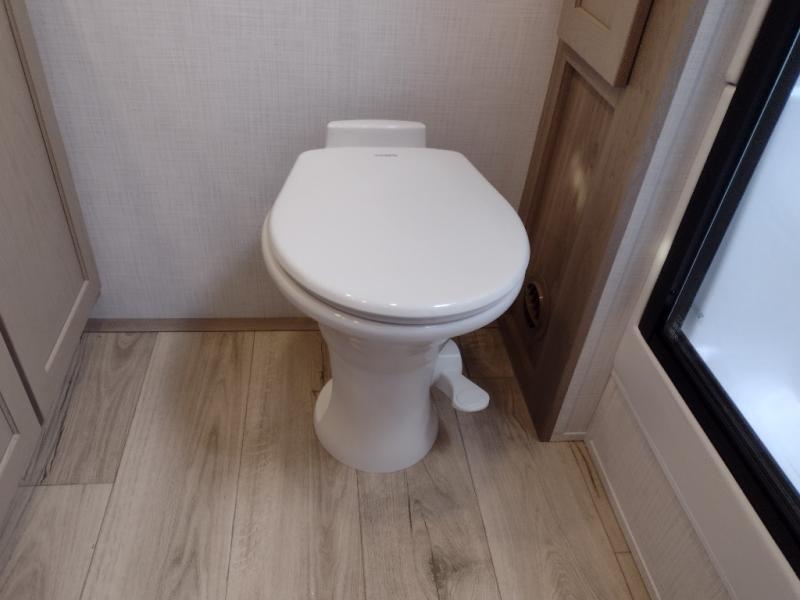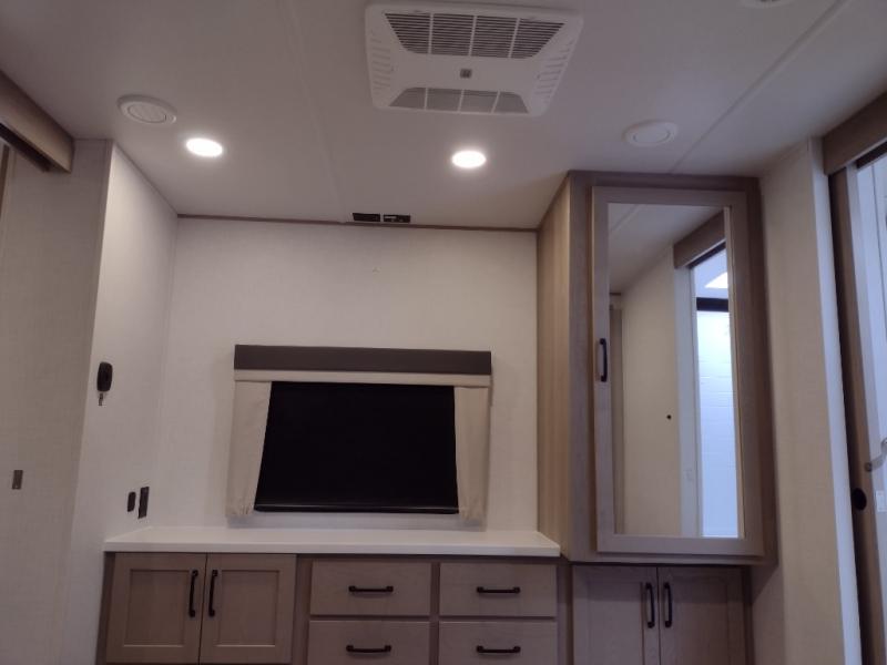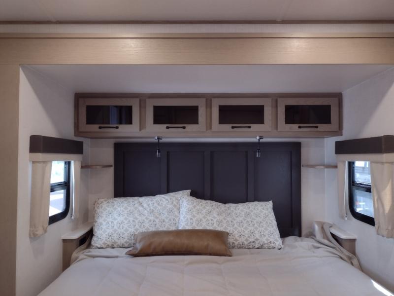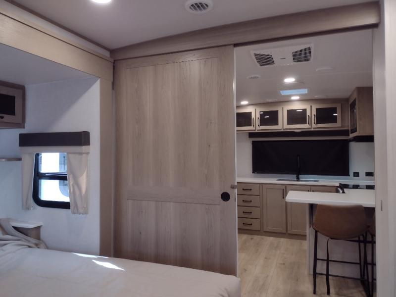 You will love how open this travel trailer will feel with the large front window that you can look out from the two-person bar top seating! The front kitchen has plenty of countertop space for you to prepare your best meals. Your nights will be spent in true relaxation with a 67" theater seating and king bed slide in the bedroom for a great night's rest. The full rear bathroom has a shower with a seat to take a nice, hot shower before bed, and a dual-sink vanity for two to get ready at once in the mornings!