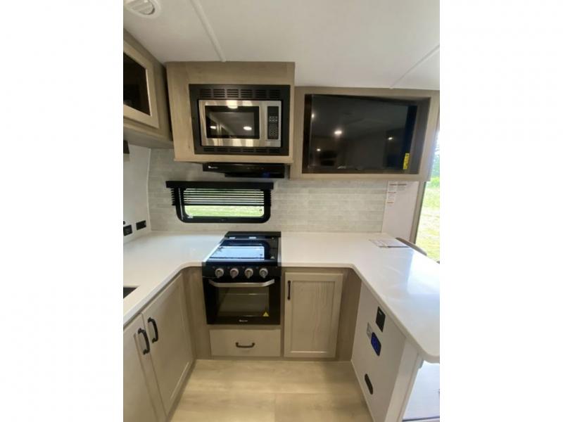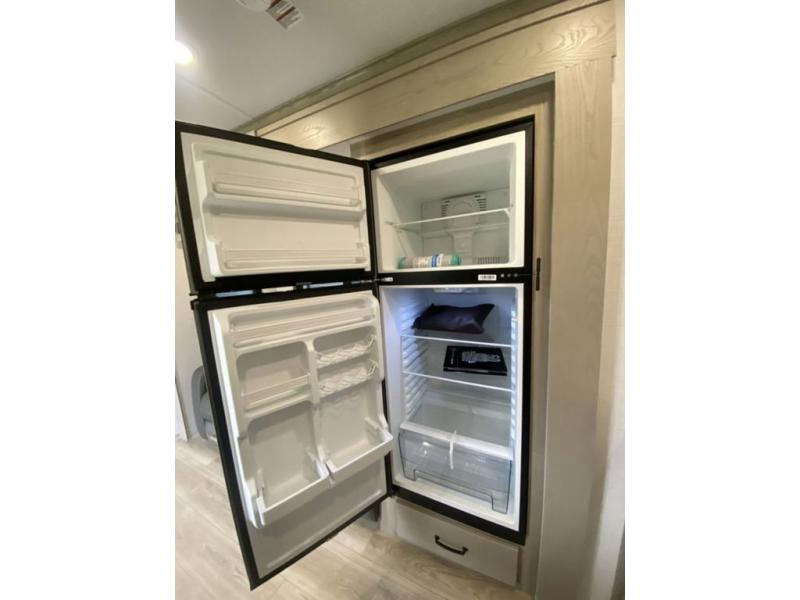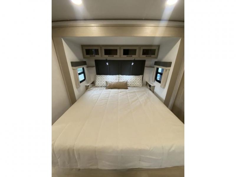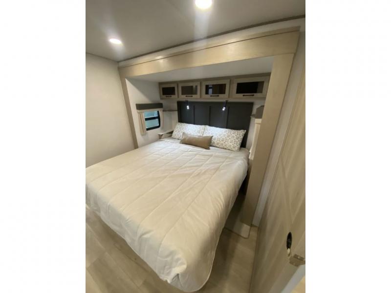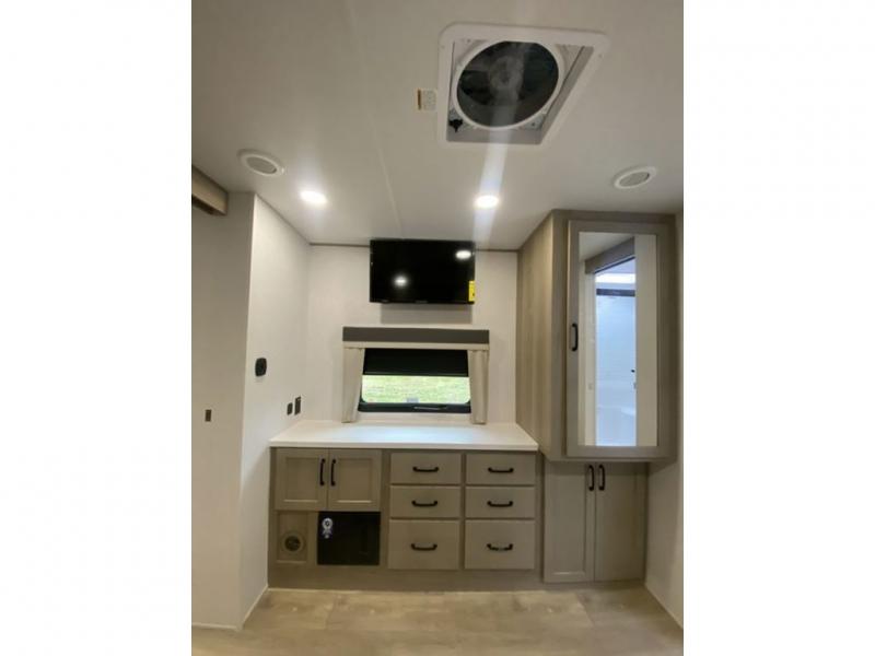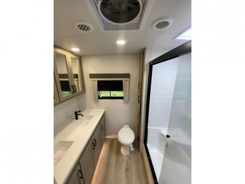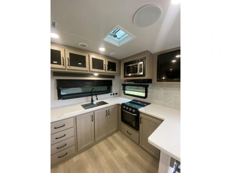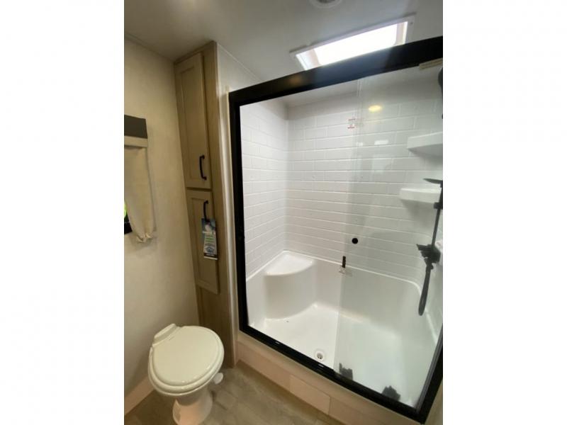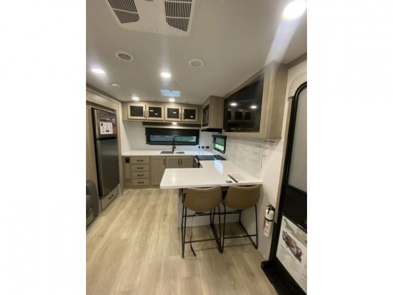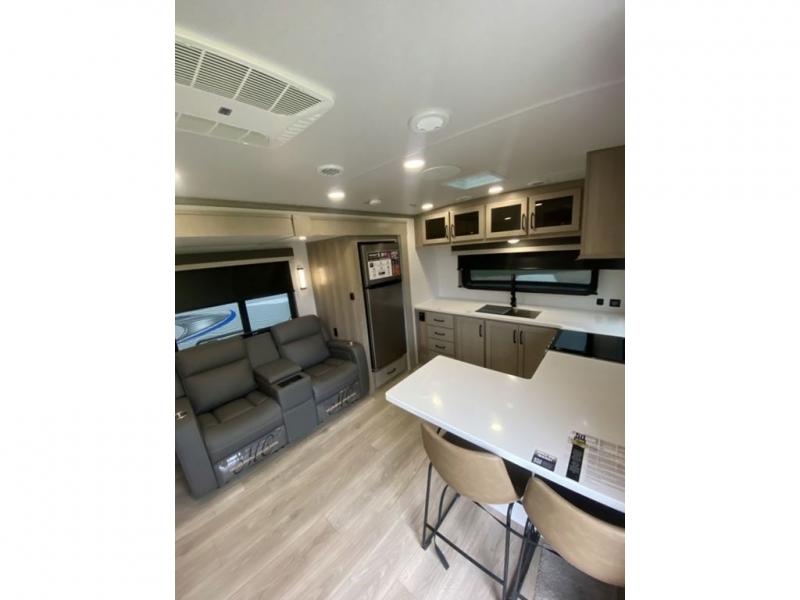 You will love how open this travel trailer will feel with the large front window that you can look out from the two-person bar top seating! The front kitchen has plenty of countertop space for you to prepare your best meals. Your nights will be spent in true relaxation with a 67" theater seating and king bed slide in the bedroom for a great night's rest. The full rear bathroom has a shower with a seat to take a nice, hot shower before bed, and a dual-sink vanity for two to get ready at once in the mornings!