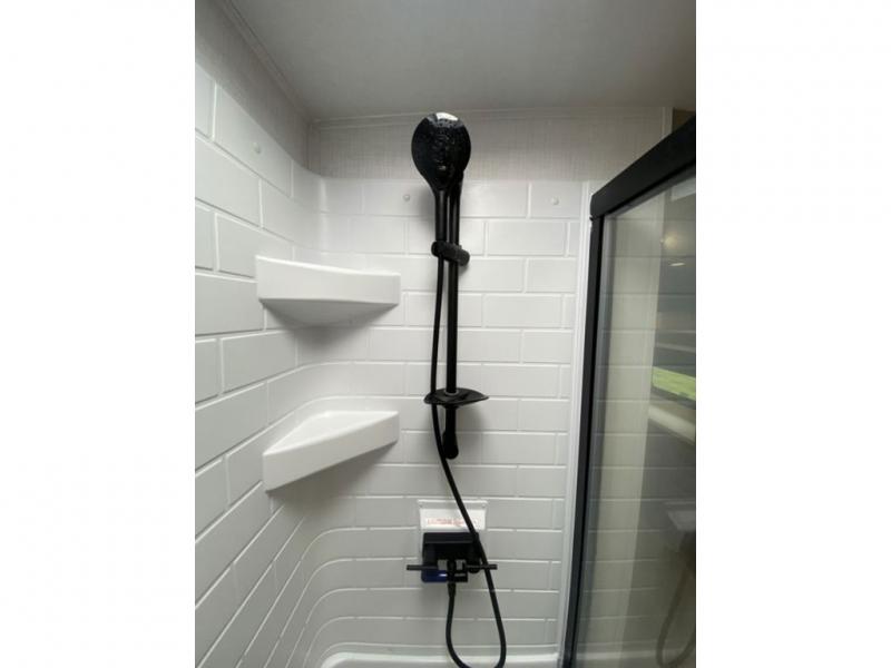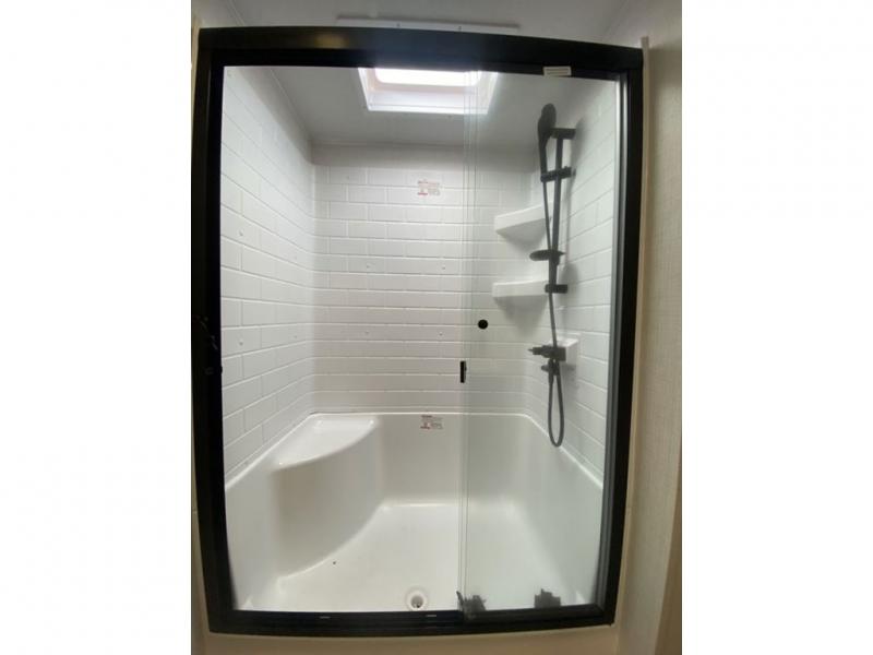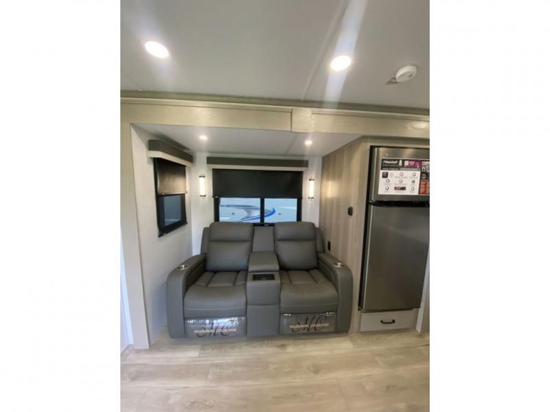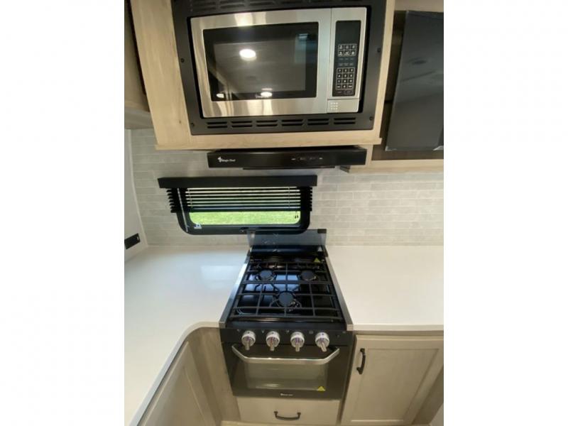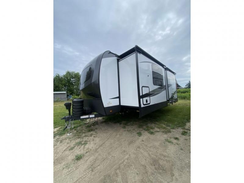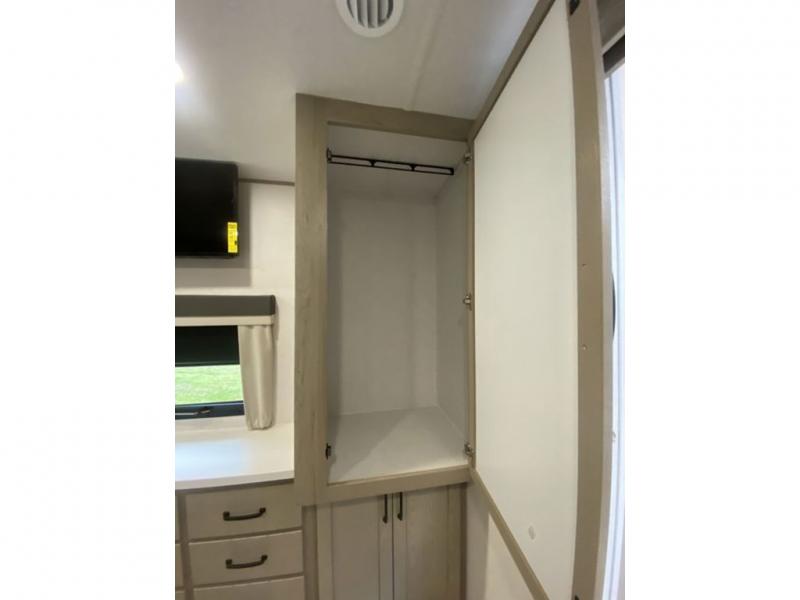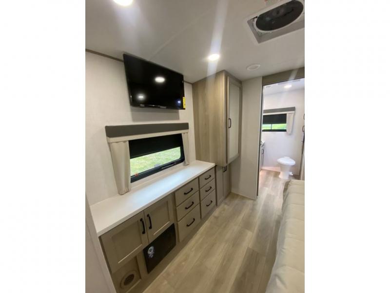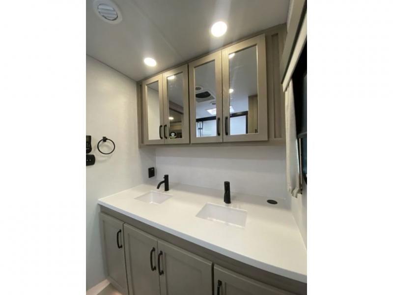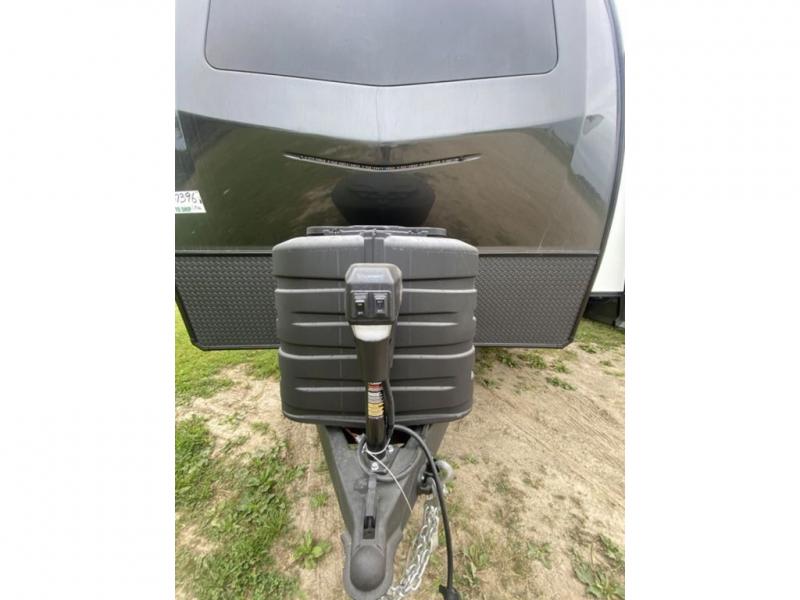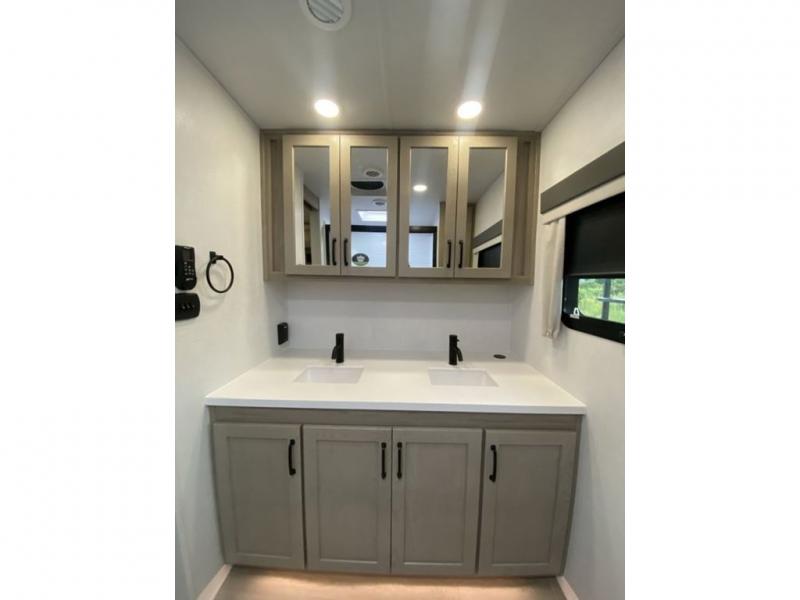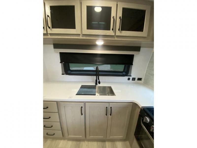 You will love how open this travel trailer will feel with the large front window that you can look out from the two-person bar top seating! The front kitchen has plenty of countertop space for you to prepare your best meals. Your nights will be spent in true relaxation with a 67" theater seating and king bed slide in the bedroom for a great night's rest. The full rear bathroom has a shower with a seat to take a nice, hot shower before bed, and a dual-sink vanity for two to get ready at once in the mornings!