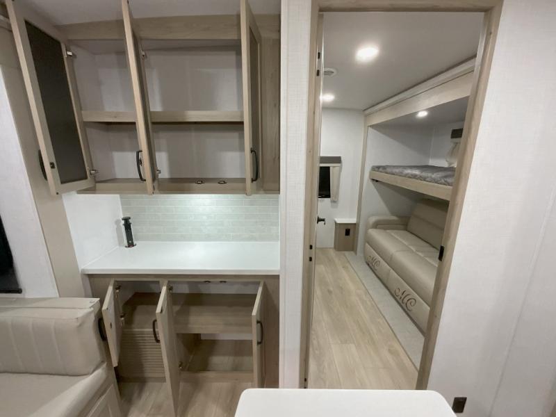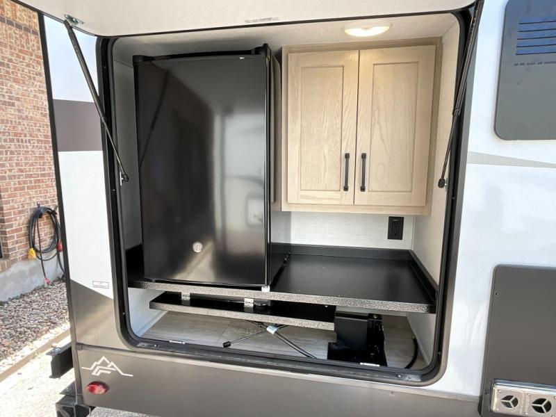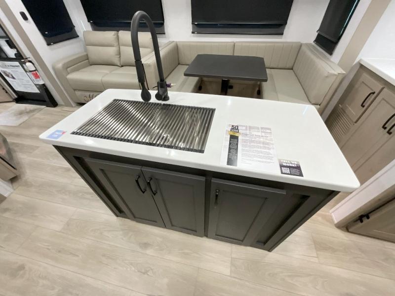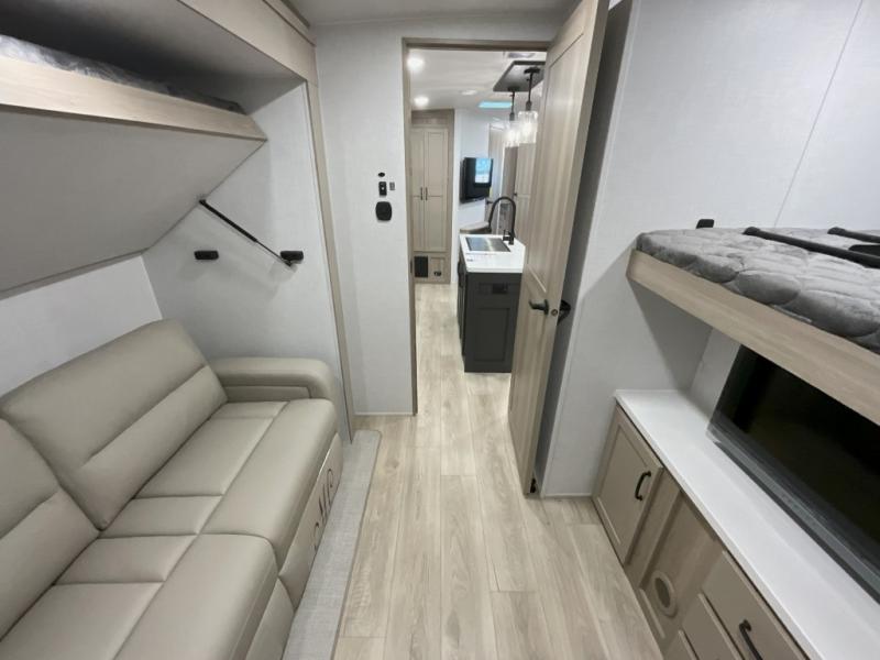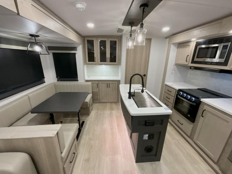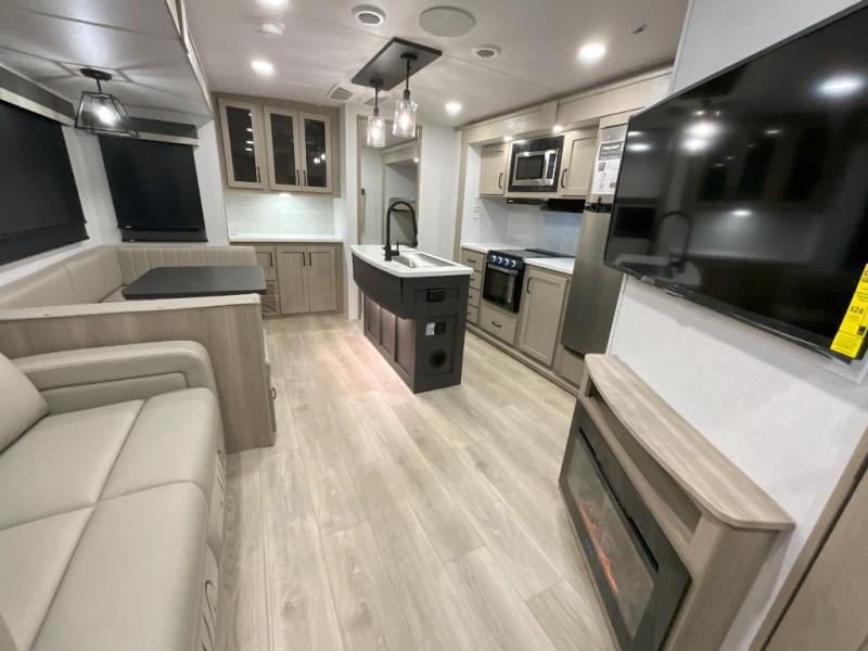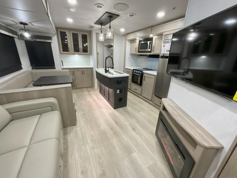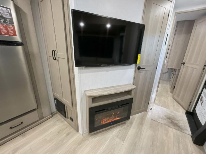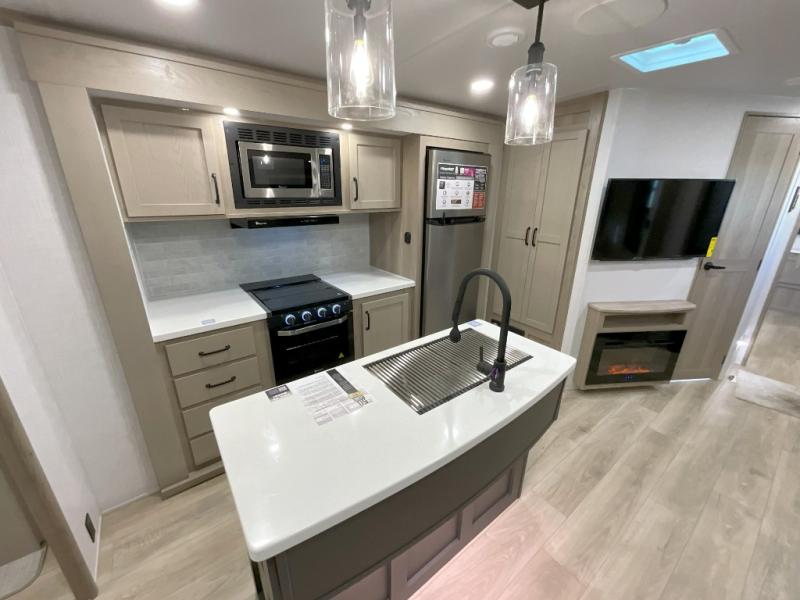 The whole family will love camping in this travel trailer! The kids have their own privacy within the rear bunkhouse that features a 42" x 72" upper bunk with a TV option below it along the curbside, and a 72" x 32" flip-up bunk with a 67" hide-a-bed sofa below it along the roadside. After you have prepared a delicious home-cooked meal with the three-burner cooktop and kitchen island, you can head to the 44" x 81" U-shaped dinette where everyone can gather around. You could even prepare dinner at the outside kitchen, set up a table and chairs, and eat underneath the 11' power awning. The 60" hide-a-bed sofa is the perfect place to sit while enjoying the fireplace or watching your favorite movie on the LED TV. A dual-entry bathroom makes it easy for everyone to access especially those staying in the front private bedroom!