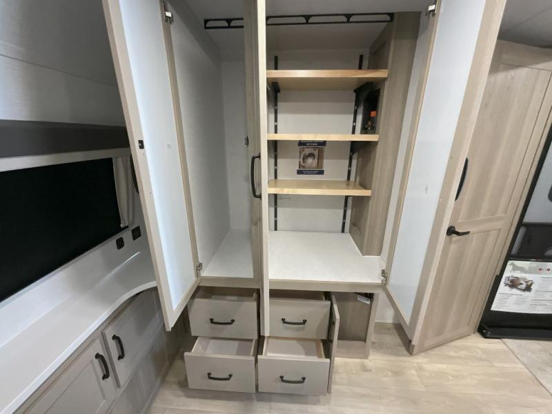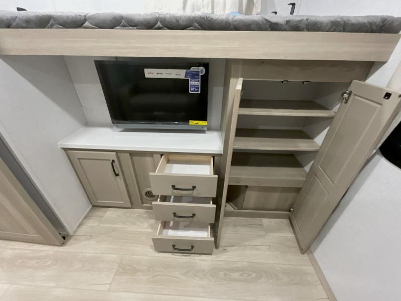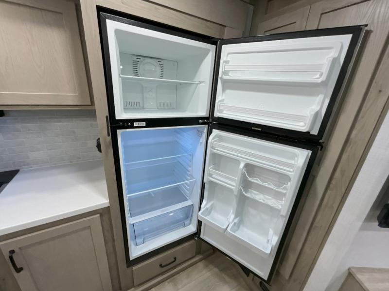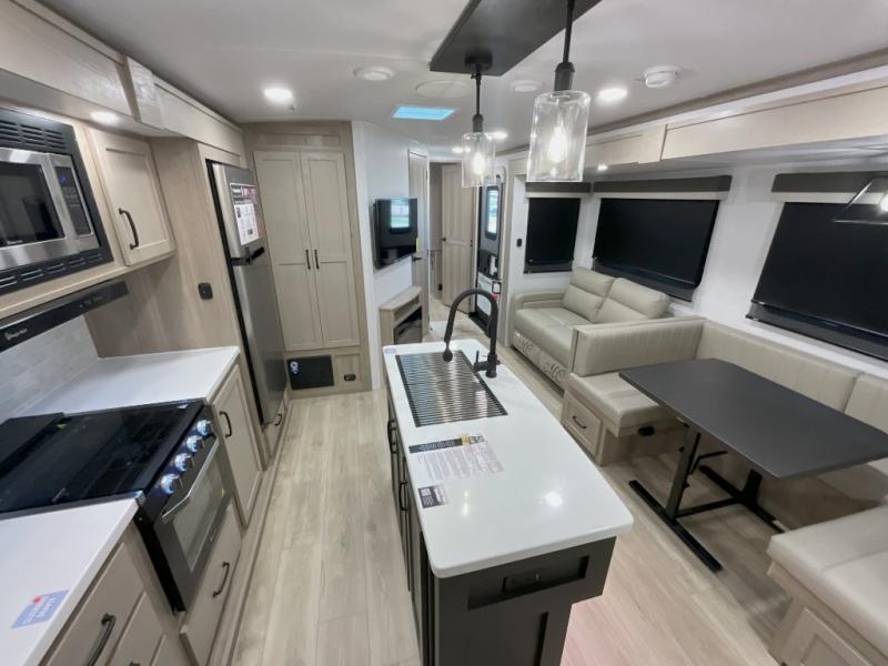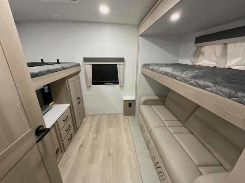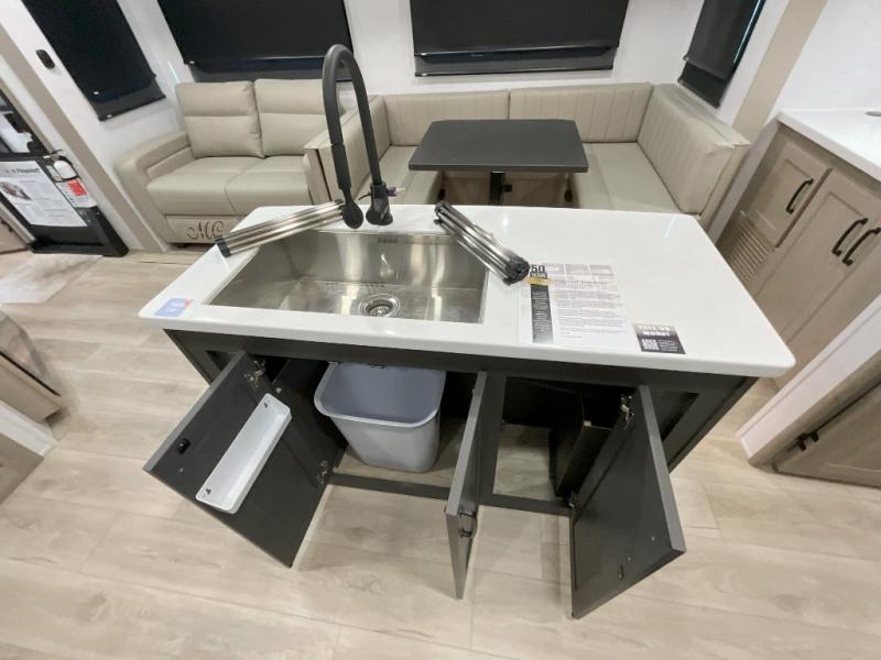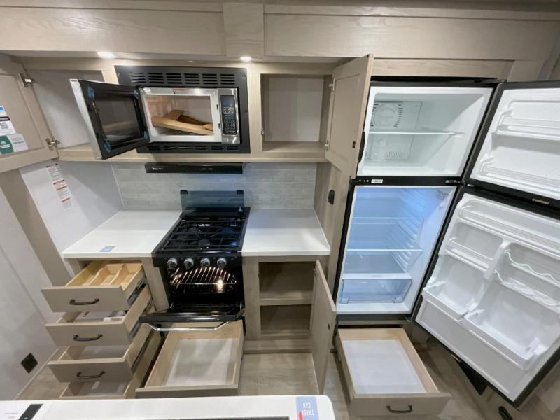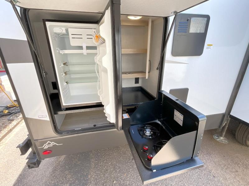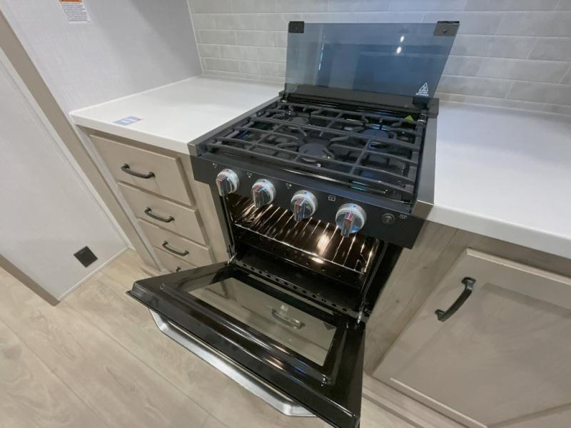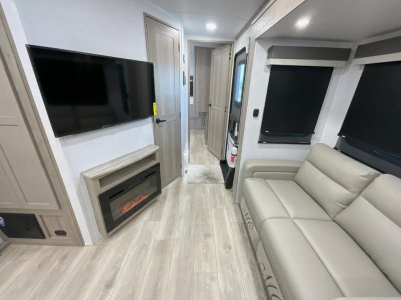 The whole family will love camping in this travel trailer! The kids have their own privacy within the rear bunkhouse that features a 42" x 72" upper bunk with a TV option below it along the curbside, and a 72" x 32" flip-up bunk with a 67" hide-a-bed sofa below it along the roadside. After you have prepared a delicious home-cooked meal with the three-burner cooktop and kitchen island, you can head to the 44" x 81" U-shaped dinette where everyone can gather around. You could even prepare dinner at the outside kitchen, set up a table and chairs, and eat underneath the 11' power awning. The 60" hide-a-bed sofa is the perfect place to sit while enjoying the fireplace or watching your favorite movie on the LED TV. A dual-entry bathroom makes it easy for everyone to access especially those staying in the front private bedroom!
