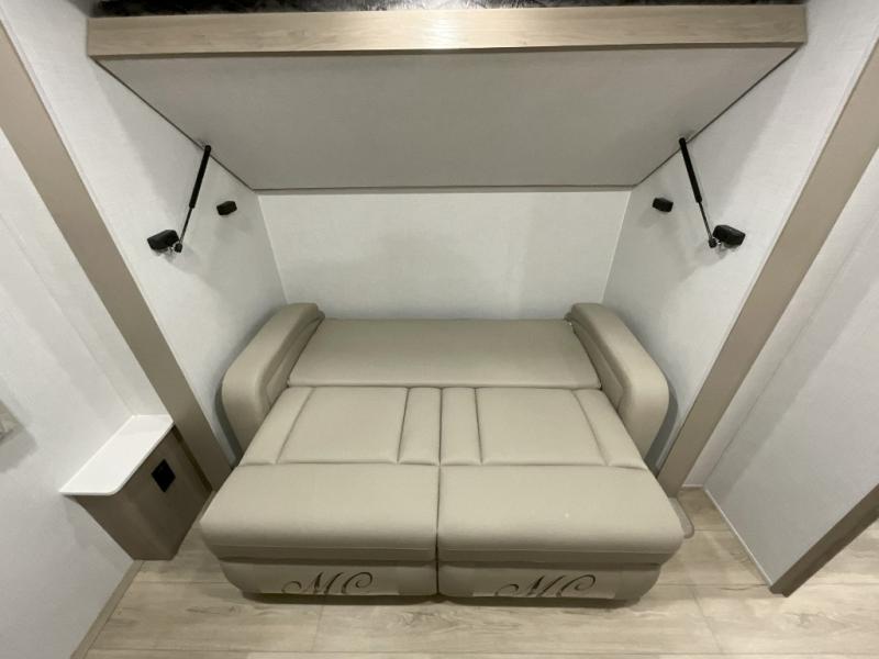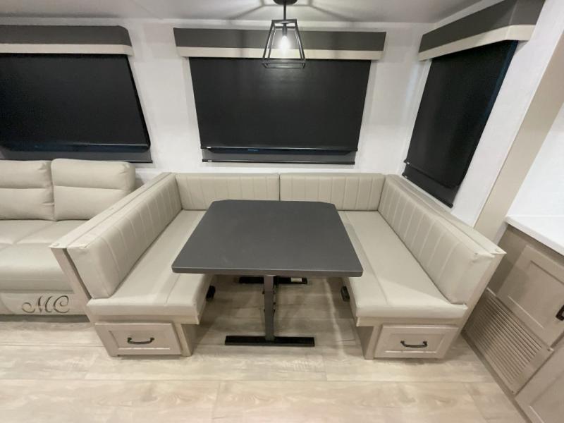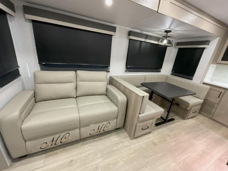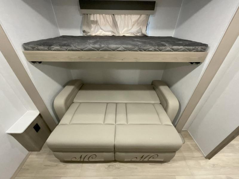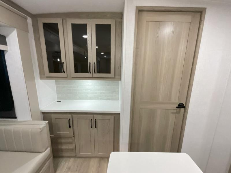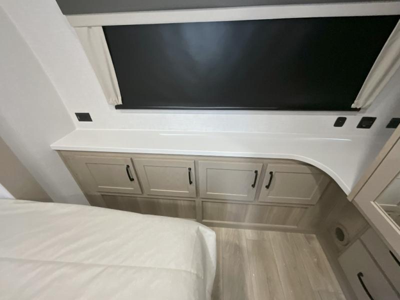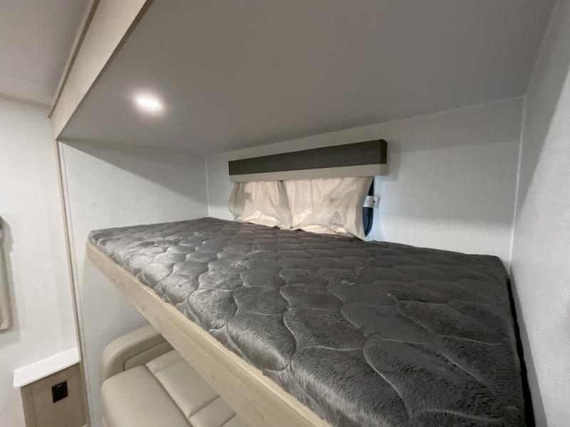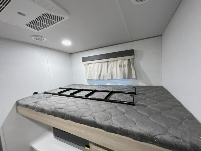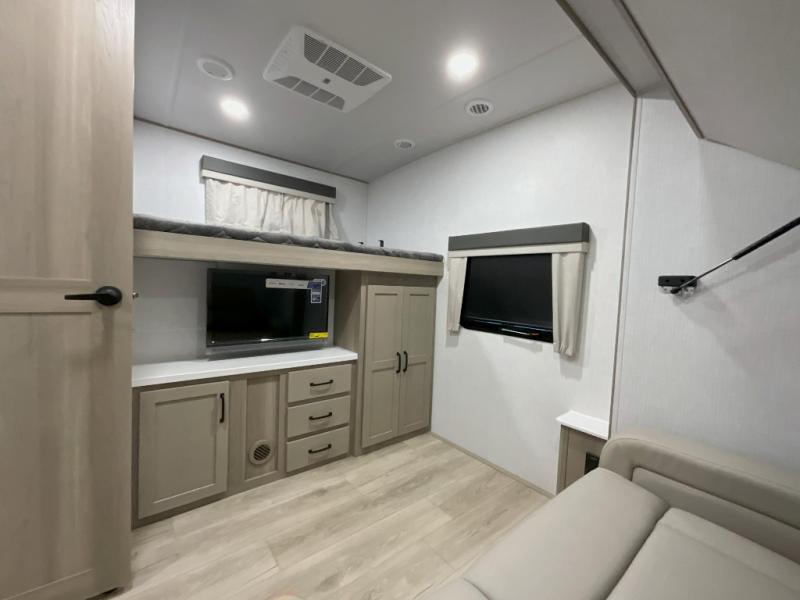 The whole family will love camping in this travel trailer! The kids have their own privacy within the rear bunkhouse that features a 42" x 72" upper bunk with a TV option below it along the curbside, and a 72" x 32" flip-up bunk with a 67" hide-a-bed sofa below it along the roadside. After you have prepared a delicious home-cooked meal with the three-burner cooktop and kitchen island, you can head to the 44" x 81" U-shaped dinette where everyone can gather around. You could even prepare dinner at the outside kitchen, set up a table and chairs, and eat underneath the 11' power awning. The 60" hide-a-bed sofa is the perfect place to sit while enjoying the fireplace or watching your favorite movie on the LED TV. A dual-entry bathroom makes it easy for everyone to access especially those staying in the front private bedroom!