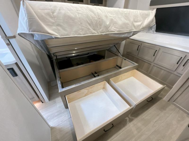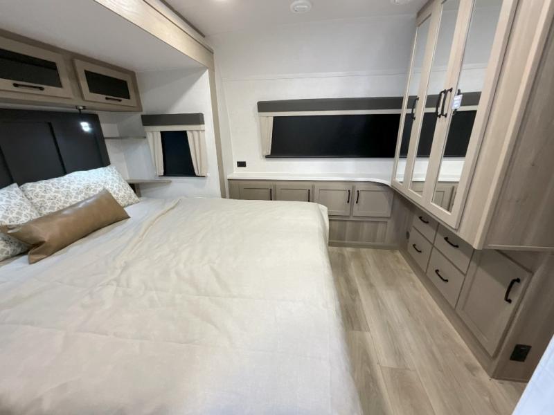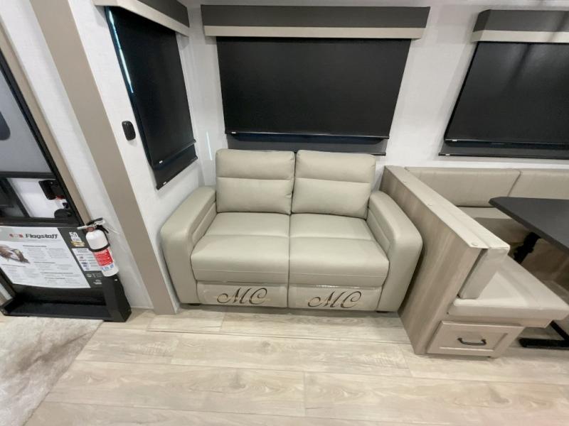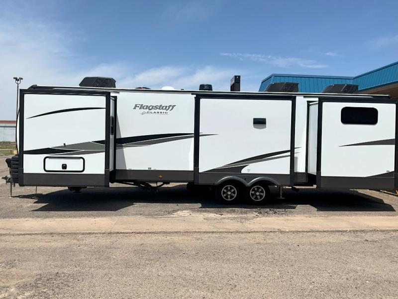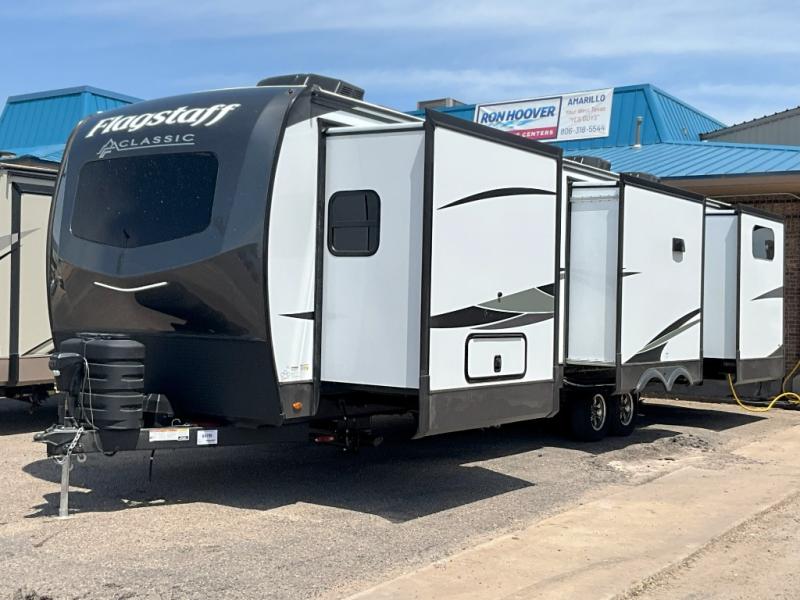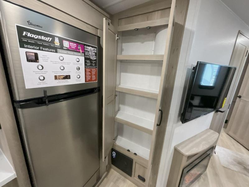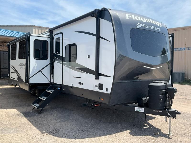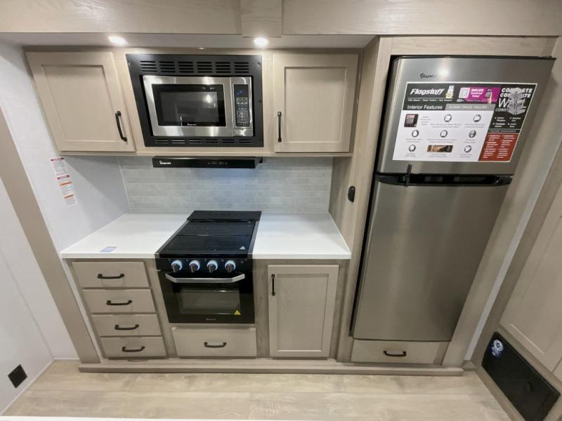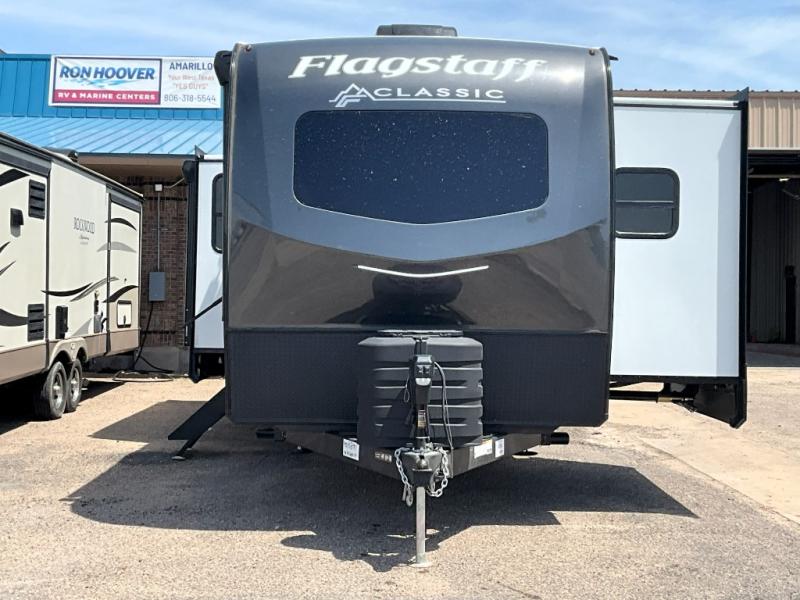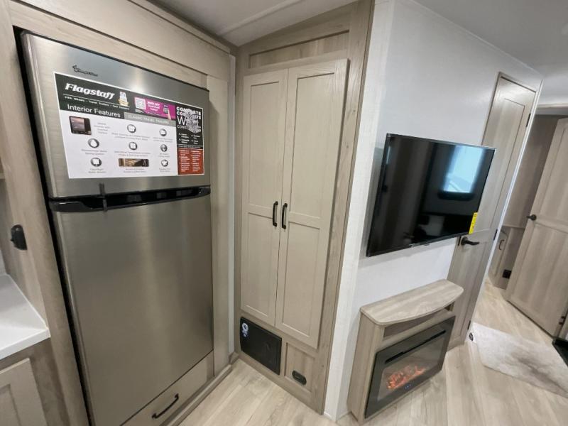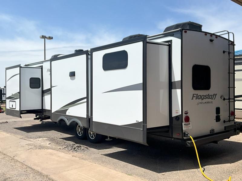 Each one of these Forest River Flagstaff Classic fifth wheels or travel trailers will be your home on wheels! Their quality craftsmanship and attention to detail shines through the surface-coated steel I-beam frame on fifth wheels, the enclosed underbelly, the radius roof with vaulted interior ceilings, and six-sided fully aluminum-framed floor, walls, and roof. Towing your unit will be easy with the torsion axle, Rubber-Ryde suspension, and nitrogen-filled Goodyear Endurance tires. You will even reduce your use of water with the Showermiser water saving system in the bathroom. A few other convenient features you will enjoy include a control panel with WeRV app control, a designer headboard and bedding, and an outside shower with hot and cold water. Come choose your favorite one today!