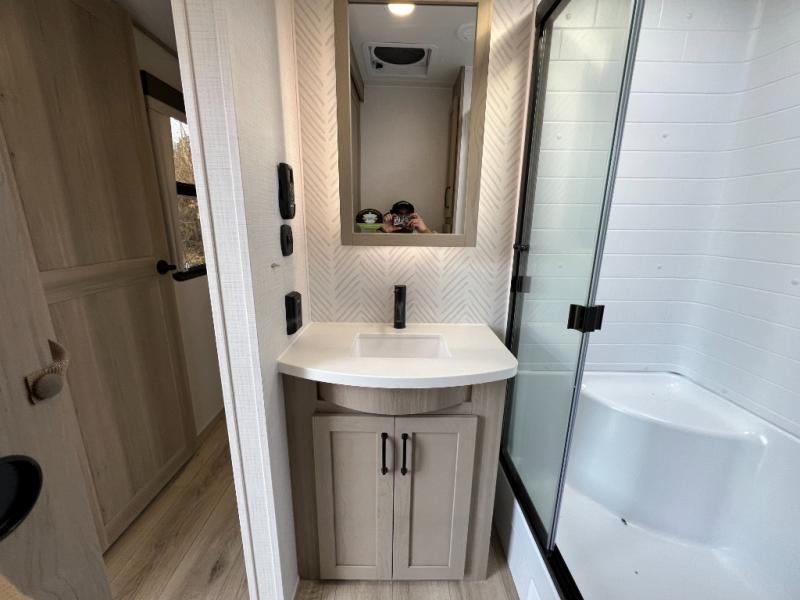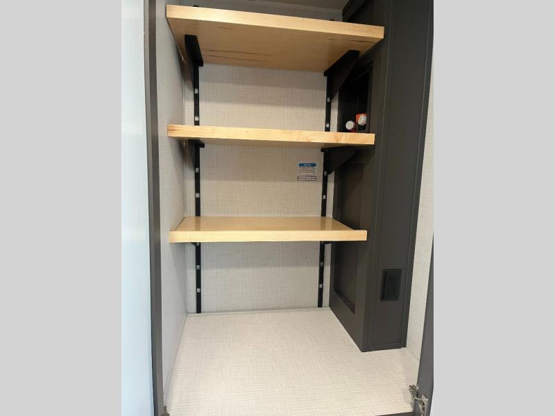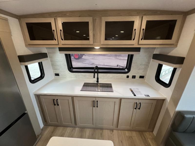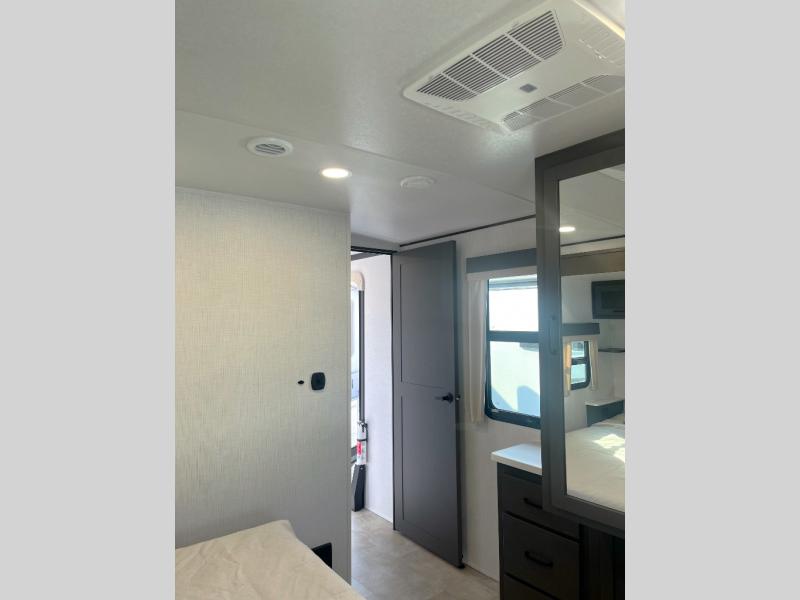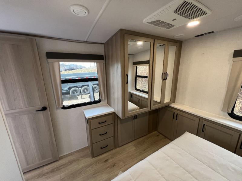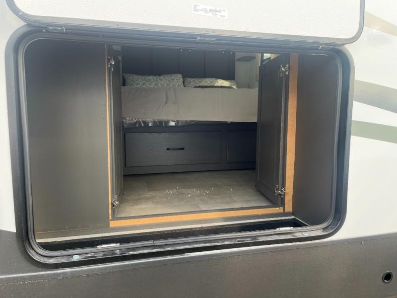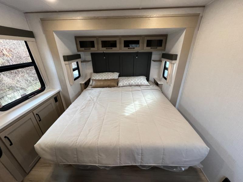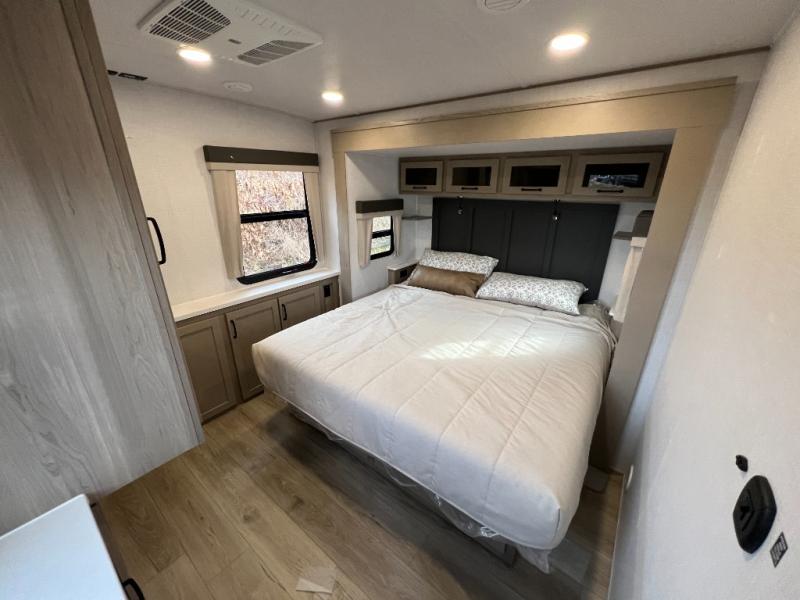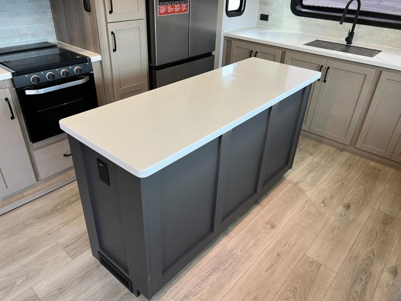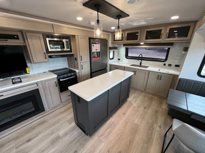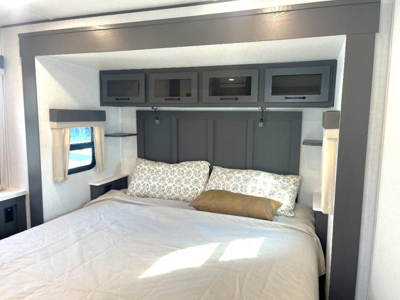Pack your bags and head for the campground in this spacious travel trailer for four! There are dual opposing slides in the combined kitchen and living room plus a third slide out in the rear bedroom. You're sure to get a great night's rest on the king bed, and you can keep your room picked up thanks to the dresser and wardrobe. There is even washer and dryer prep if you choose to add those appliances. There are plenty of spaces to relax, including a theater seat and a hide-a-bed sofa, which will double as your guests' sleeping space. A large kitchen island and generous counter space lets the chef of your group whip up their best meals, and there is a table, chairs and a bench for dining space. If the weather is nice, you may want to make dinner on the exterior griddle while enjoying the two power awnings!
