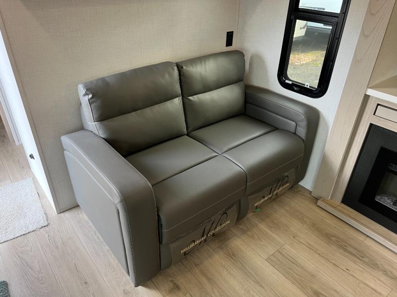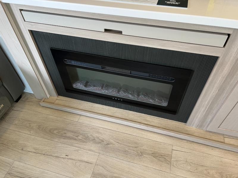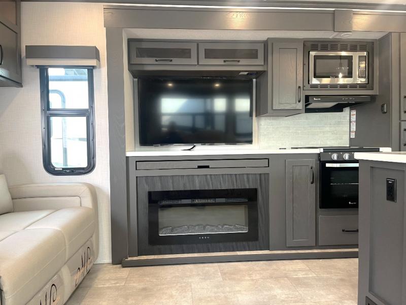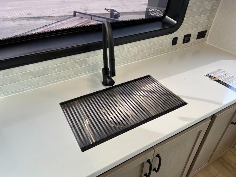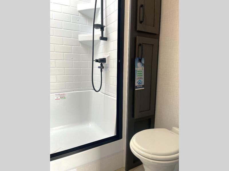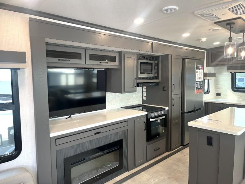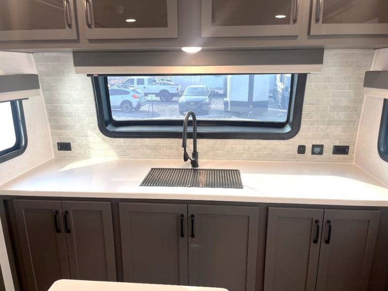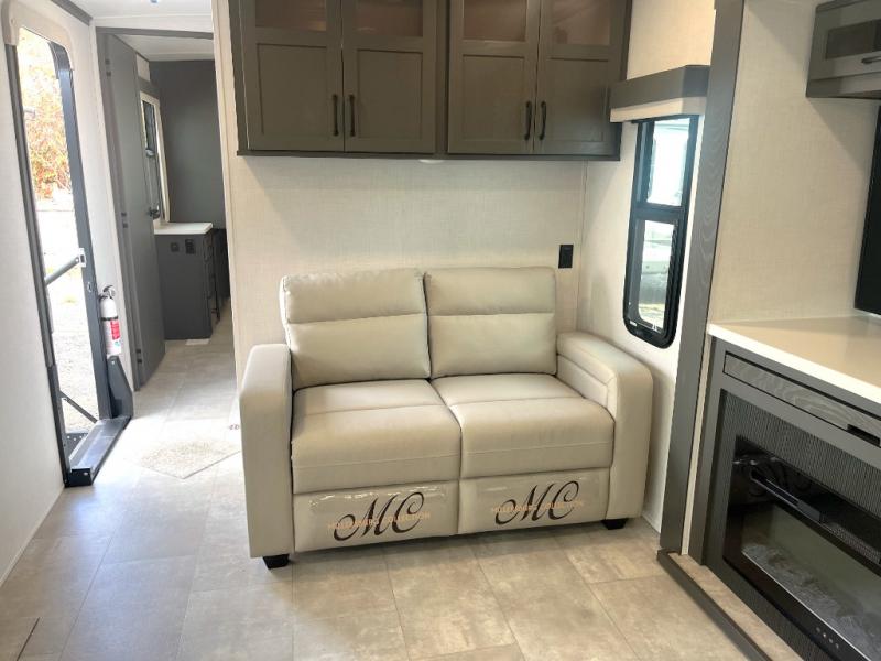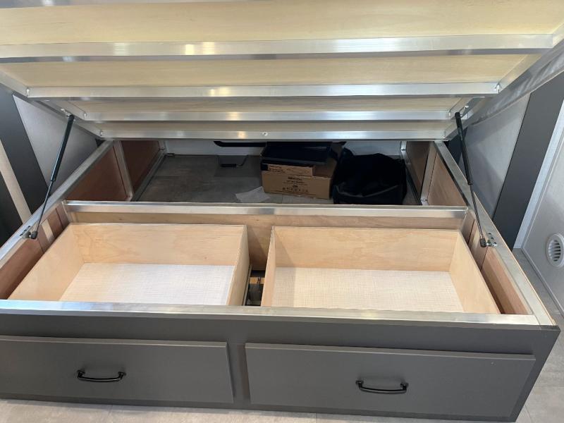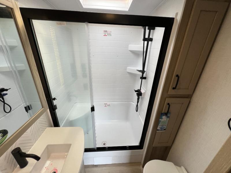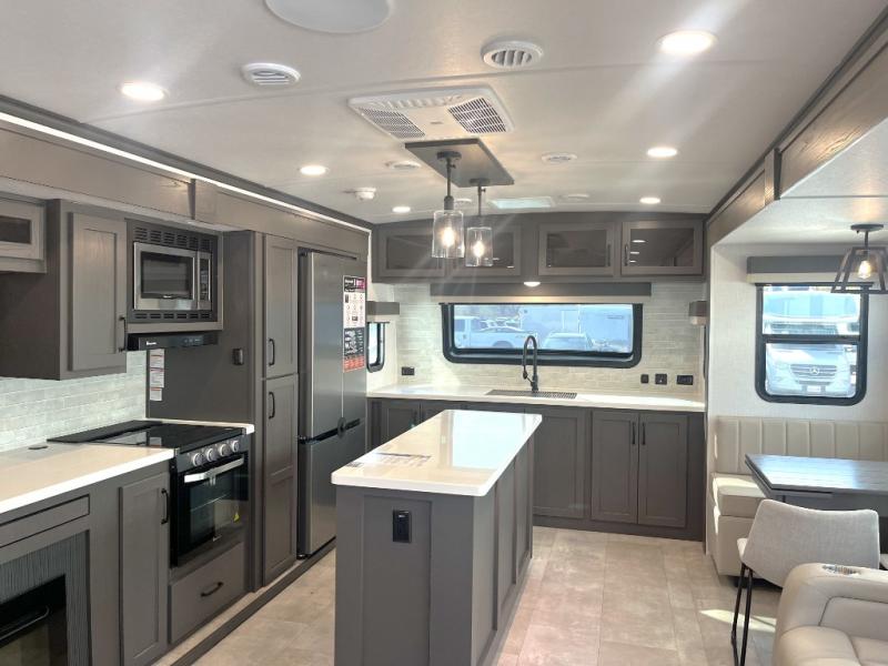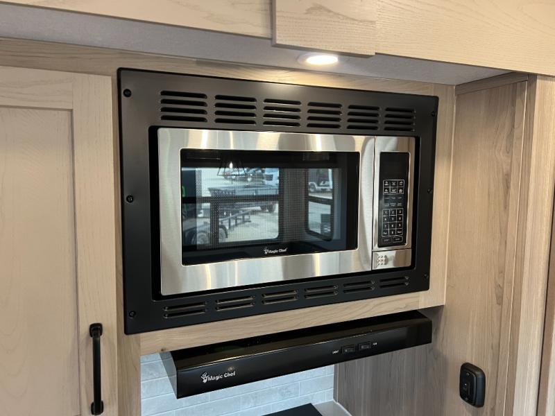 Pack your bags and head for the campground in this spacious travel trailer for four! There are dual opposing slides in the combined kitchen and living room plus a third slide out in the rear bedroom. You're sure to get a great night's rest on the king bed, and you can keep your room picked up thanks to the dresser and wardrobe. There is even washer and dryer prep if you choose to add those appliances. There are plenty of spaces to relax, including a theater seat and a hide-a-bed sofa, which will double as your guests' sleeping space. A large kitchen island and generous counter space lets the chef of your group whip up their best meals, and there is a table, chairs and a bench for dining space. If the weather is nice, you may want to make dinner on the exterior griddle while enjoying the two power awnings!