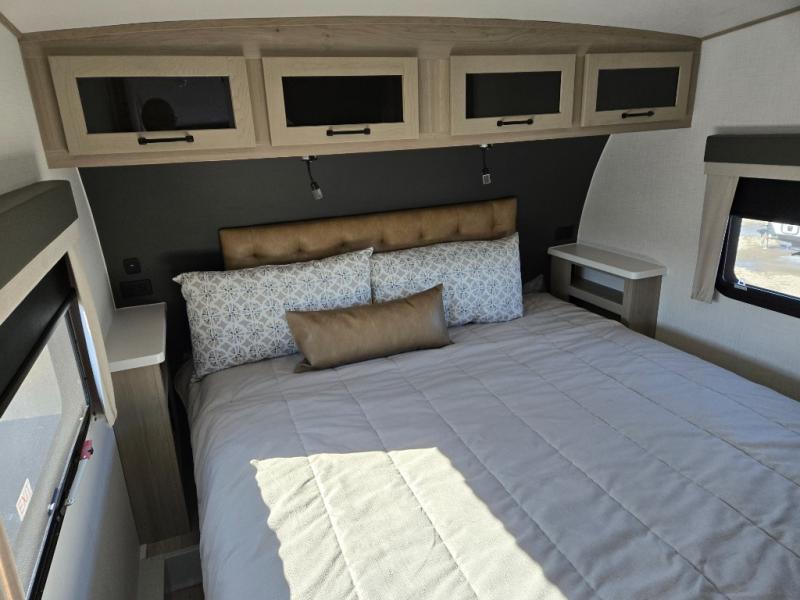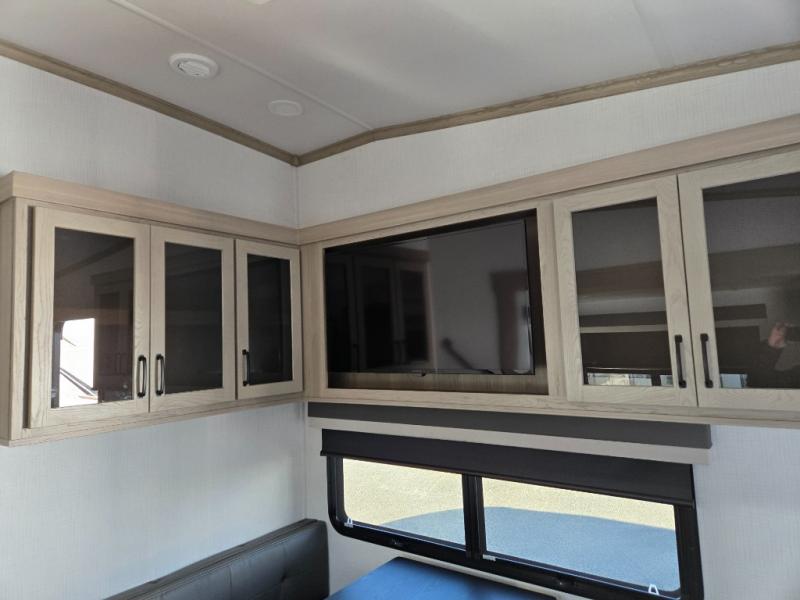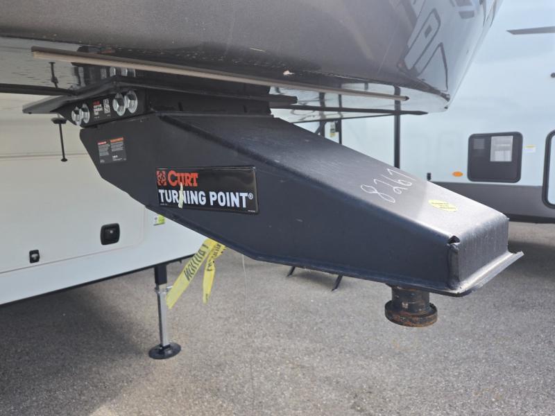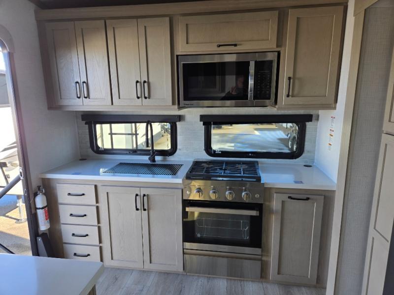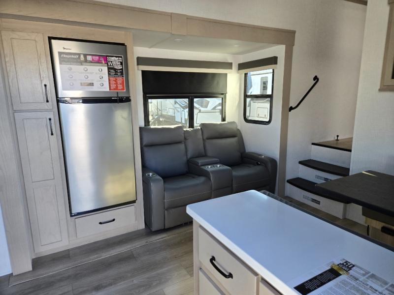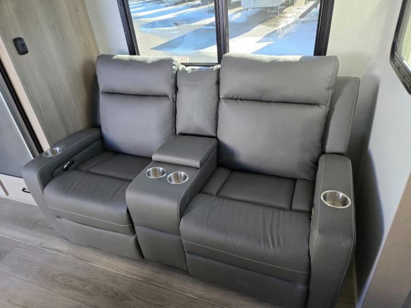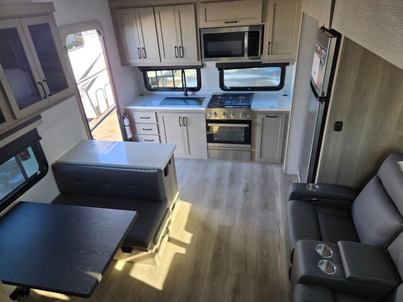 This rear kitchen fifth wheel is the perfect couple's trailer with space for an overnight guest on the booth dinette. There is a front private bedroom with a queen bed where you'll get a great night's rest, and in the morning you can relax on the theater seat with your coffee. The chef of your group will appreciate ample counter space to prep meals, and if the weather is nice, you might want to take your plate outdoors to eat under the 20' power awning.