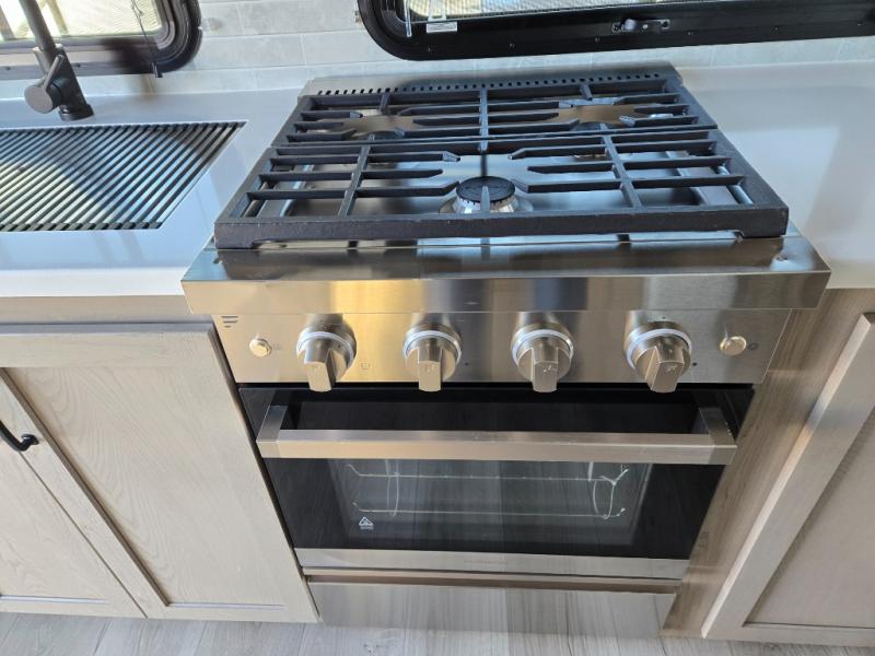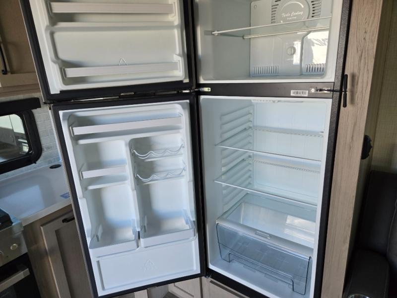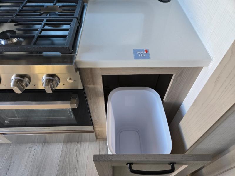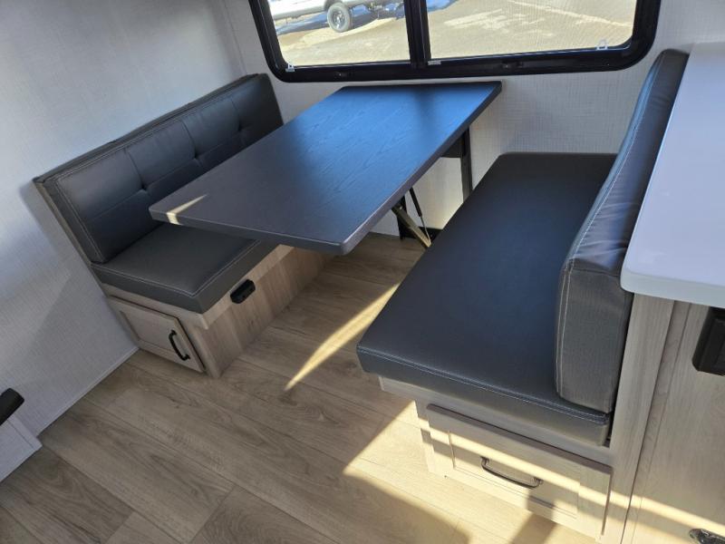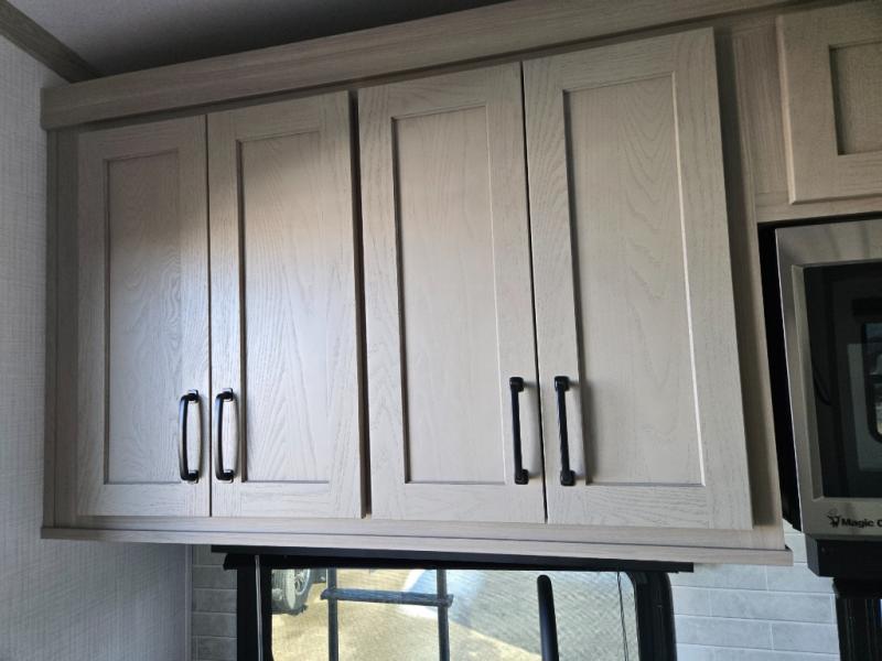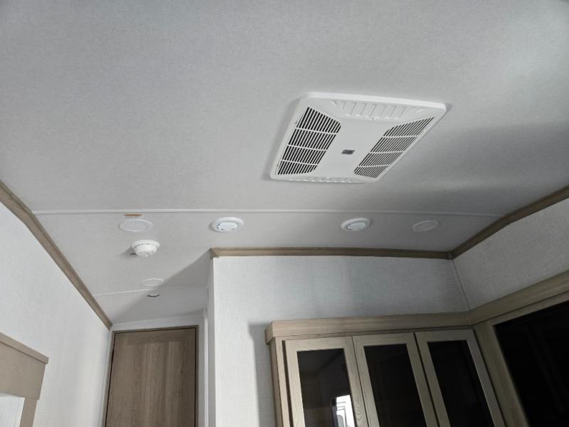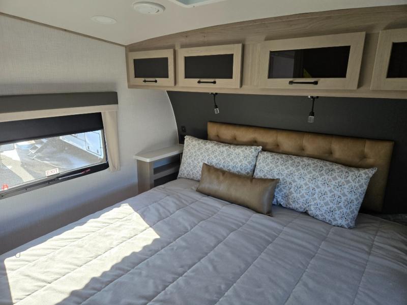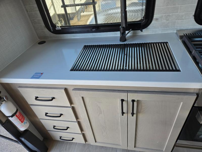 This rear kitchen fifth wheel is the perfect couple's trailer with space for an overnight guest on the booth dinette. There is a front private bedroom with a queen bed where you'll get a great night's rest, and in the morning you can relax on the theater seat with your coffee. The chef of your group will appreciate ample counter space to prep meals, and if the weather is nice, you might want to take your plate outdoors to eat under the 20' power awning.
