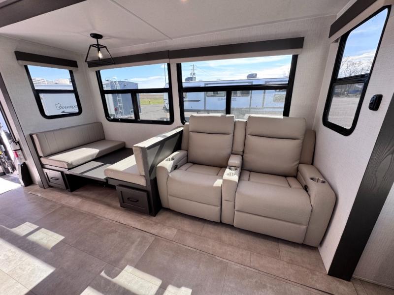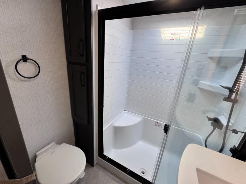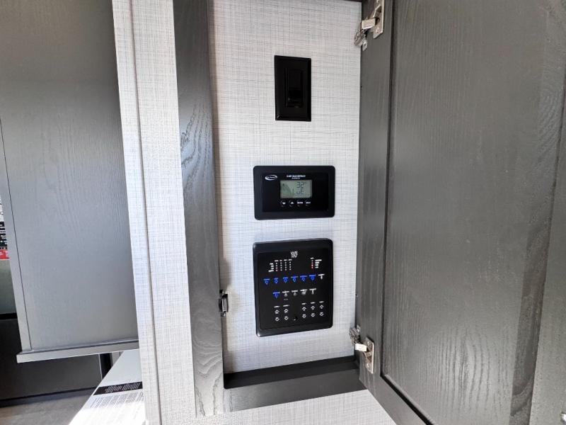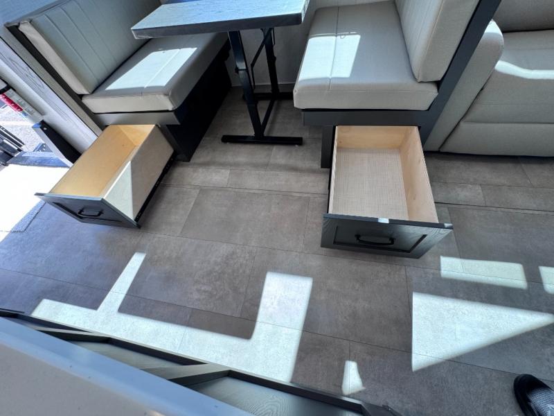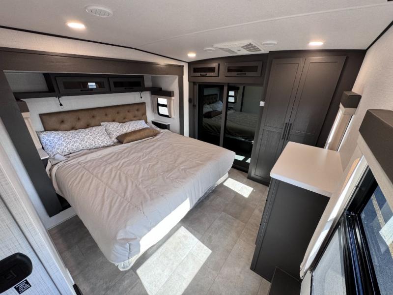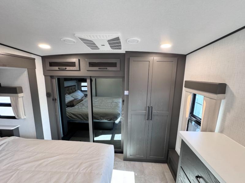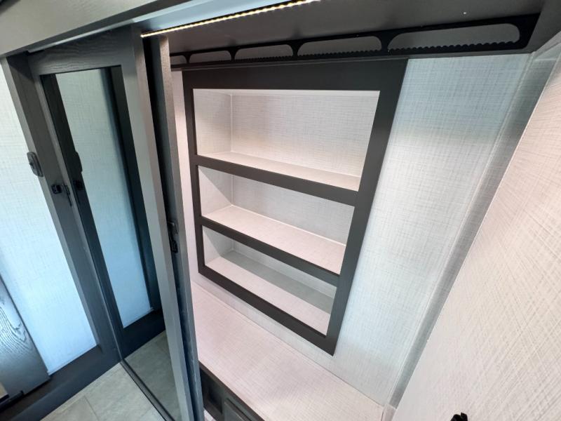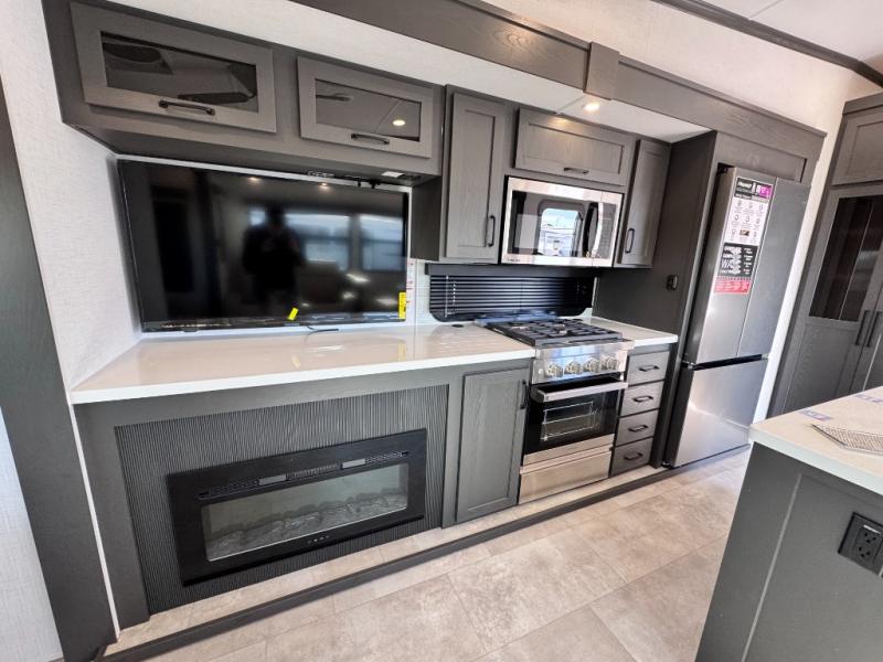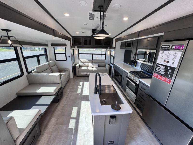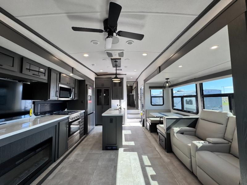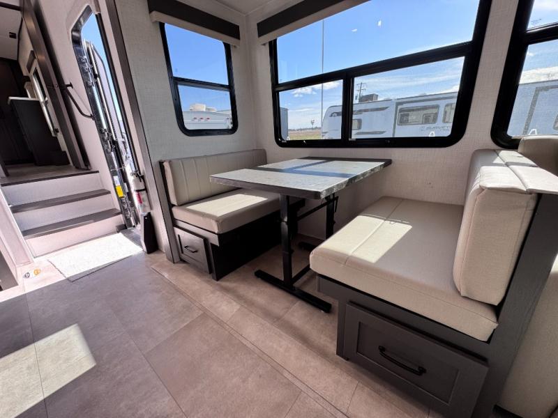 Get ready to enjoy the outdoors while inside with the large windows in both the rear and the door side slide of this fifth wheel. The spacious main living area offers dual opposing slides giving you a great place to invite other RVers over to visit, eat, and even play cards. There is seating for nine from the booth dinette, the theater seats, and the rear hide-a-bed sofa. The cook will have a 12V refrigerator to store lots of drinks and cold food, plus a pantry, and the center island offers extra counter space plus seating. After everyone has left, retire to the front bedroom with a king bed slide, dresser, wardrobe, plus washer and dryer prep if you plan to go full-time!