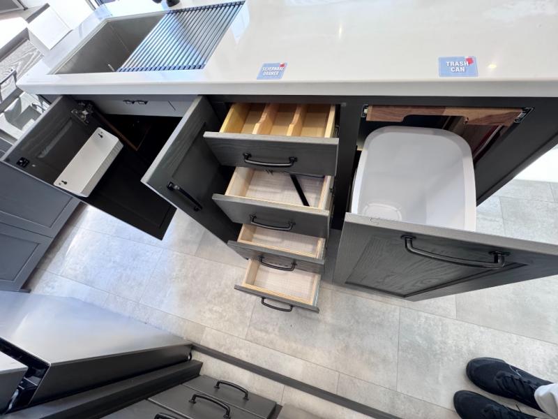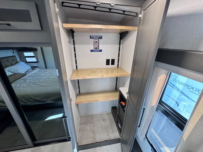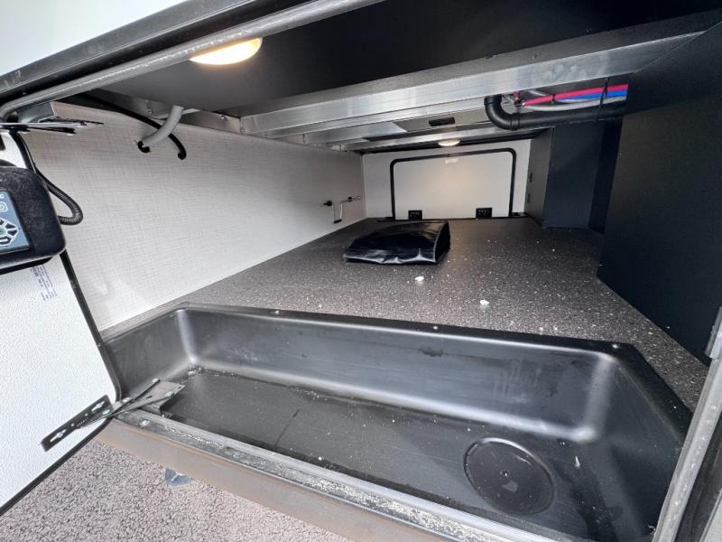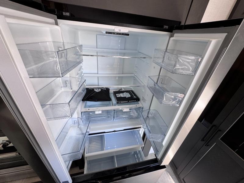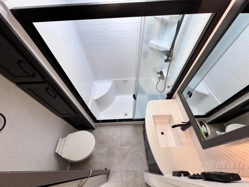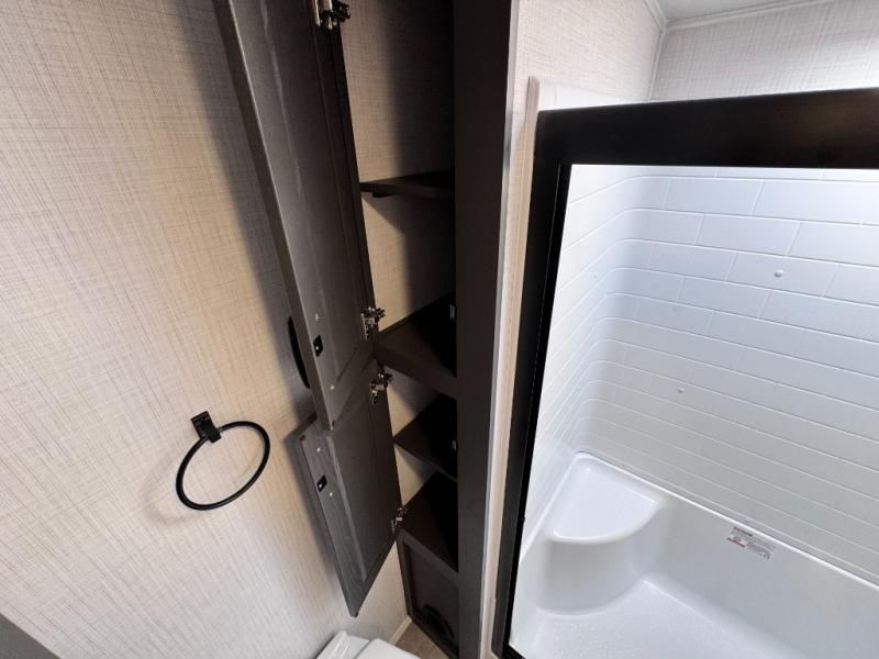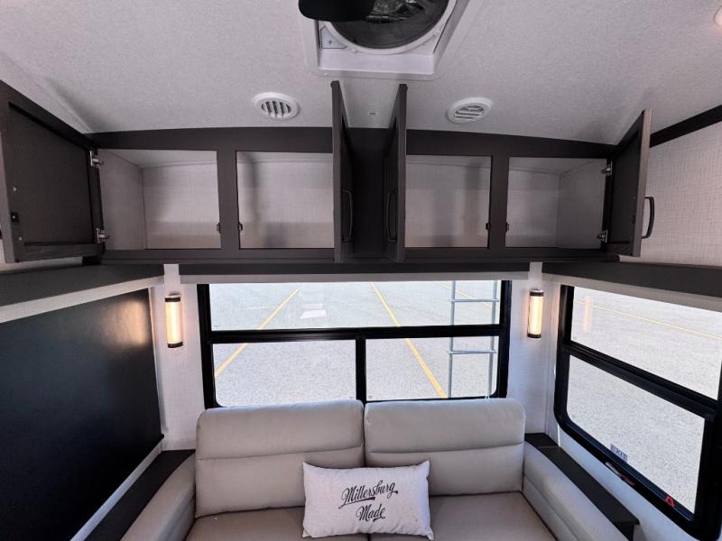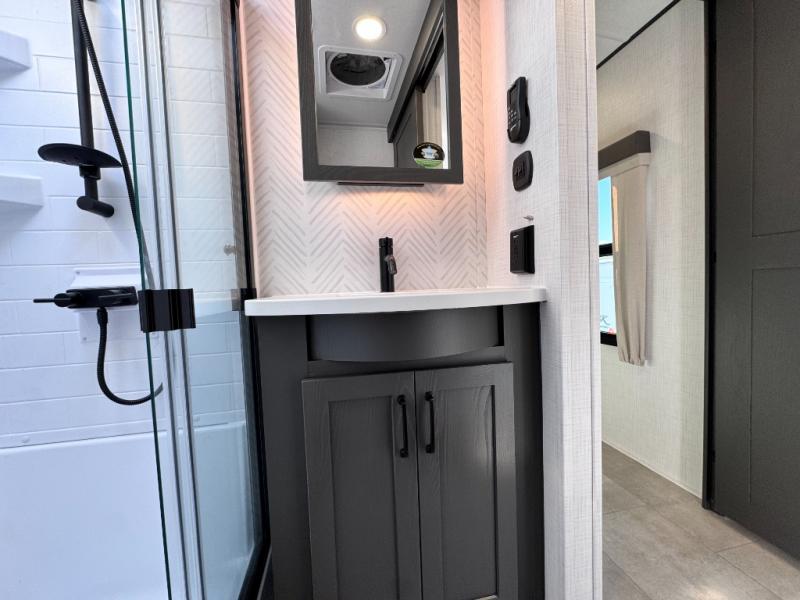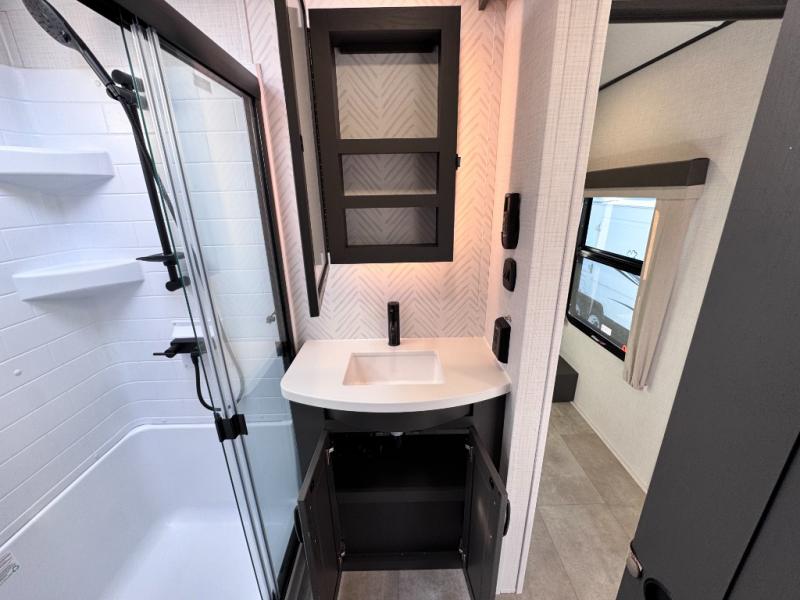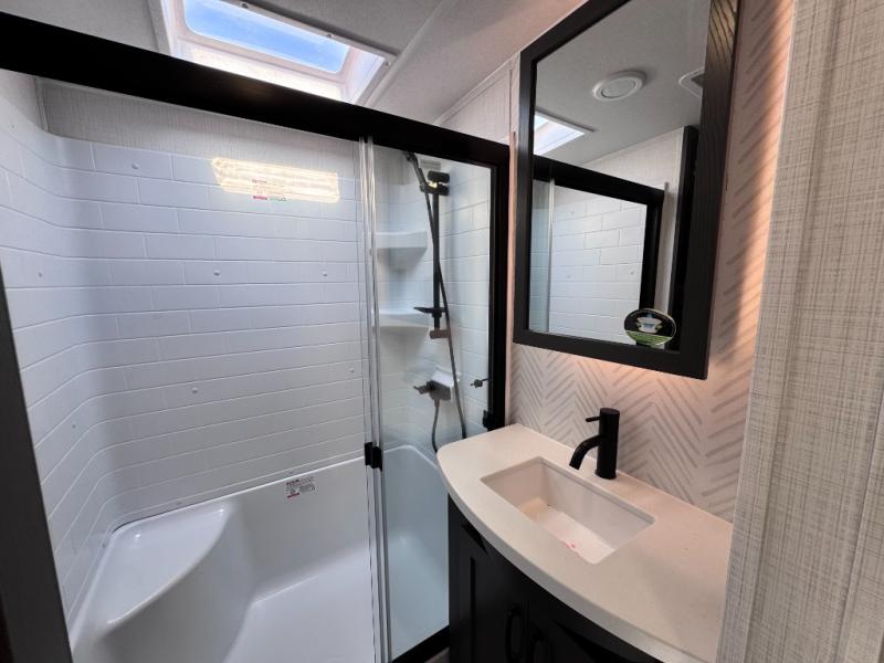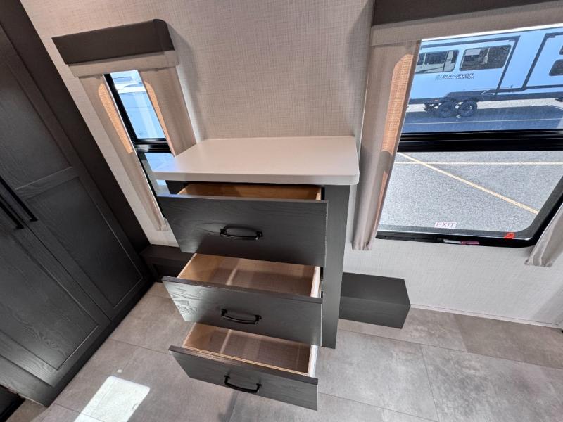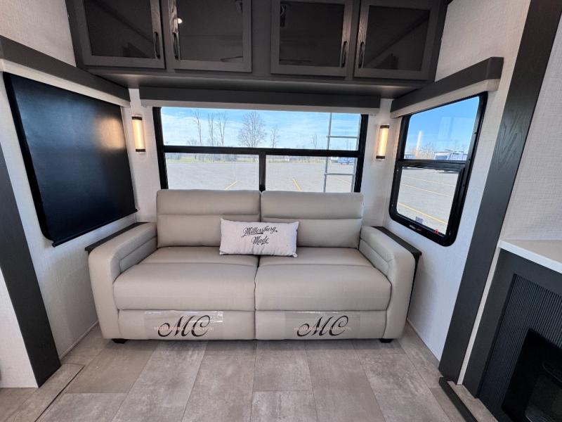Get ready to enjoy the outdoors while inside with the large windows in both the rear and the door side slide of this fifth wheel. The spacious main living area offers dual opposing slides giving you a great place to invite other RVers over to visit, eat, and even play cards. There is seating for nine from the booth dinette, the theater seats, and the rear hide-a-bed sofa. The cook will have a 12V refrigerator to store lots of drinks and cold food, plus a pantry, and the center island offers extra counter space plus seating. After everyone has left, retire to the front bedroom with a king bed slide, dresser, wardrobe, plus washer and dryer prep if you plan to go full-time!