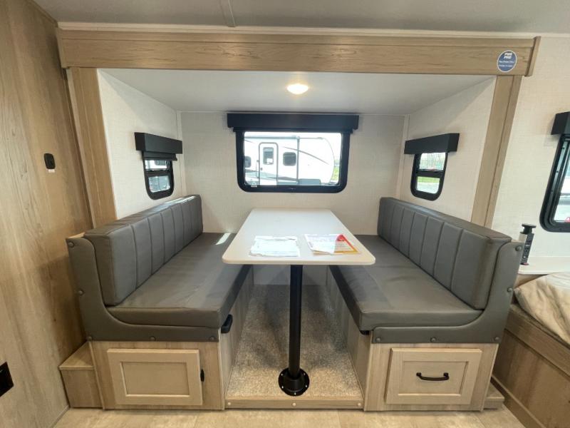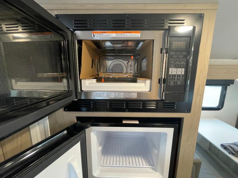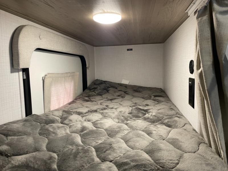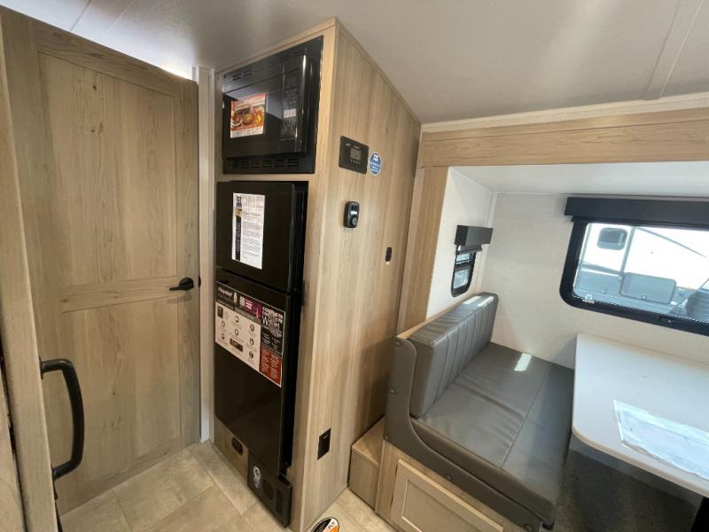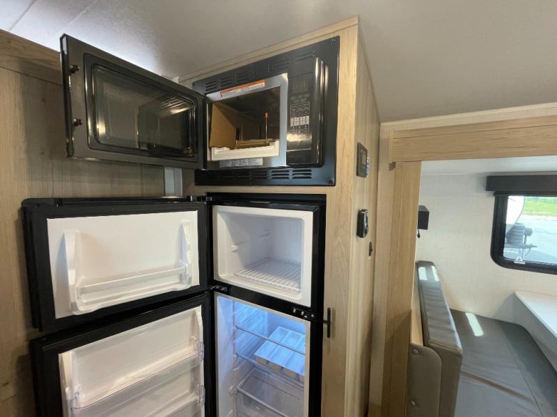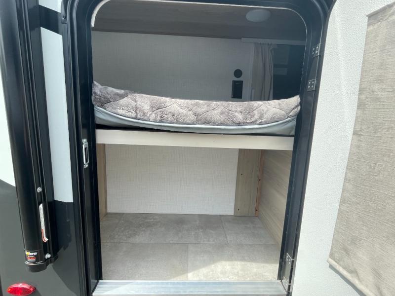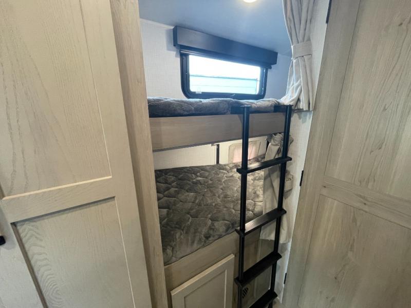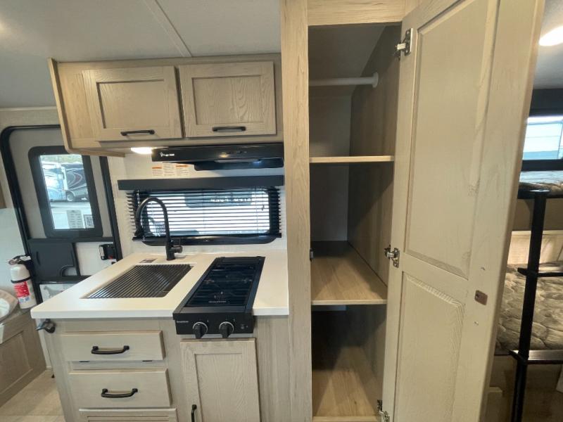 This spacious bunk trailer will work perfectly for a family or friend group that enjoys their own sleeping space, plus more floor space with the dinette slide out that can sleep one to two. The bottom bunk even flips up so you can stow away your bikes, totes and such through the bike door for secure travels. There is exterior storage for more outdoor gear, and interior storage found throughout. The cook will love having a pantry and overhead cabinets for snacks, canned goods, dishes and more. After making a warm meal, the 12V refrigerator can hold the leftovers. There is also a flip-down lavy sink in the full bath for added space when not in use!