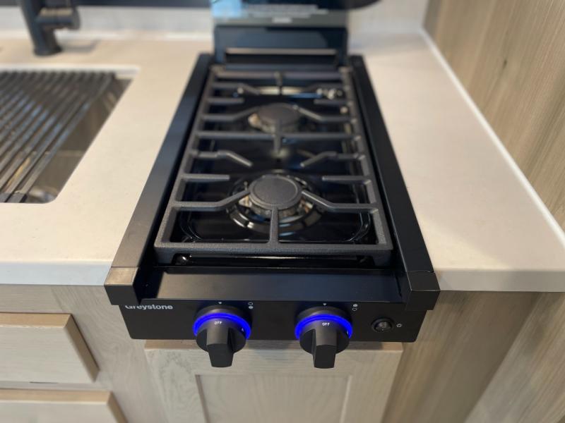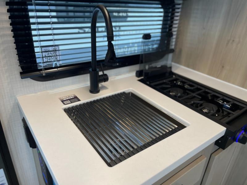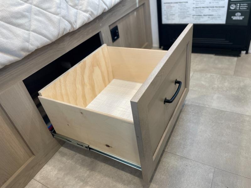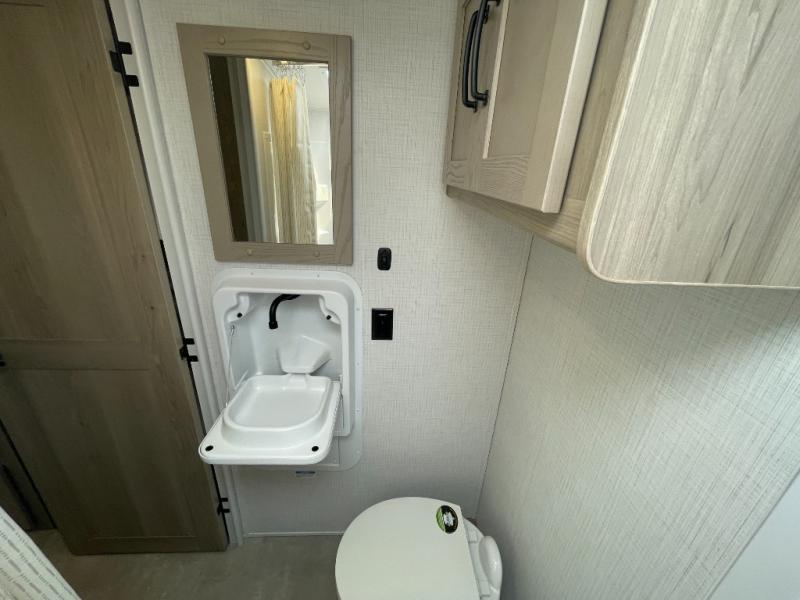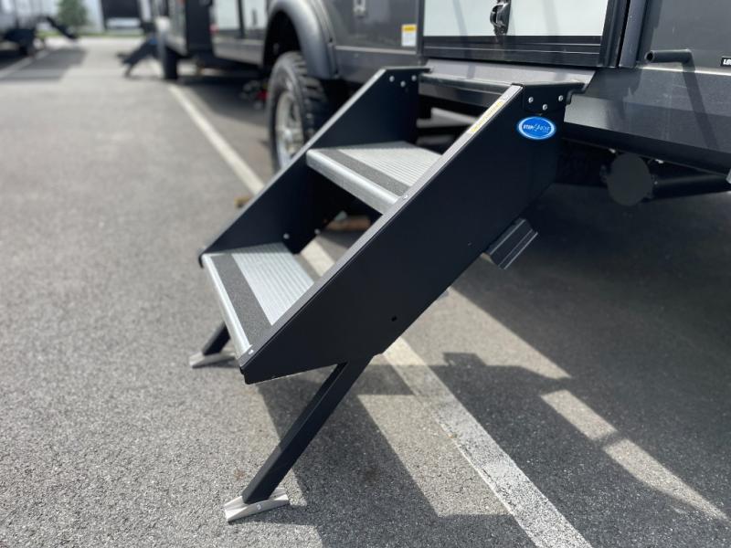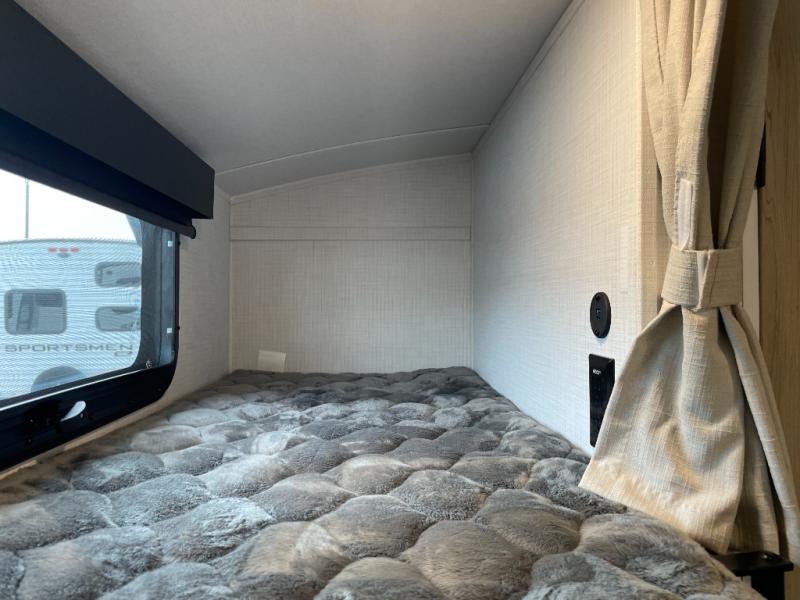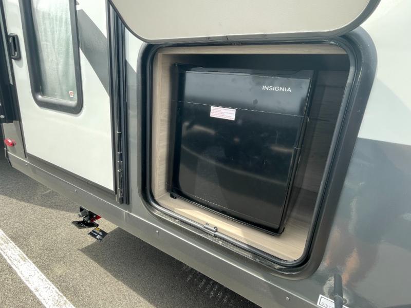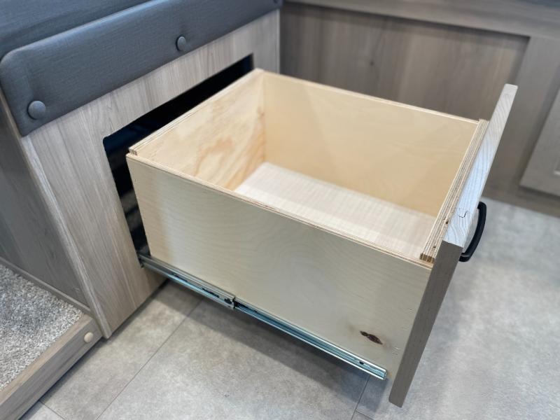 This spacious bunk trailer will work perfectly for a family or friend group that enjoys their own sleeping space, plus more floor space with the dinette slide out that can sleep one to two. The bottom bunk even flips up so you can stow away your bikes, totes and such through the bike door for secure travels. There is exterior storage for more outdoor gear, and interior storage found throughout. The cook will love having a pantry and overhead cabinets for snacks, canned goods, dishes and more. After making a warm meal, the 12V refrigerator can hold the leftovers. There is also a flip-down lavy sink in the full bath for added space when not in use!