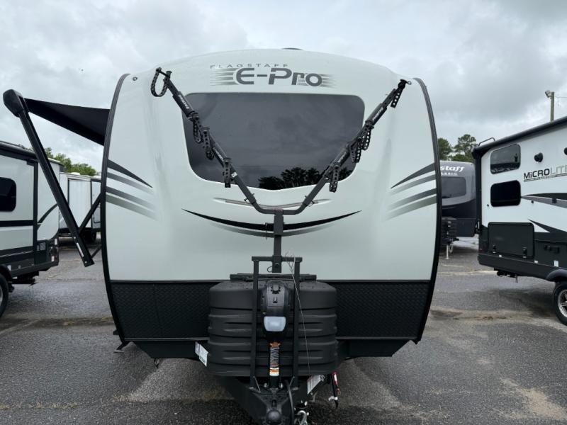 With any Flagstaff E-Pro travel trailer by Forest River, you will experience lightweight towing, style and features that will meet your needs, plus amenities that give you more than you expected! Built with interior and exterior composite sidewall construction, tongue and grove plywood flooring, and a vacuum laminated roof and walls, plus torsion axle, Rubber-Ryde suspension, and a tire pressure monitoring system for safety while traveling. And the 200 watt roof mount solar panel with 1,800-watt inverter will allow you to stay off-grid if you like. The interior offers a comfortable environment with the choice to use the air conditioner or furnace, and a 12V entertainment TV with a stereo to stay up to date on your favorite movies. Make your selection today!
