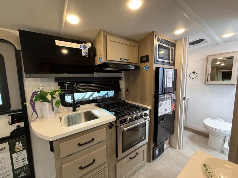 Get ready for a spacious and comfortable trip in this trailer, plus you will have a convenient rear full bathroom with an oversized shower and linen storage to utilize instead of using the campground's facilities. The walk-around full bed gives you two sides with wardrobes to claim as your own. And the kitchen offers full amenities to make meals, and the outside griddle gives you even more choices when cooking. You can relax, dine, or even work from the slide out sofa with a 30" x 15" table and watch the 32" TV. You will find storage along the exterior for your outdoor gear, plus a 14' power awning.
