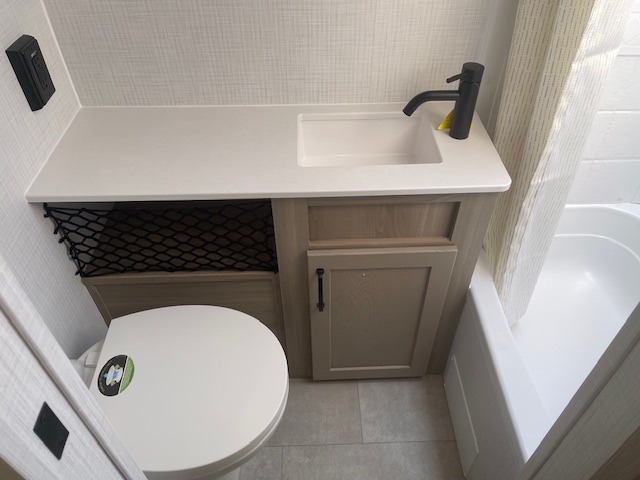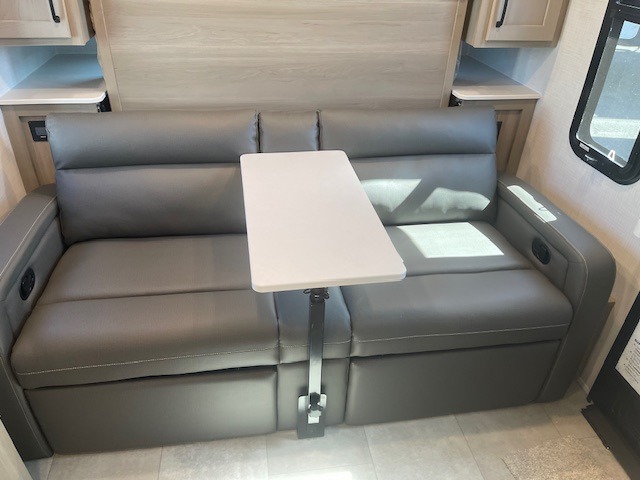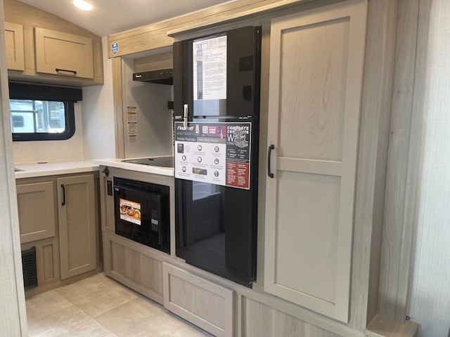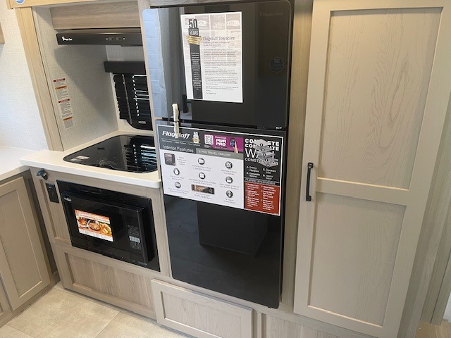 You will love the versatile living in this travel trailer! The jackknife sofa has a 30" x 15" table to relax and enjoy your meals prepared with the recessed three burner cooktop or heat up some leftovers in the convection microwave. At night you can transform the sofa into a 54" x 74" Murphy bed while you watch your favorite movie on the 32" TV across from it. You can freshen up each morning in the rear corner bathroom with the shower which has a shower miser water saver feature to efficiently use your water. The 11' power awning will protect you rain or shine as you cook at the outdoor griddle, and there is plenty of storage between the front outside storage area and the additional pass-through storage area!