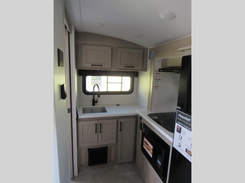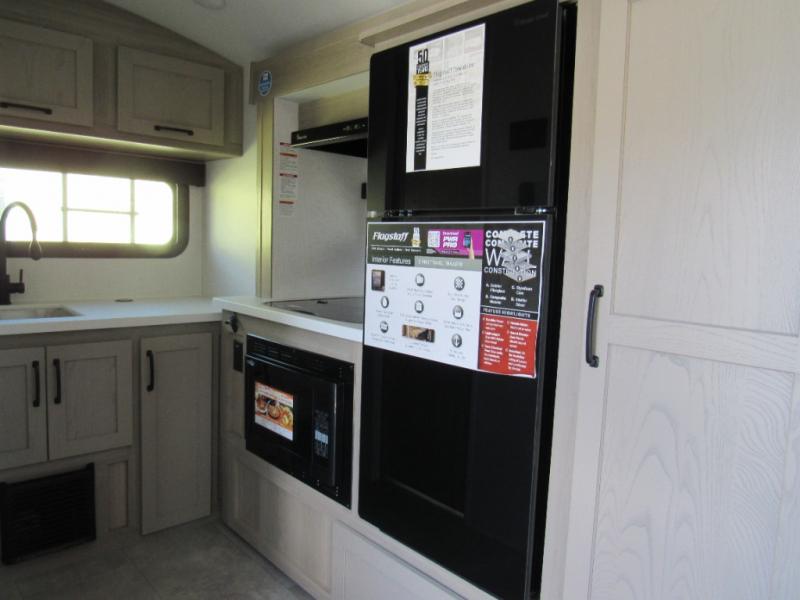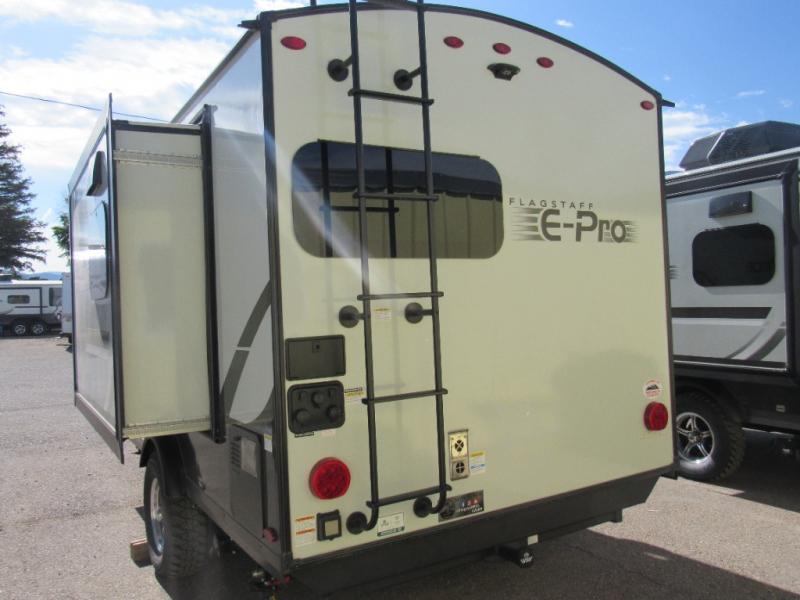 With any Flagstaff E-Pro travel trailer by Forest River, you will experience lightweight towing, style and features that will meet your needs, plus amenities that give you more than you expected! Built with interior and exterior composite sidewall construction, tongue and grove plywood flooring, and a vacuum laminated roof and walls, plus torsion axle, Rubber-Ryde suspension, and a tire pressure monitoring system for safety while traveling. And the 200 watt roof mount solar panel with 1,800-watt inverter will allow you to stay off-grid if you like. The interior offers a comfortable environment with the choice to use the air conditioner or furnace, and a 12V entertainment TV with a stereo to stay up to date on your favorite movies. Make your selection today!