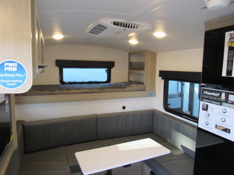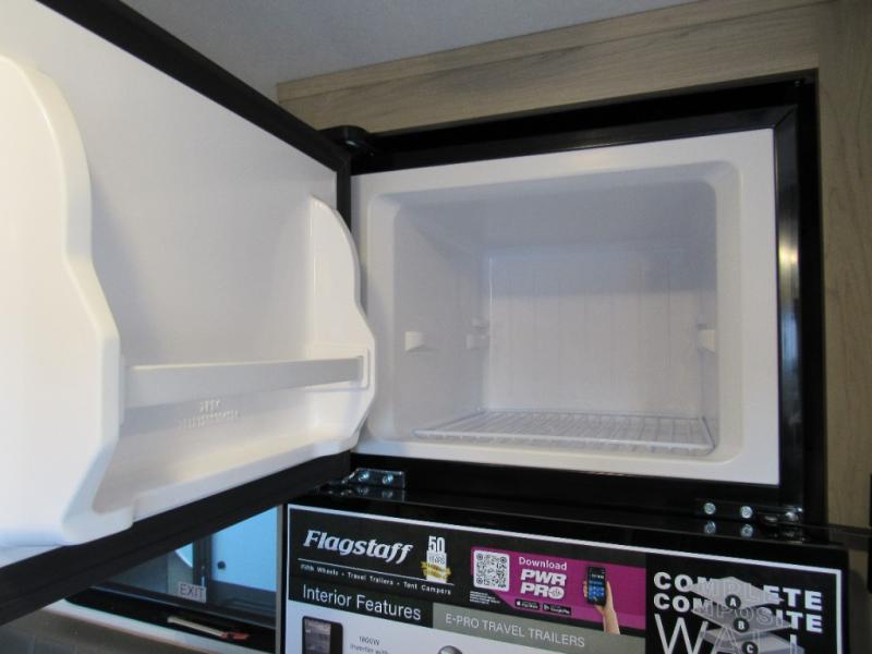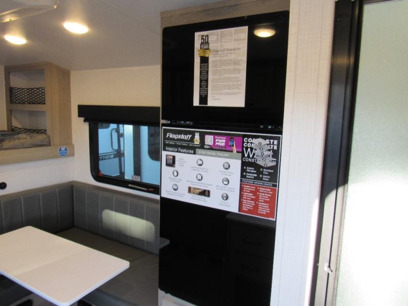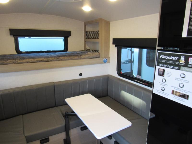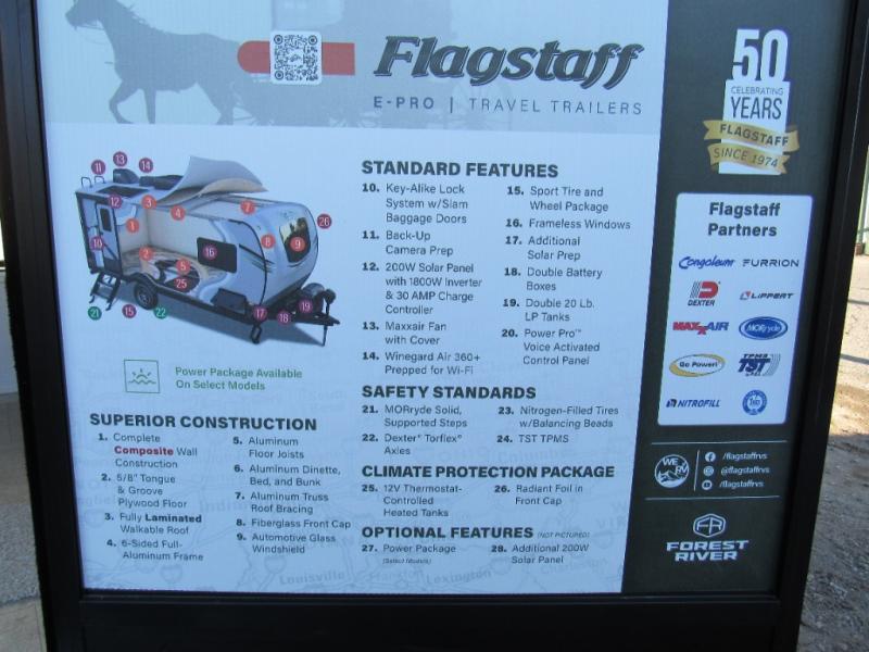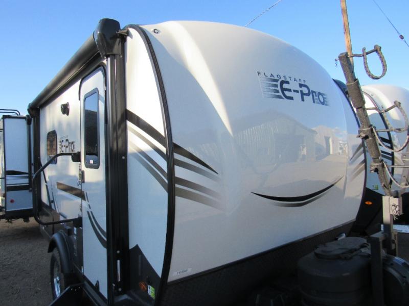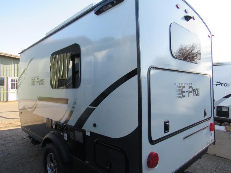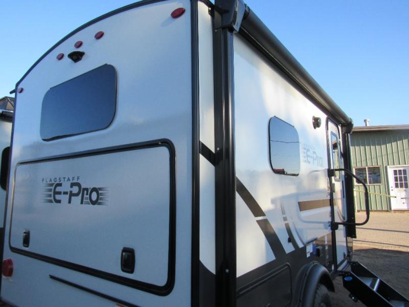 With any Flagstaff E-Pro travel trailer by Forest River, you will experience lightweight towing, style and features that will meet your needs, plus amenities that give you more than you expected! Built with interior and exterior composite sidewall construction, tongue and grove plywood flooring, and a vacuum laminated roof and walls, plus torsion axle, Rubber-Ryde suspension, and a tire pressure monitoring system for safety while traveling. And the 200 watt roof mount solar panel with 1,800-watt inverter will allow you to stay off-grid if you like. The interior offers a comfortable environment with the choice to use the air conditioner or furnace, and a 12V entertainment TV with a stereo to stay up to date on your favorite movies. Make your selection today!