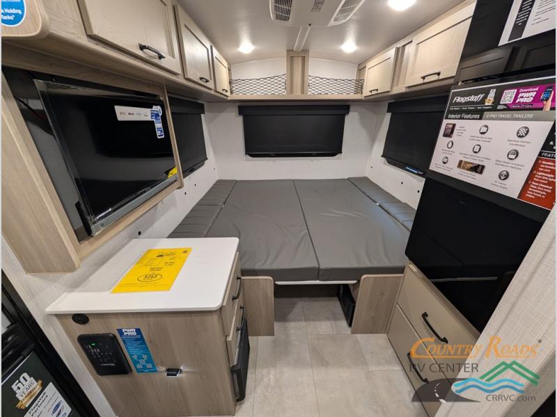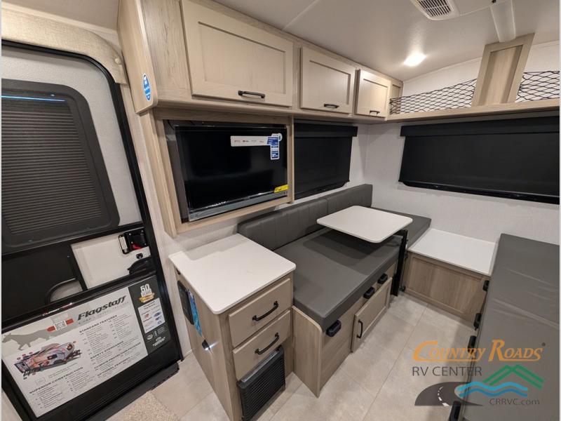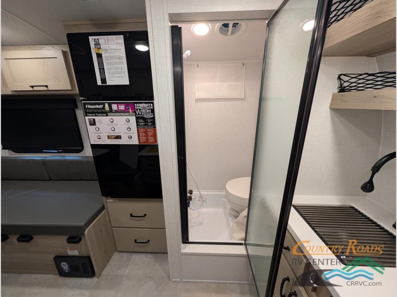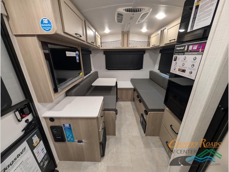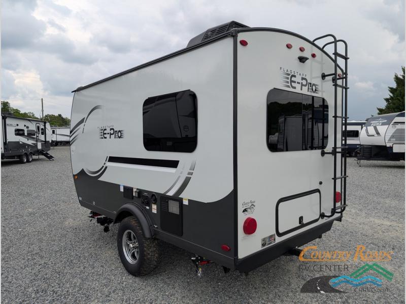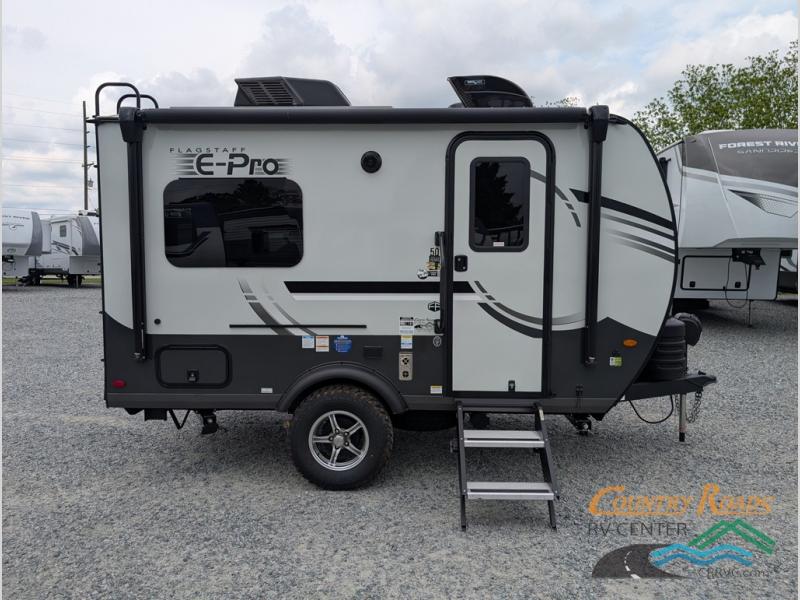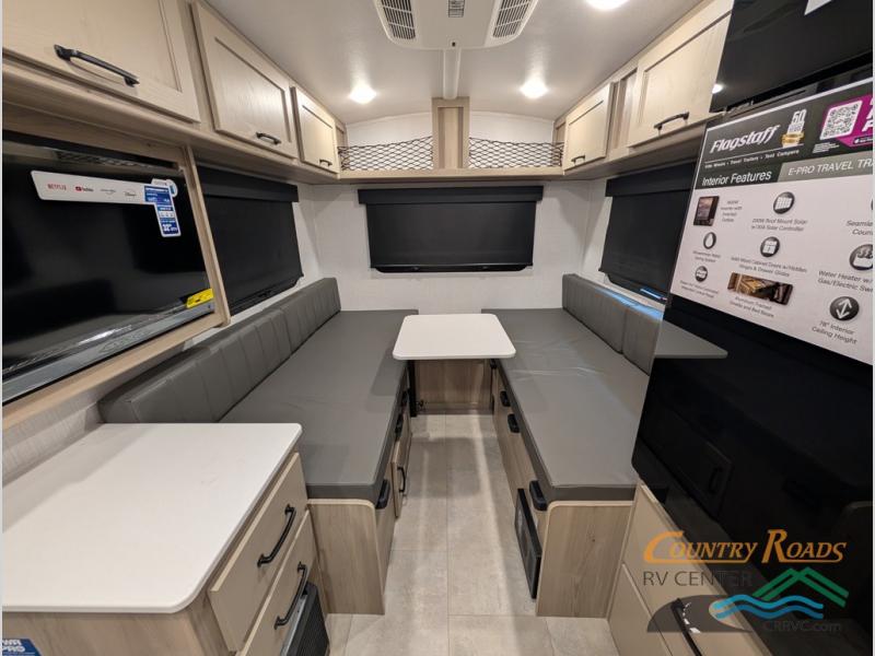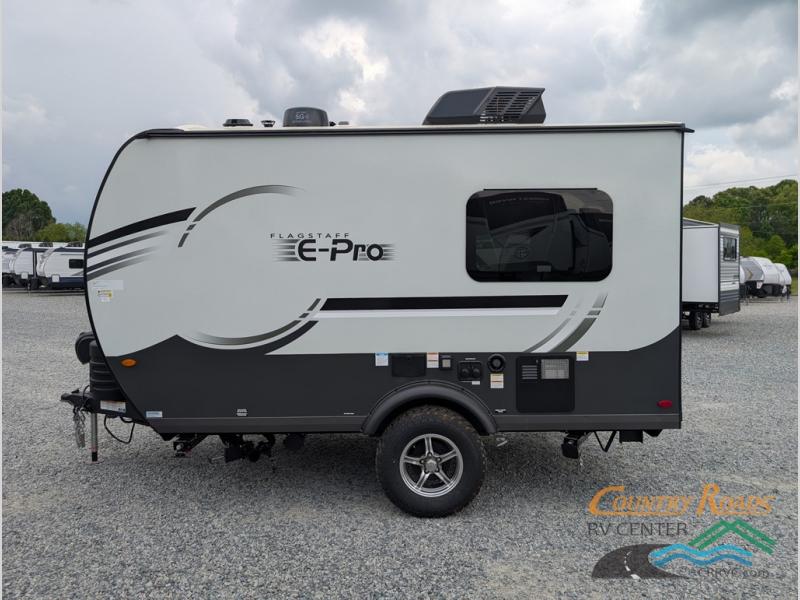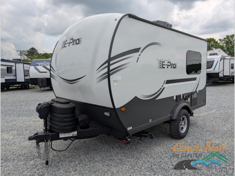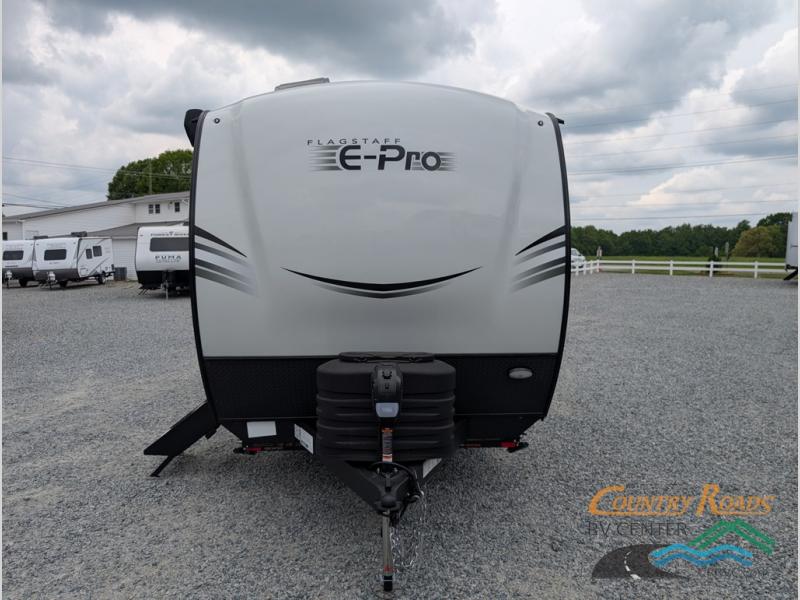 With any Flagstaff E-Pro travel trailer by Forest River, you will experience lightweight towing, style and features that will meet your needs, plus amenities that give you more than you expected! Built with interior and exterior composite sidewall construction, tongue and grove plywood flooring, and a vacuum laminated roof and walls, plus torsion axle, Rubber-Ryde suspension, and a tire pressure monitoring system for safety while traveling. And the 200 watt roof mount solar panel with 1,800-watt inverter will allow you to stay off-grid if you like. The interior offers a comfortable environment with the choice to use the air conditioner or furnace, and a 12V entertainment TV with a stereo to stay up to date on your favorite movies. Make your selection today!