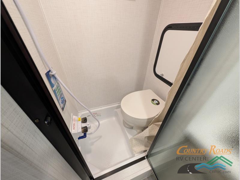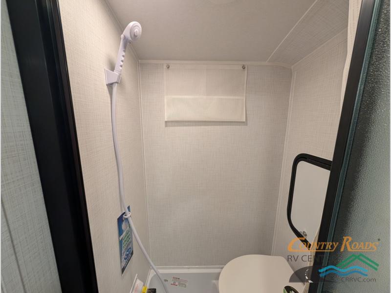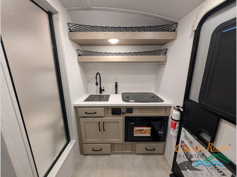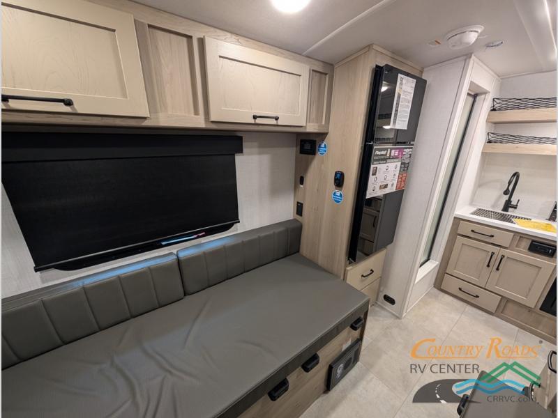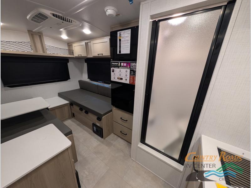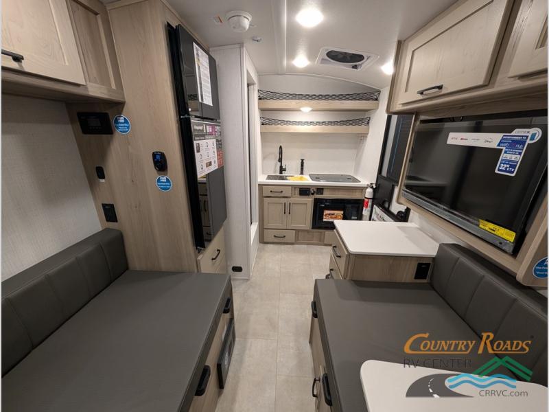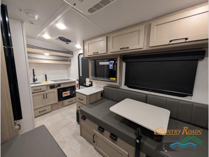 It's time to hit the road in this small, yet walkable travel trailer that is versatile to your needs and offers everything you will want to stay comfortable at a campground or off-grid. You can make meals using the cooktop and microwave up front, and store your cold items in the 12V refrigerator. Take turns getting cleaned up in the wet bath so you can skip the public facilities, and store your clothing in the overhead cabinets. You can watch the 32" TV while dining or sleeping on the twin beds that offer a table top to help you convert this area into a king bed. And the 10' power awning will give you a place to hang out while you use the outdoor griddle.
