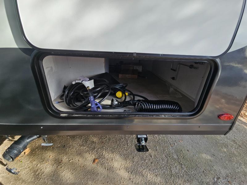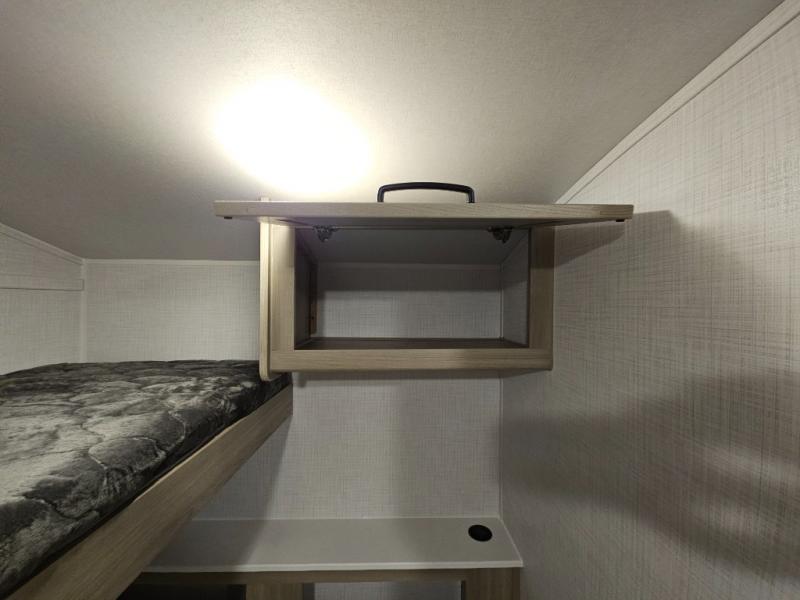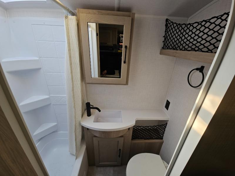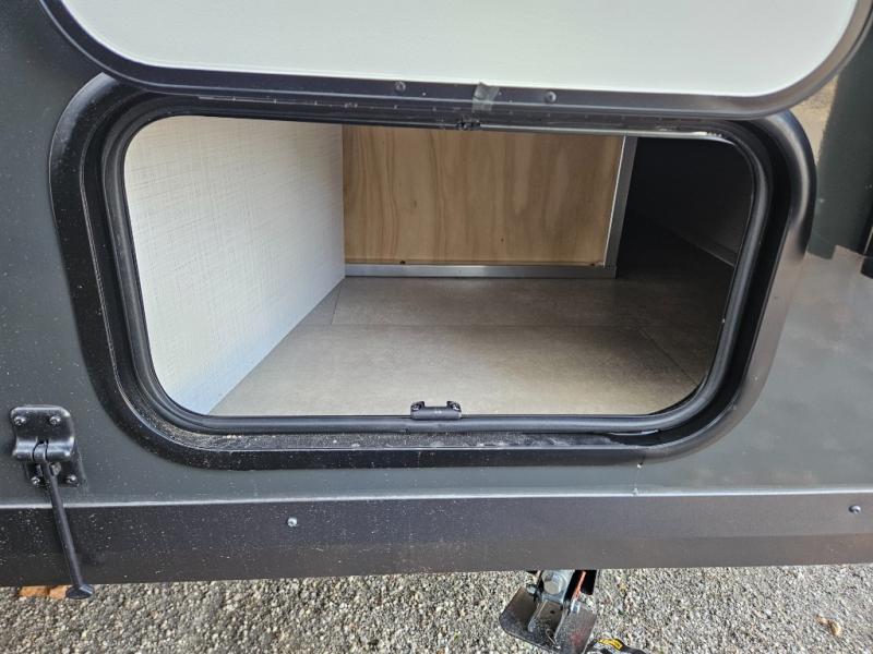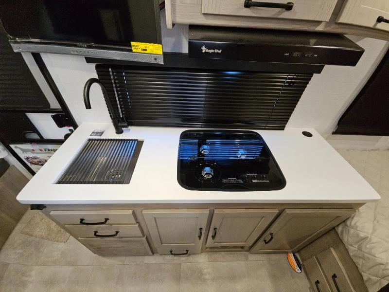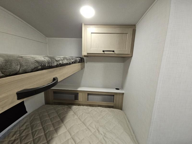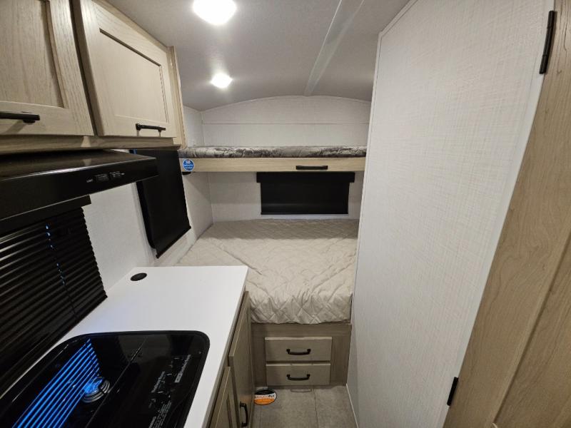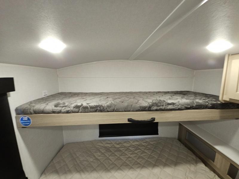 Your small family will enjoy camping in this travel trailer! The 26" x 80" flip-up bunk provides a comfortable place to sleep above the 54" x 74" full bed, as well as the front 54" x 81" U-shaped dinette once converted. You even have a 32" TV nearby to watch your favorite movies. Freshen up in the full bathroom each morning and warm up a cinnamon roll in the microwave or grab some eggs from the 12V refrigerator then fry them up on the recessed three burner cooktop. There is also an outside griddle underneath the 15' power awning, and the pass-thru storage will be perfect for fishing poles!