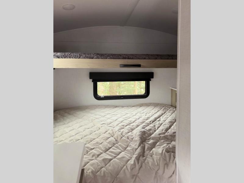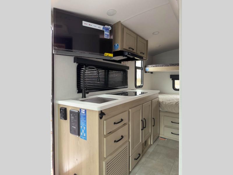 Your small family will enjoy camping in this travel trailer! The 26" x 80" flip-up bunk provides a comfortable place to sleep above the 54" x 74" full bed, as well as the front 54" x 81" U-shaped dinette once converted. You even have a 32" TV nearby to watch your favorite movies. Freshen up in the full bathroom each morning and warm up a cinnamon roll in the convection microwave or grab some eggs from the 12V refrigerator then fry them up on the recessed three burner cooktop. There is also an outside griddle underneath the 15' power awning, and the pass-thru storage will be perfect for fishing poles!