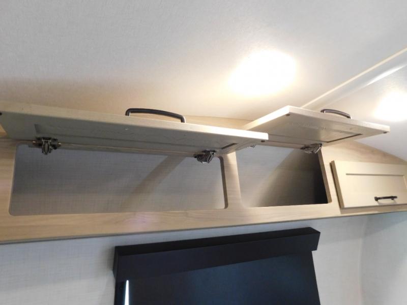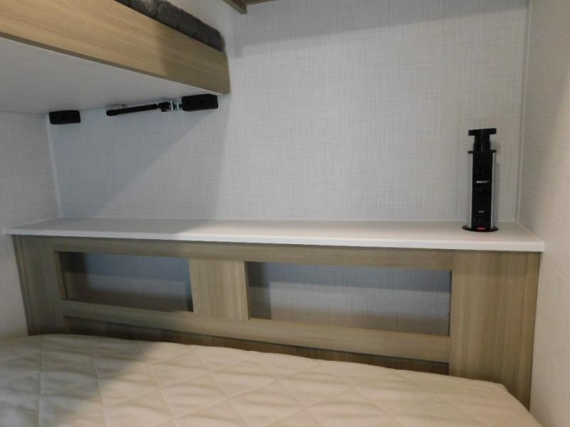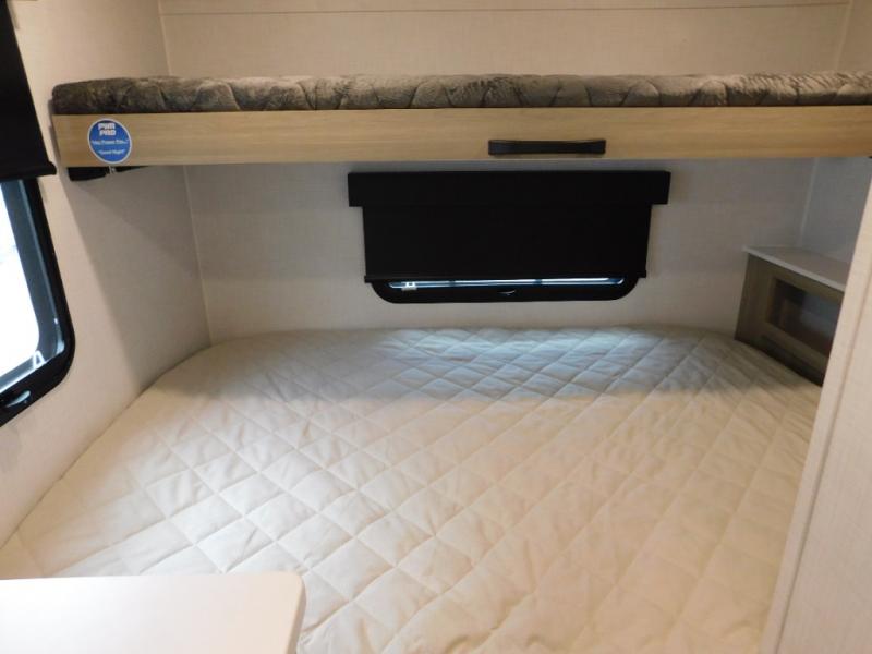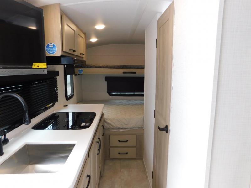Your small family will enjoy camping in this travel trailer! The 26" x 80" flip-up bunk provides a comfortable place to sleep above the 54" x 74" full bed, as well as the front 54" x 81" U-shaped dinette once converted. You even have a 32" TV nearby to watch your favorite movies. Freshen up in the full bathroom each morning and warm up a cinnamon roll in the convection microwave or grab some eggs from the 12V refrigerator then fry them up on the recessed three burner cooktop. There is also an outside griddle underneath the 15' power awning, and the pass-thru storage will be perfect for fishing poles!