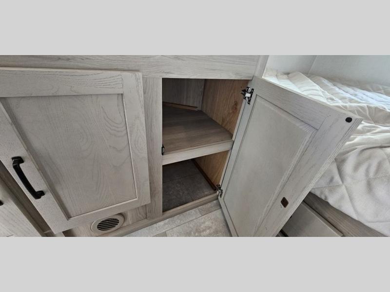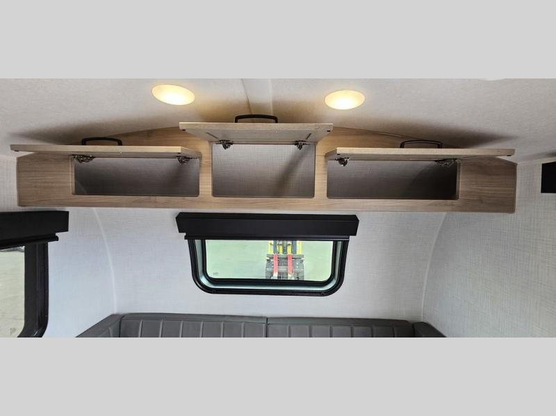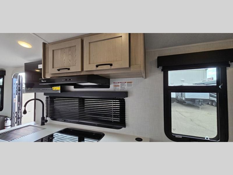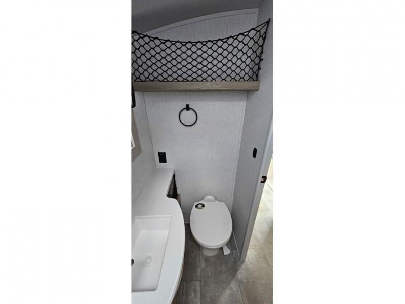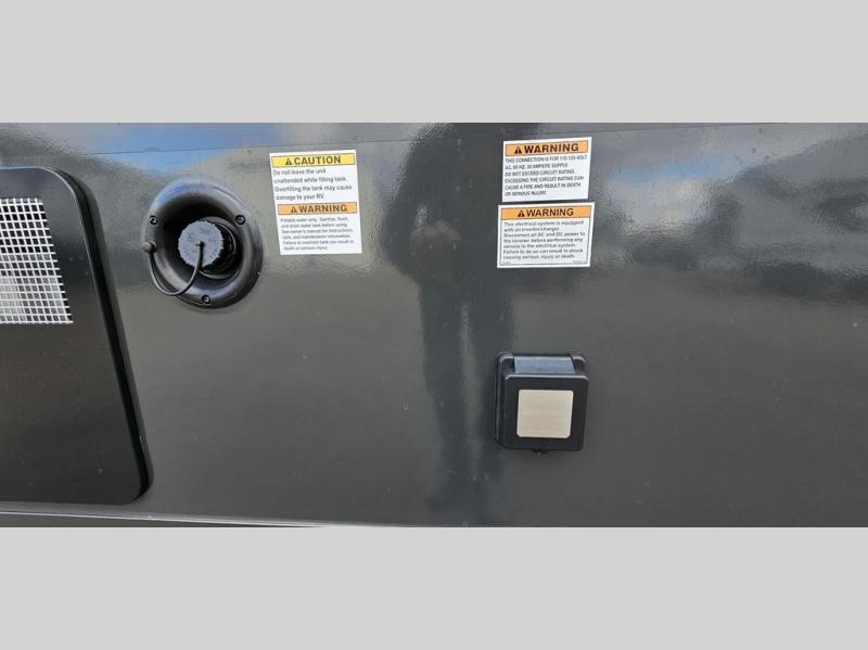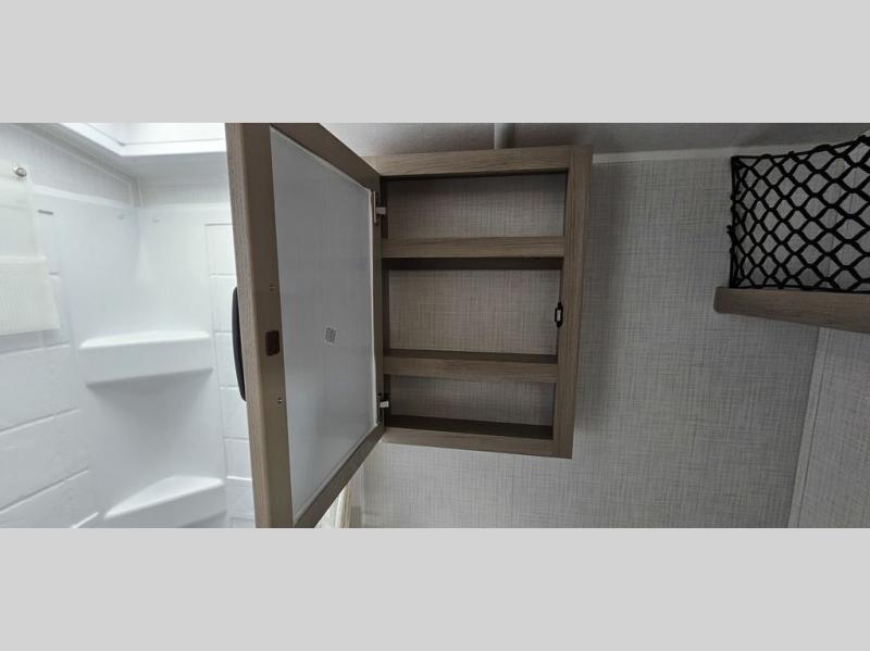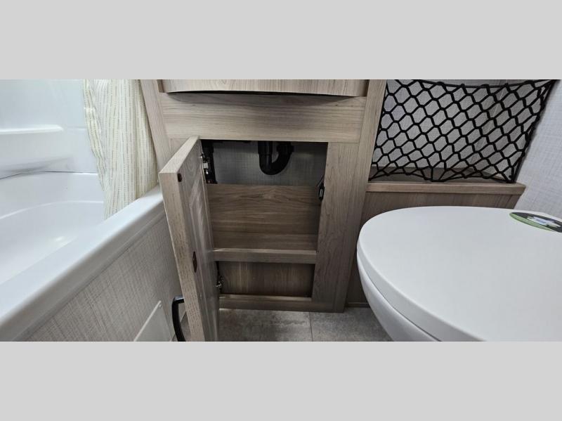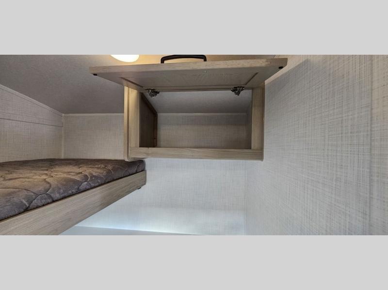Your small family will enjoy camping in this travel trailer! The 26" x 80" flip-up bunk provides a comfortable place to sleep above the 54" x 74" full bed, as well as the front 54" x 81" U-shaped dinette once converted. You even have a 32" TV nearby to watch your favorite movies. Freshen up in the full bathroom each morning and warm up a cinnamon roll in the microwave or grab some eggs from the 12V refrigerator then fry them up on the recessed three burner cooktop. There is also an outside griddle underneath the 15' power awning, and the pass-thru storage will be perfect for fishing poles!