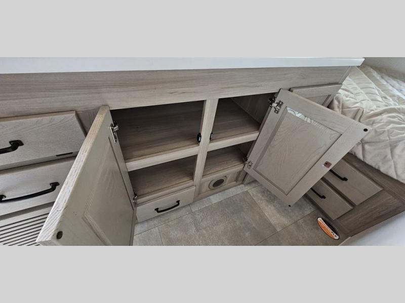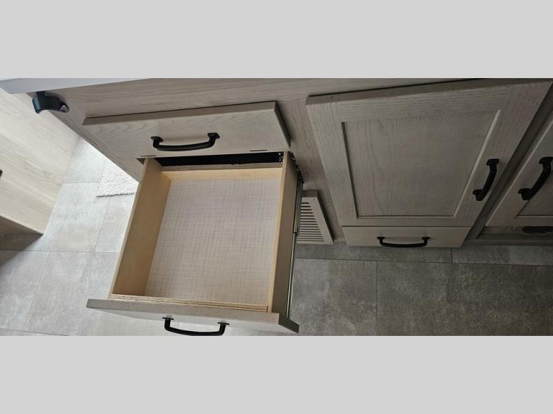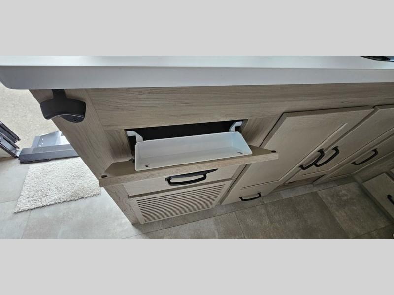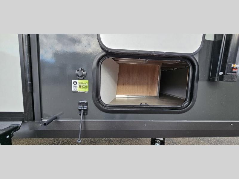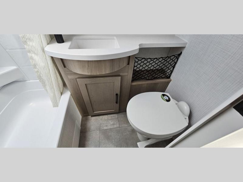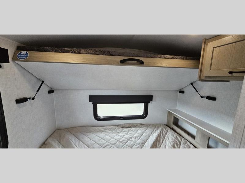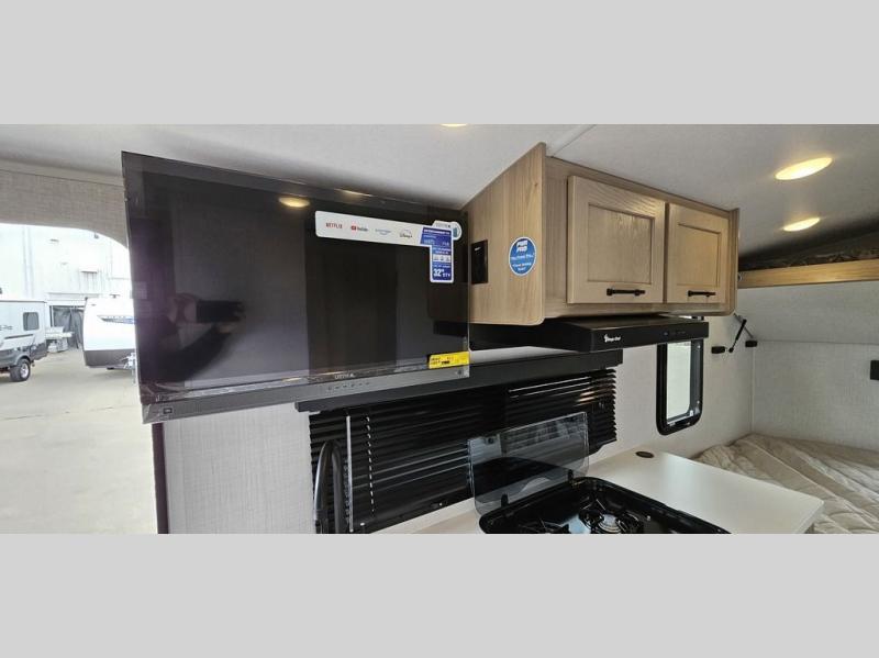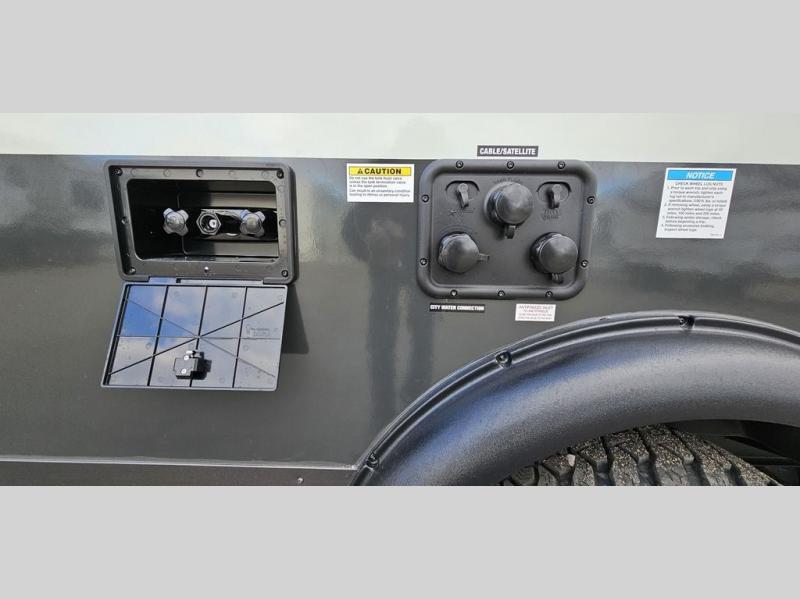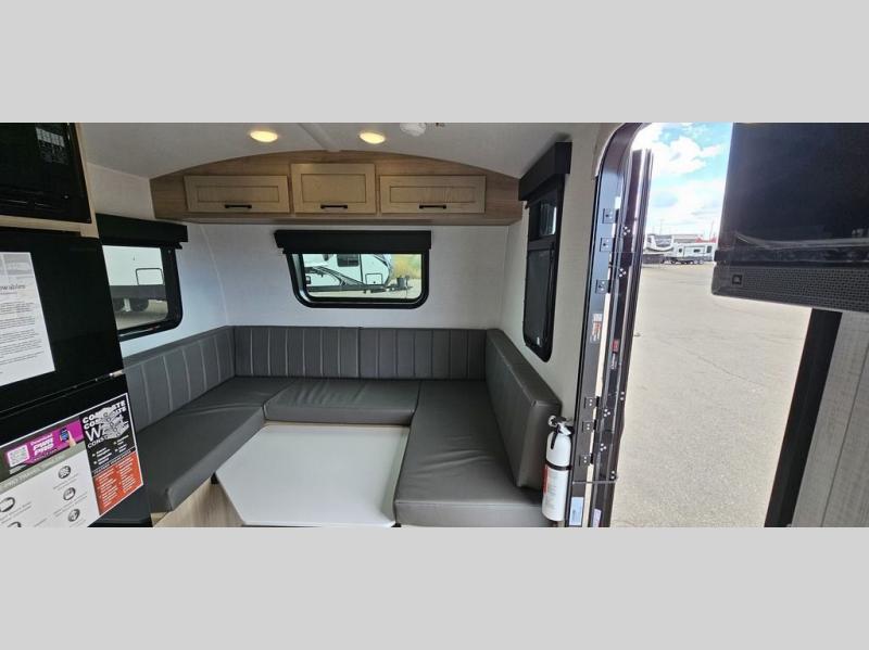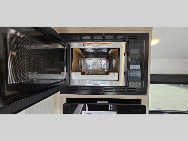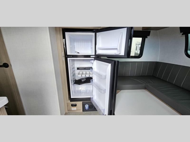 Your small family will enjoy camping in this travel trailer! The 26" x 80" flip-up bunk provides a comfortable place to sleep above the 54" x 74" full bed, as well as the front 54" x 81" U-shaped dinette once converted. You even have a 32" TV nearby to watch your favorite movies. Freshen up in the full bathroom each morning and warm up a cinnamon roll in the microwave or grab some eggs from the 12V refrigerator then fry them up on the recessed three burner cooktop. There is also an outside griddle underneath the 15' power awning, and the pass-thru storage will be perfect for fishing poles!
