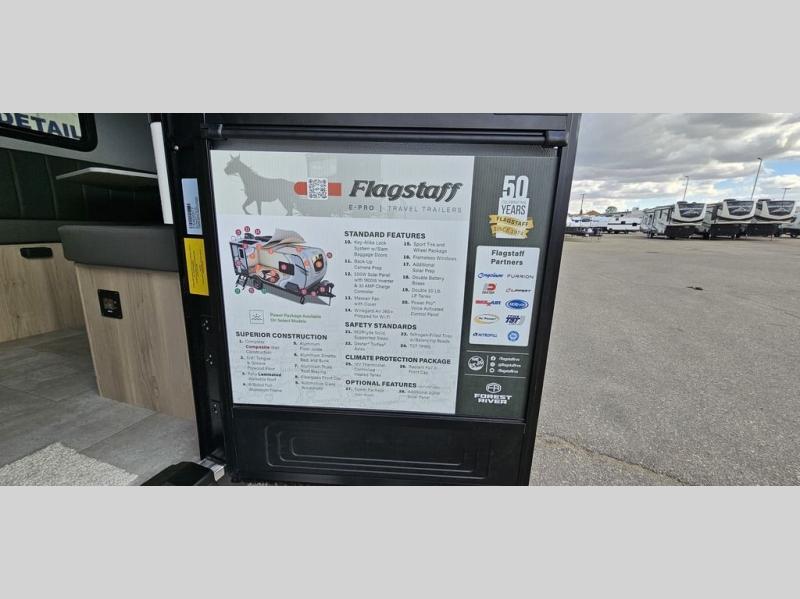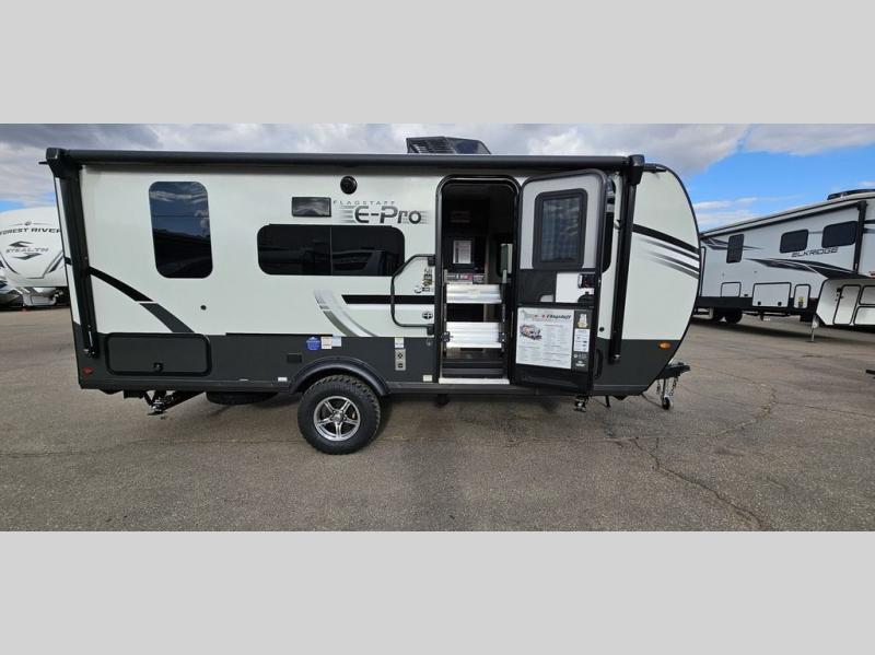 With any Flagstaff E-Pro travel trailer by Forest River, you will experience lightweight towing, style and features that will meet your needs, plus amenities that give you more than you expected! Built with interior and exterior composite sidewall construction, tongue and grove plywood flooring, and a vacuum laminated roof and walls, plus torsion axle, Rubber-Ryde suspension, and a tire pressure monitoring system for safety while traveling. And the 200 watt roof mount solar panel with 1,800-watt inverter will allow you to stay off-grid if you like. The interior offers a comfortable environment with the choice to use the air conditioner or furnace, and a 12V entertainment TV with a stereo to stay up to date on your favorite movies. Make your selection today!
