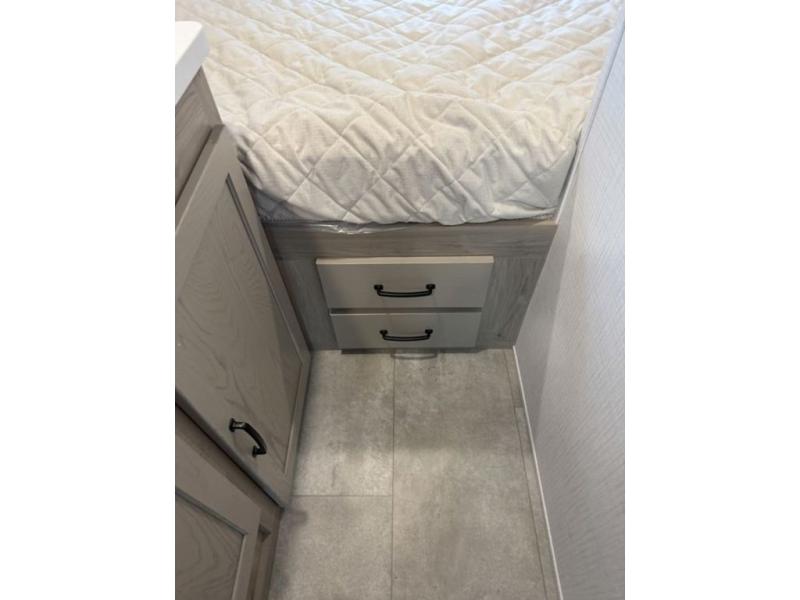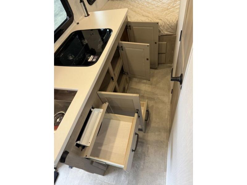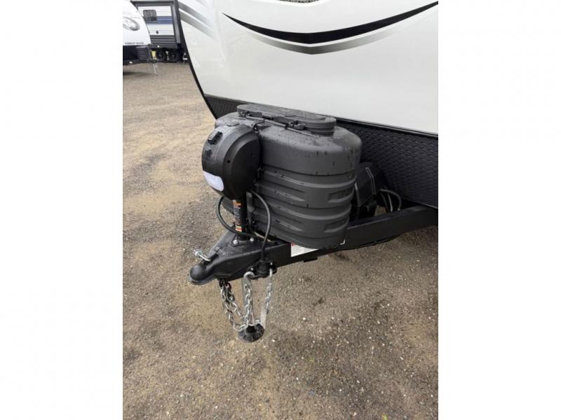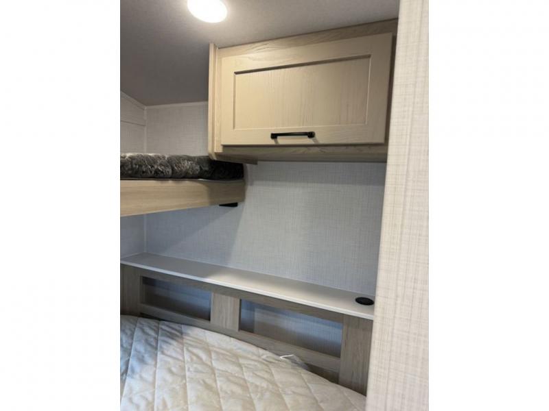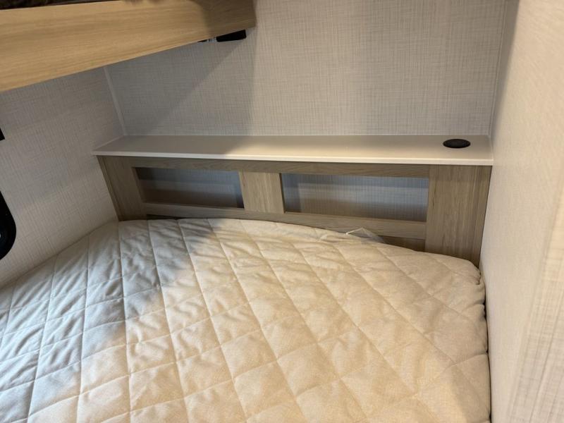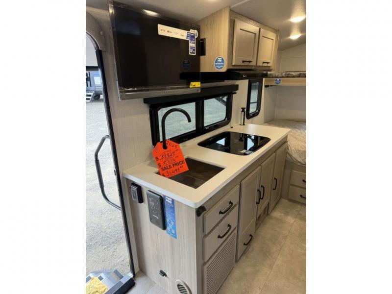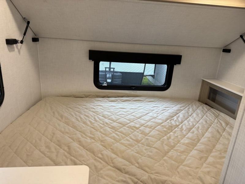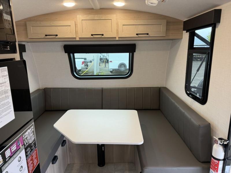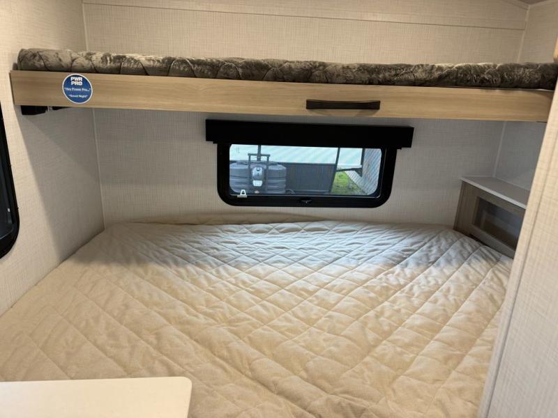Your small family will enjoy camping in this travel trailer! The 26" x 80" flip-up bunk provides a comfortable place to sleep above the 54" x 74" full bed, as well as the front 54" x 81" U-shaped dinette once converted. You even have a 32" TV nearby to watch your favorite movies. Freshen up in the full bathroom each morning and warm up a cinnamon roll in the microwave or grab some eggs from the 12V refrigerator then fry them up on the recessed three burner cooktop. There is also an outside griddle underneath the 15' power awning, and the pass-thru storage will be perfect for fishing poles!