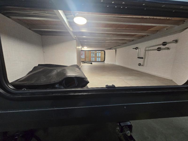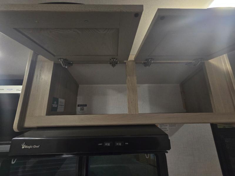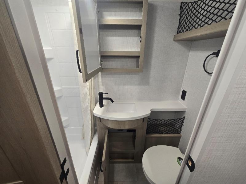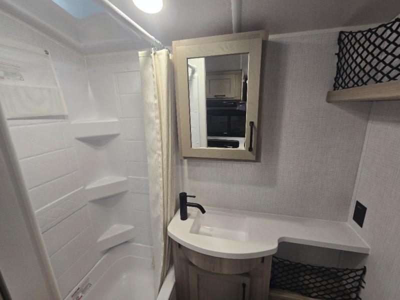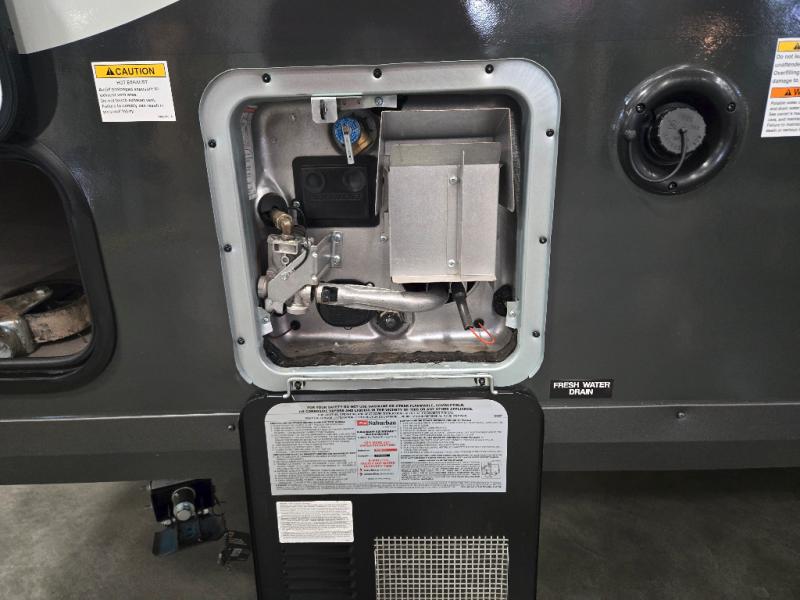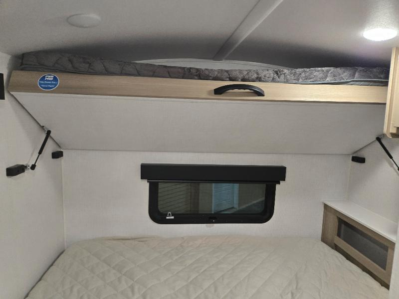 Your small family will enjoy camping in this travel trailer! The 26" x 80" flip-up bunk provides a comfortable place to sleep above the 54" x 74" full bed, as well as the front 54" x 81" U-shaped dinette once converted. You even have a 32" TV nearby to watch your favorite movies. Freshen up in the full bathroom each morning and warm up a cinnamon roll in the microwave or grab some eggs from the 12V refrigerator then fry them up on the recessed three burner cooktop. There is also an outside griddle underneath the 15' power awning, and the pass-thru storage will be perfect for fishing poles!
