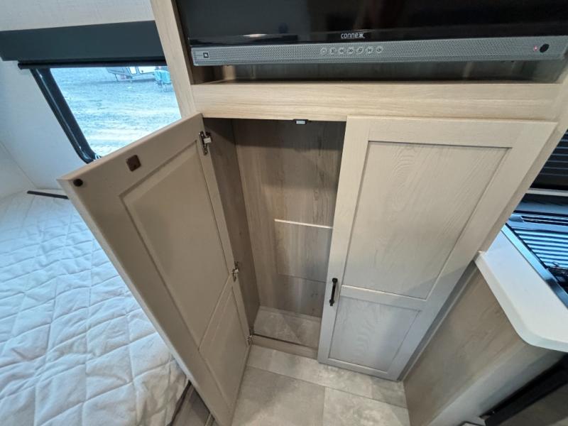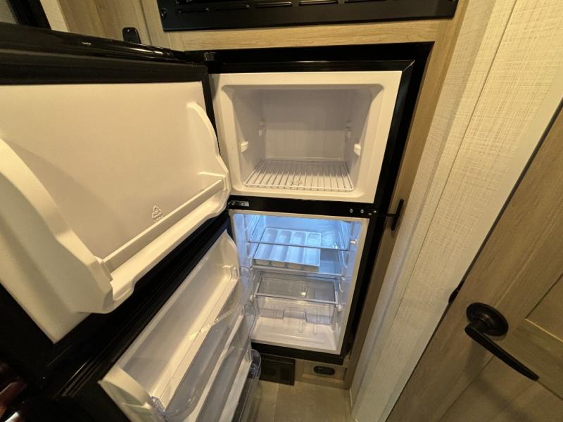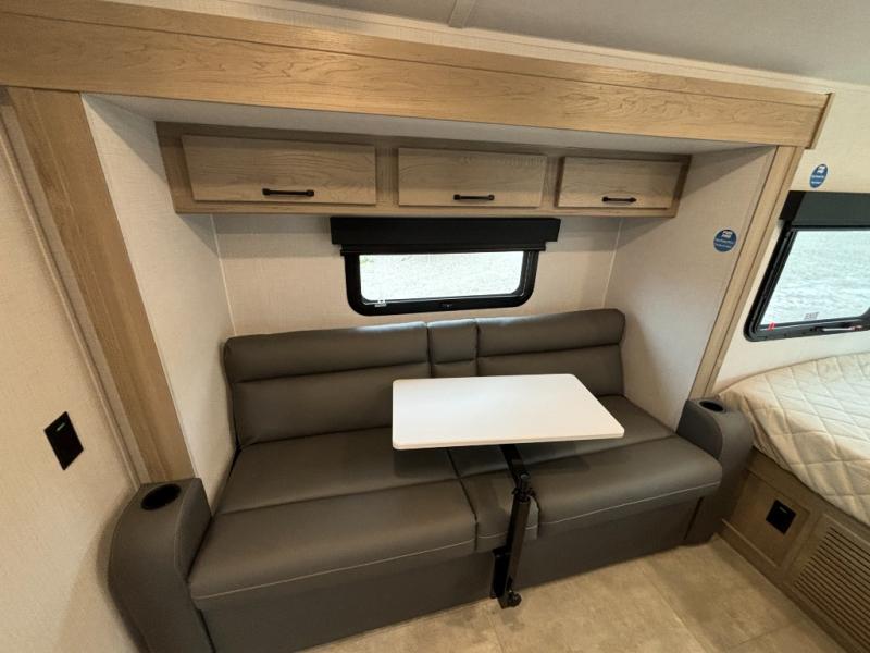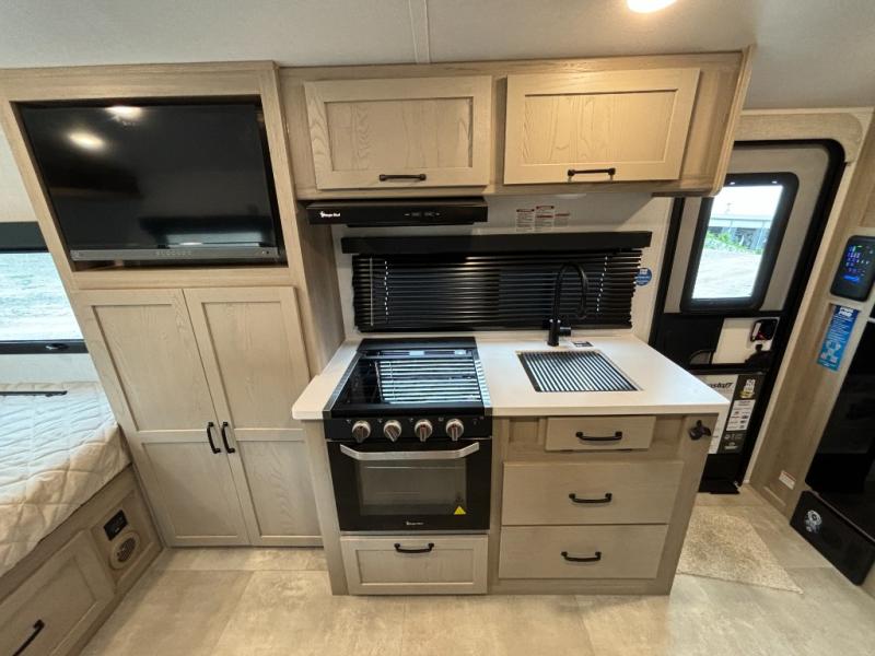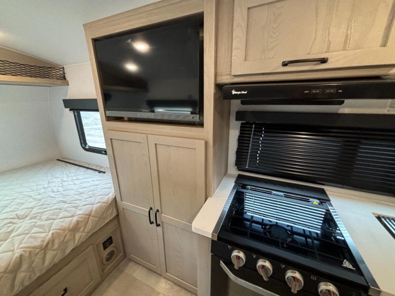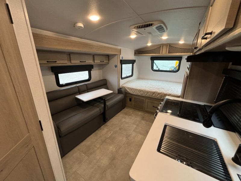 This can be the perfect couples trailer for you or your own RV with more floor space to move around thanks to the slide out sofa with a table which offers sleeping space for friends. You will have a queen bed to lay your head up front, and everyone can watch the 32" TV. The wardrobe and overhead cabinets give you clothing storage, and the kitchen cooktop and microwave allow the cook to make warm meals. And the 12V refrigerator is conveniently next to the entry so you can grab a drink on your way out to relax under the 11' power awning.