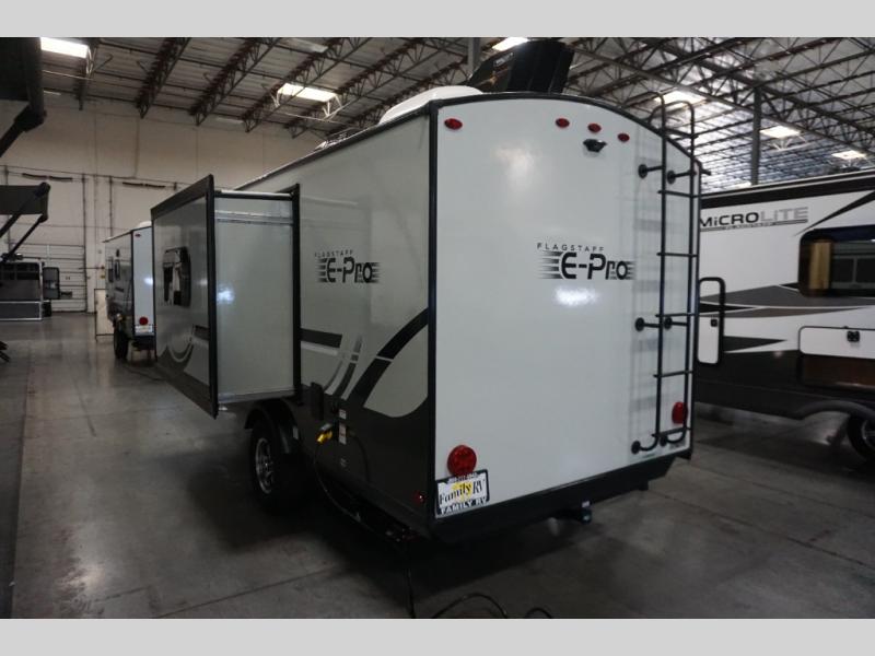 With any Flagstaff E-Pro travel trailer by Forest River, you will experience lightweight towing, style and features that will meet your needs, plus amenities that give you more than you expected! Built with interior and exterior composite sidewall construction, tongue and grove plywood flooring, and a vacuum laminated roof and walls, plus torsion axle, Rubber-Ryde suspension, and a tire pressure monitoring system for safety while traveling. And the 200 watt roof mount solar panel with 1,800-watt inverter will allow you to stay off-grid if you like. The interior offers a comfortable environment with the choice to use the air conditioner or furnace, and a 12V entertainment TV with stereo to stay up to date on your favorite movies. Make your selection today!