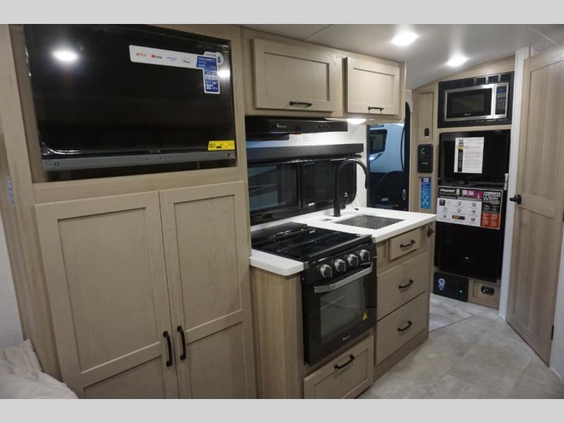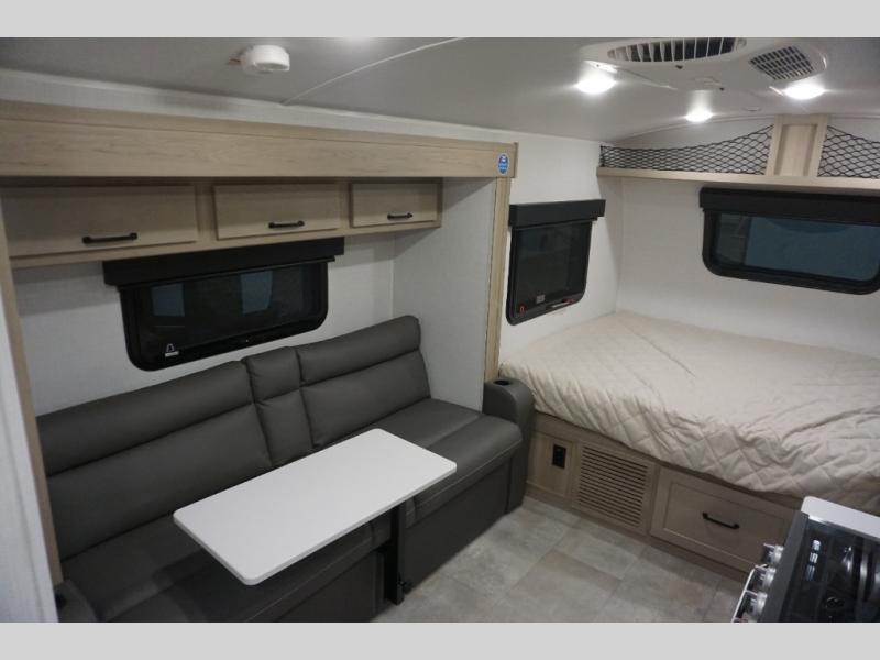 This can be the perfect couples trailer for you or your own RV with more floor space to move around thanks to the slide out sofa with a table which offers sleeping space for friends. You will have a queen bed to lay your head up front, and everyone can watch the 32" TV. The wardrobe and overhead cabinets give you clothing storage, and the kitchen cooktop and microwave allow the cook to make warm meals. And the 12V refrigerator is conveniently next to the entry so you can grab a drink on your way out to relax under the 11' power awning.