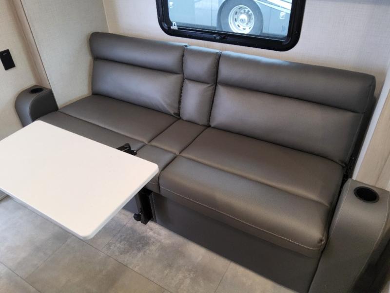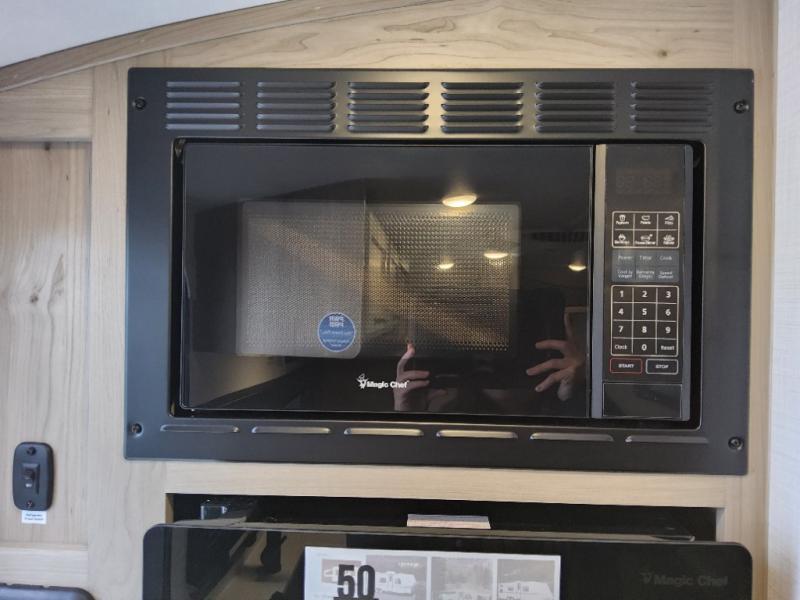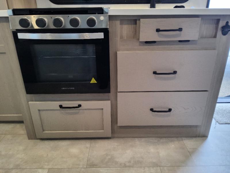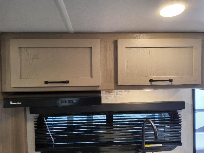 This can be the perfect couples trailer for you or your own RV with more floor space to move around thanks to the slide out sofa with a 30" x 15" table which offers sleeping space for friends. You will have a queen bed to lay your head up front, and everyone can watch the 32" TV. The wardrobe and overhead cabinets give you clothing storage, and the kitchen cooktop and microwave allow the cook to make warm meals. And the 12V refrigerator is conveniently next to the entry so you can grab a drink on your way out to relax under the 11' power awning.