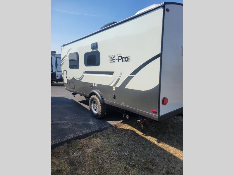 With any Flagstaff E-Pro travel trailer by Forest River, you will experience lightweight towing, style and features that will meet your needs, plus amenities that give you more than you expected! Built with interior and exterior composite sidewall construction, tongue and grove plywood flooring, and a vacuum laminated roof and walls, plus torsion axle, Rubber-Ryde suspension, and a tire pressure monitoring system for safety while traveling. And the 200 watt roof mount solar panel with 1,800-watt inverter will allow you to stay off-grid if you like. The interior offers a comfortable environment with the choice to use the air conditioner or furnace, and a 12V entertainment TV with a stereo to stay up to date on your favorite movies. Make your selection today!