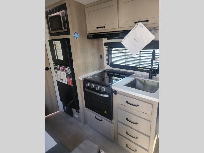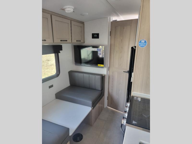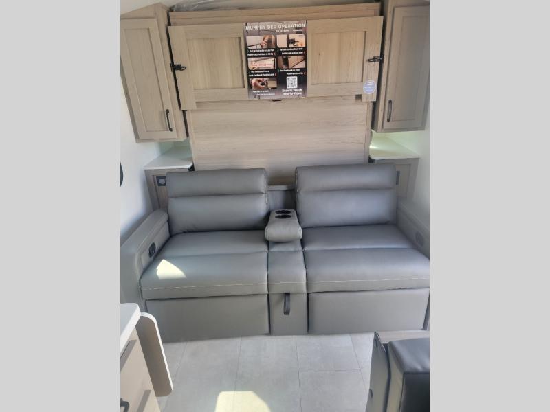 Whether you enjoy staying at the campground for a weekend or longer and/or you enjoy off-grid camping, this 20' 2" long trailer gives you lots of interior space and versatility to enjoy each and every trip. From the Murphy bed/sofa combo up front offering sleeping space and seating depending on which you prefer at the time, to the full rear bathroom which also offers overhead storage, you will have everything you need. And the kitchen cooktop, microwave and 12V refrigerator allow you to make meals and store leftovers. Two can dine at the booth dinette or you can eat outdoors under the 14' power awning.