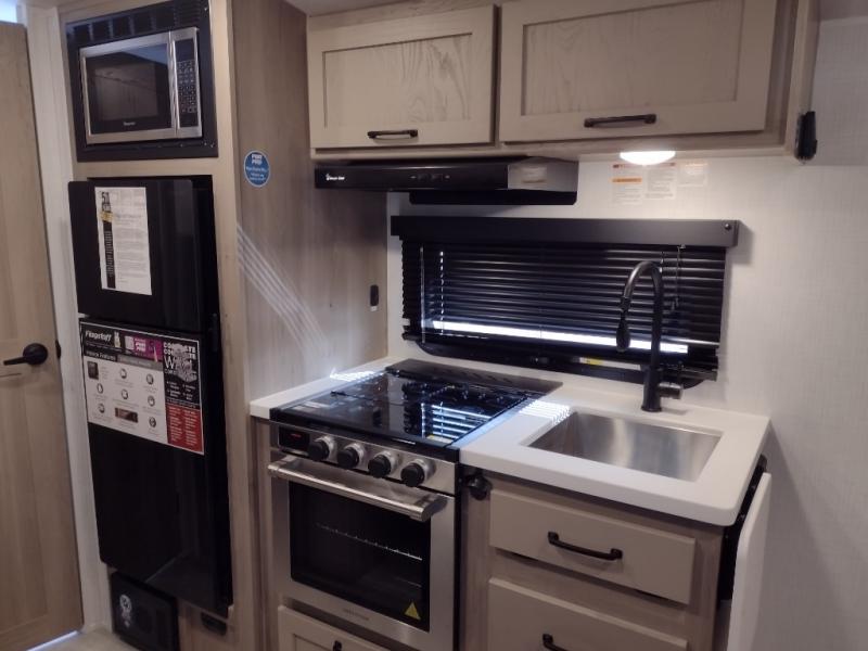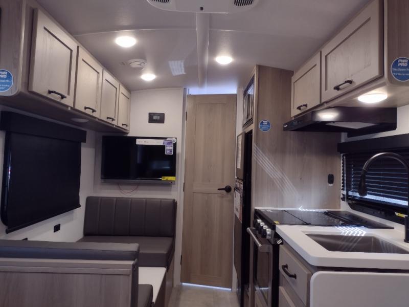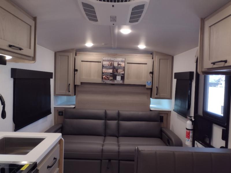 Whether you enjoy staying at the campground for a weekend or longer and/or you enjoy off-grid camping, this 20' 2" long trailer gives you lots of interior space and versatility to enjoy each and every trip. From the Murphy bed/sofa combo up front offering sleeping space and seating depending on which you prefer at the time, to the full rear bathroom which also offers overhead storage, you will have everything you need. And the kitchen cooktop, microwave and 12V refrigerator allow you to make meals and store leftovers. Two can dine at the booth dinette or you can eat outdoors under the 14' power awning.