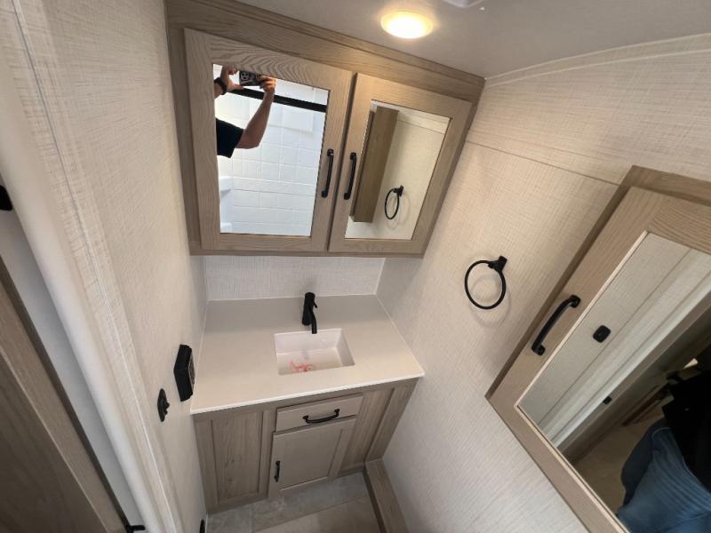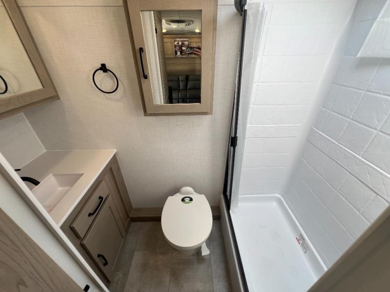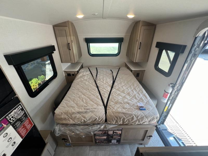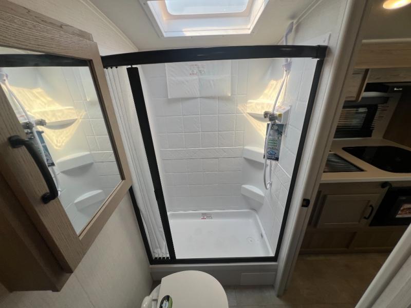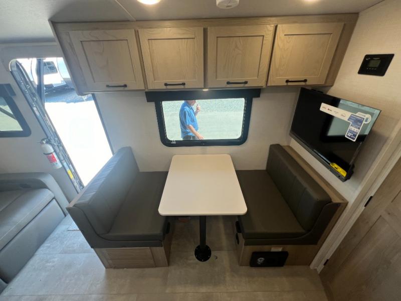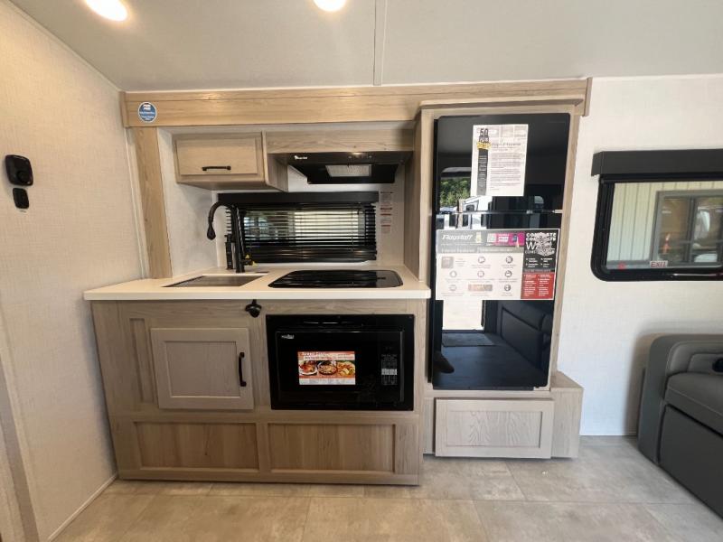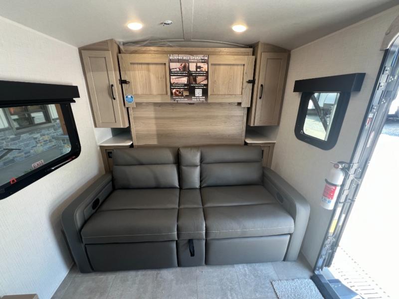 Camp with your favorite person in this trailer with the versatile Murphy bed/sofa combo up front giving you both a living area and a bedroom when you so choose. If you need sleeping space for one more, the dinette will provide that once easily setup. The large window gives you great views while dining or playing games. There is extra floor space in this trailer with the kitchen slide out that offers full amenities plus a sink to keep everything clean. And the full-length rear bathroom offers a spacious area to change your clothes in privacy and get cleaned up in the large shower.