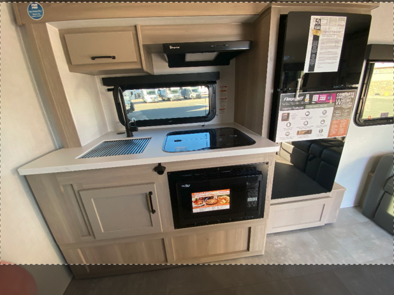 Camp with your favorite person in this trailer with the versatile Murphy bed/sofa combo up front giving you both a living area and a bedroom when you so choose. If you need sleeping space for one more, the dinette will provide that once easily setup. The large window gives you great views while dining or playing games. There is extra floor space in this trailer with the kitchen slide out that offers full amenities plus a sink to keep everything clean. And the full-length rear bathroom offers a spacious area to change your clothes in privacy and get cleaned up in the large shower.