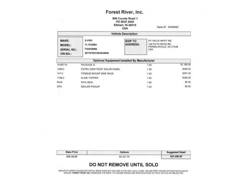 With any Flagstaff E-Pro travel trailer by Forest River, you will experience lightweight towing, style and features that will meet your needs, plus amenities that give you more than you expected! Built with interior and exterior composite sidewall construction, tongue and grove plywood flooring, and a vacuum laminated roof and walls, plus torsion axle, Rubber-Ryde suspension, and a tire pressure monitoring system for safety while traveling. And the 200 watt roof mount solar panel with 1,800-watt inverter will allow you to stay off-grid if you like. The interior offers a comfortable environment with the choice to use the air conditioner or furnace, and a 12V entertainment TV with a stereo to stay up to date on your favorite movies. Make your selection today!