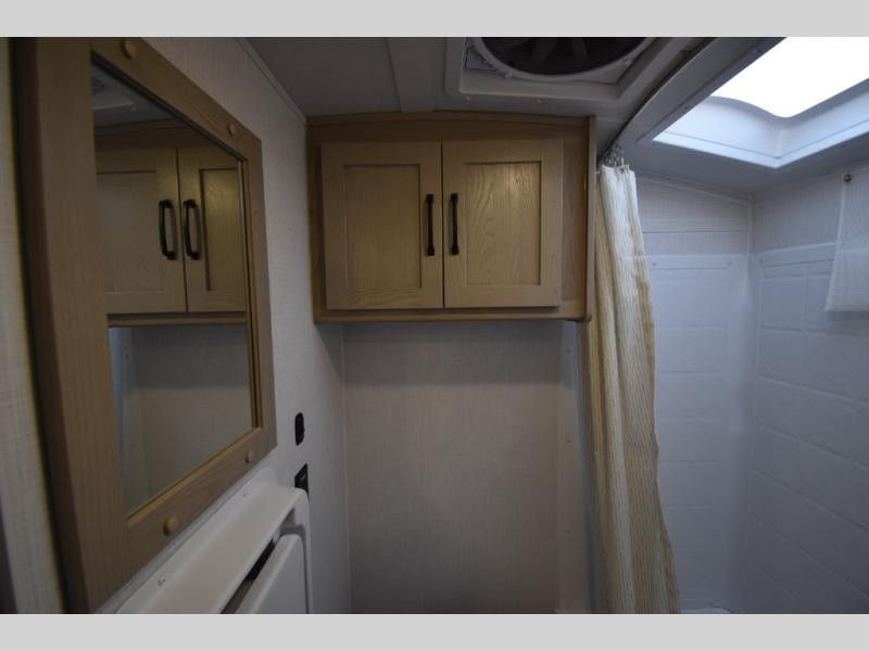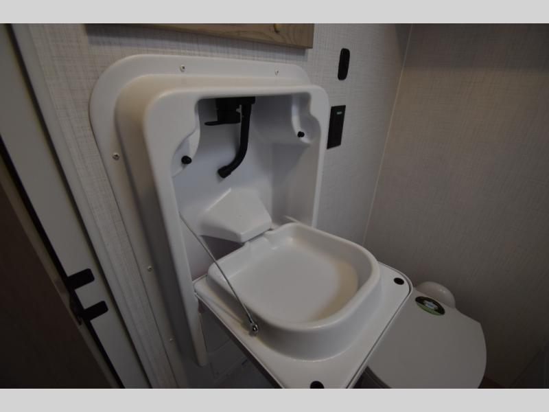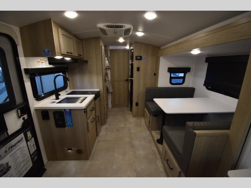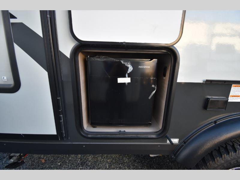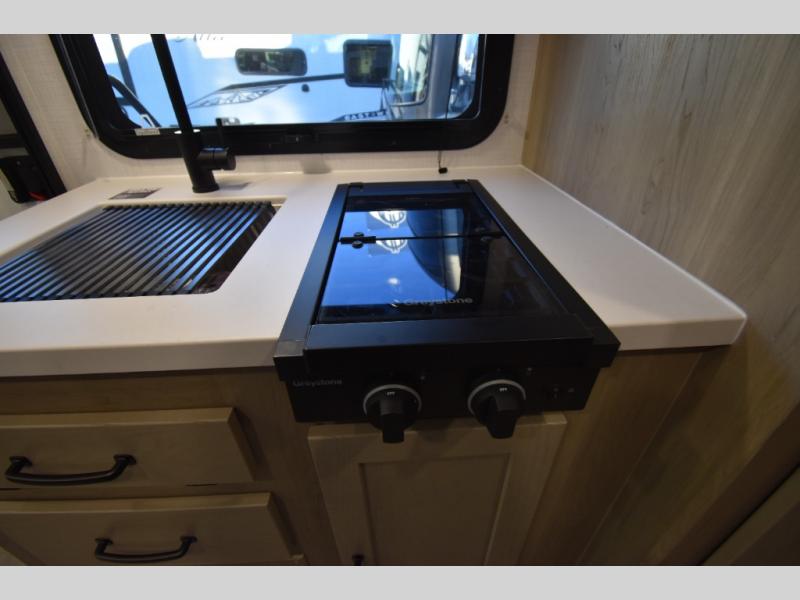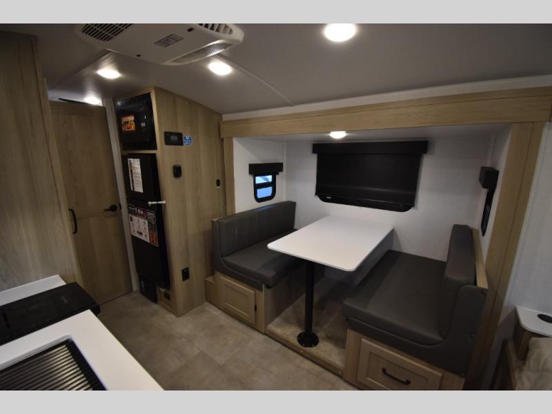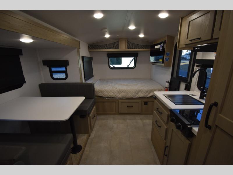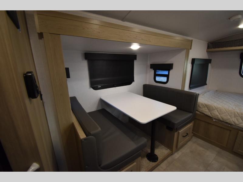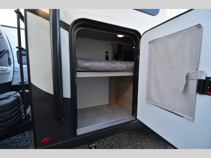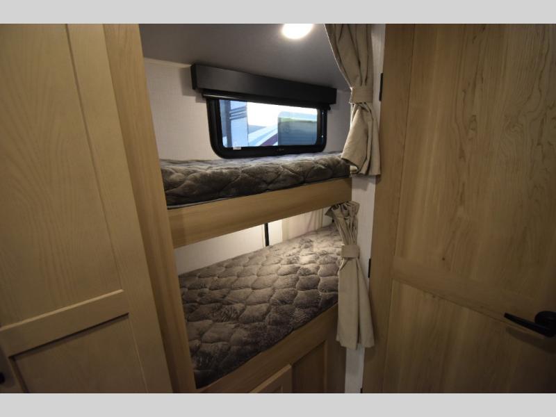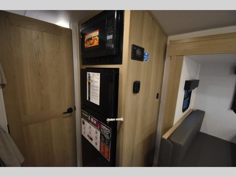 This spacious bunk trailer will work perfectly for a family or friend group that enjoys their own sleeping space, plus more floor space with the dinette slide out that can sleep one to two. The bottom bunk even flips up so you can stow away your bikes, totes and such through the bike door for secure travels. There is exterior storage for more outdoor gear, and interior storage found throughout. The cook will love having a pantry and overhead cabinets for snacks, canned goods, dishes and more. After making a warm meal, the 12V refrigerator can hold the leftovers. There is also a flip-down lavy sink in the full bath for added space when not in use!