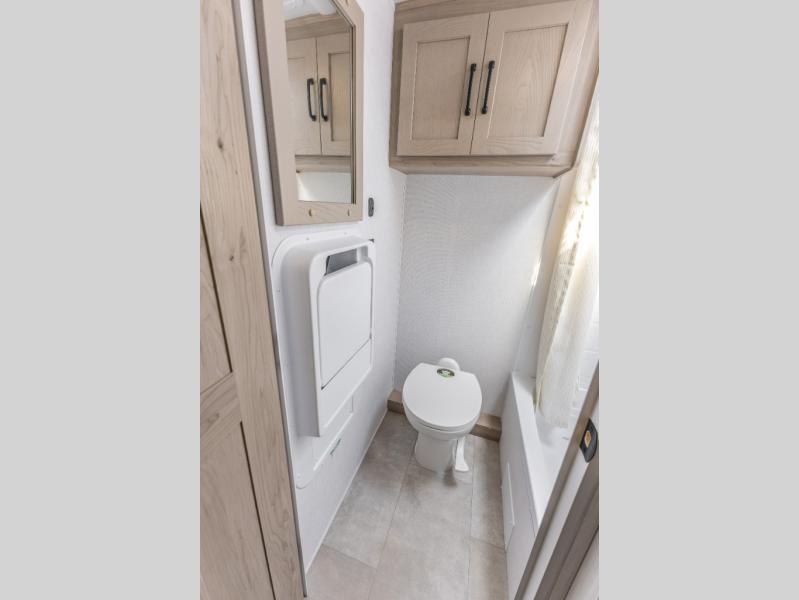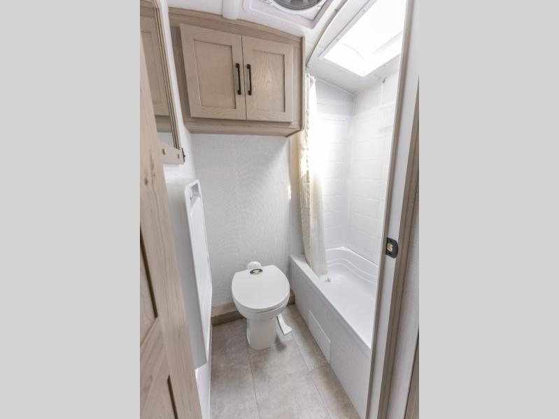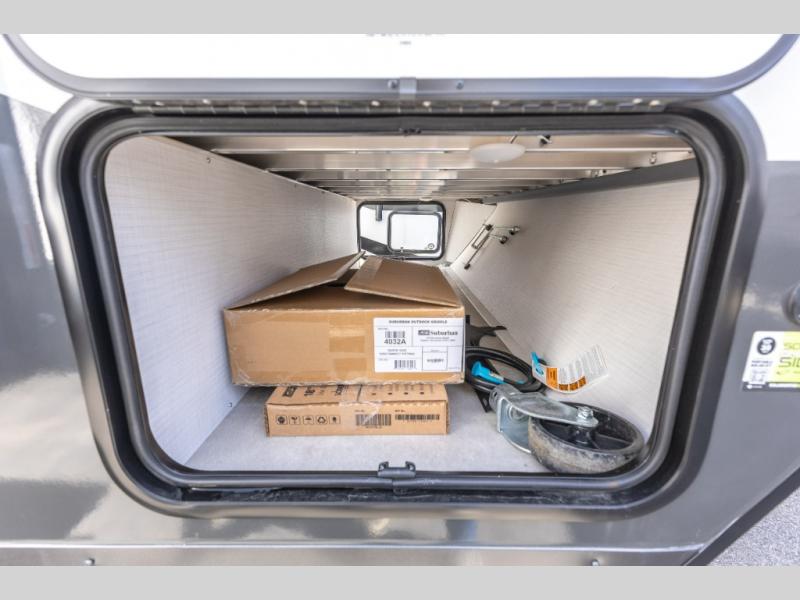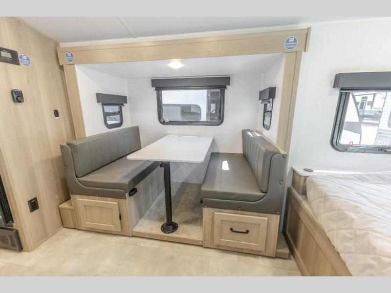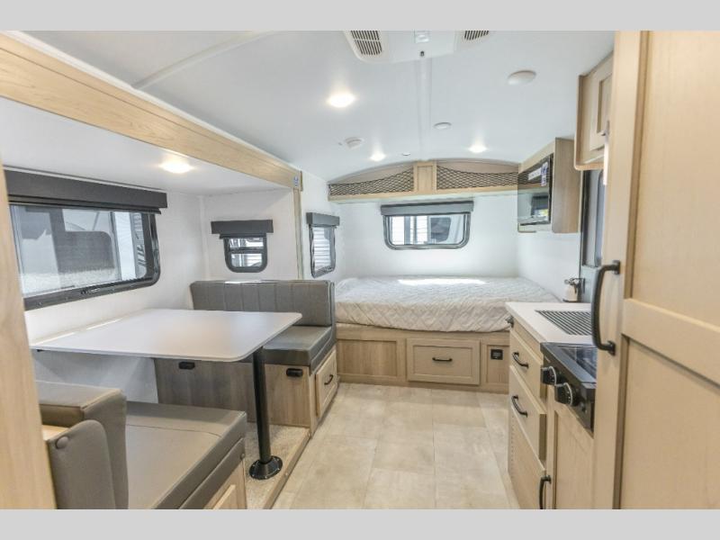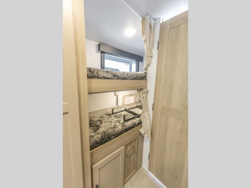 This spacious bunk trailer will work perfectly for a family or friend group that enjoys their own sleeping space, plus more floor space with the dinette slide out that can sleep one to two. The bottom bunk even flips up so you can stow away your bikes, totes and such through the bike door for secure travels. There is exterior storage for more outdoor gear, and interior storage found throughout. The cook will love having a pantry and overhead cabinets for snacks, canned goods, dishes and more. After making a warm meal, the 12V refrigerator can hold the leftovers. There is also a flip-down lavy sink in the full bath for added space when not in use!